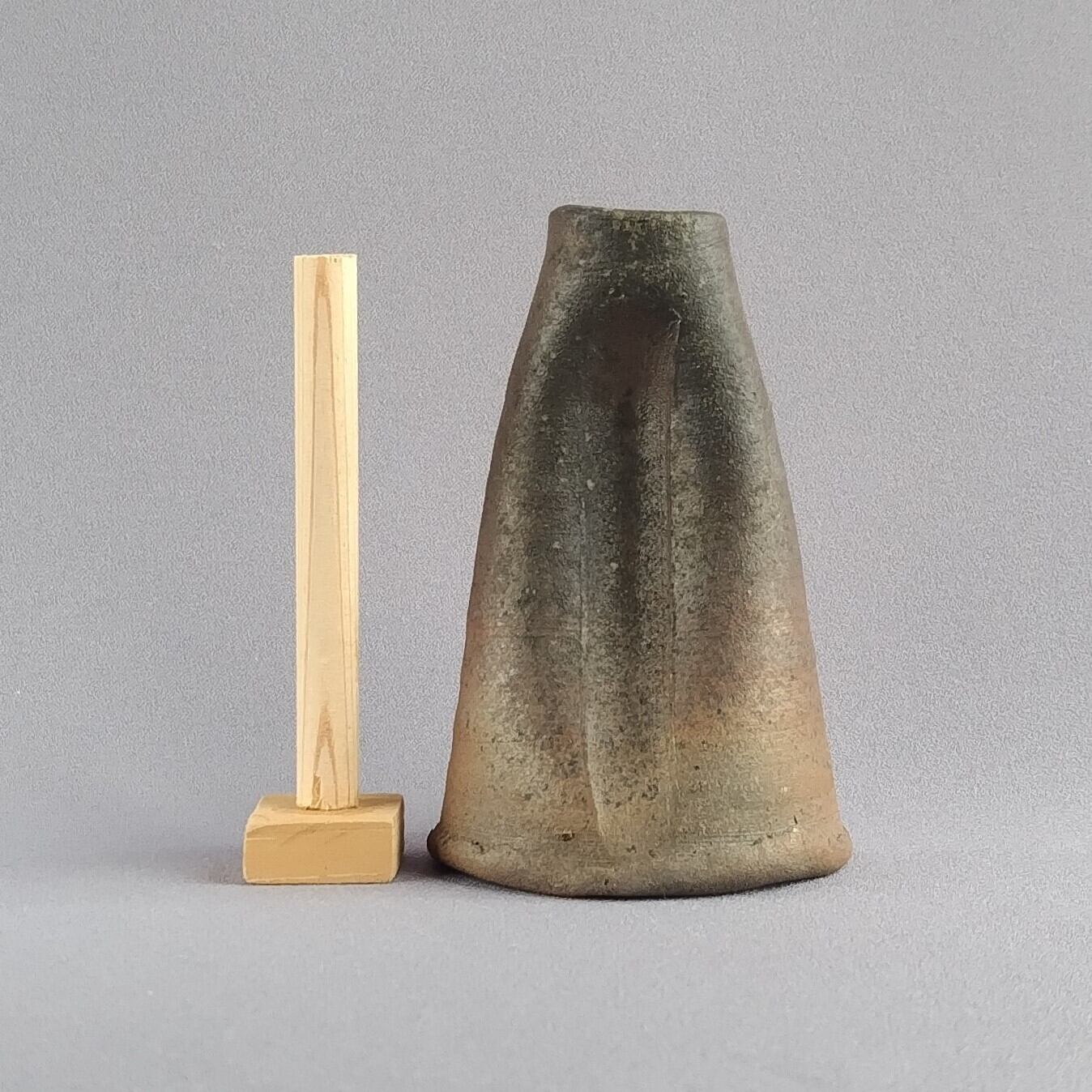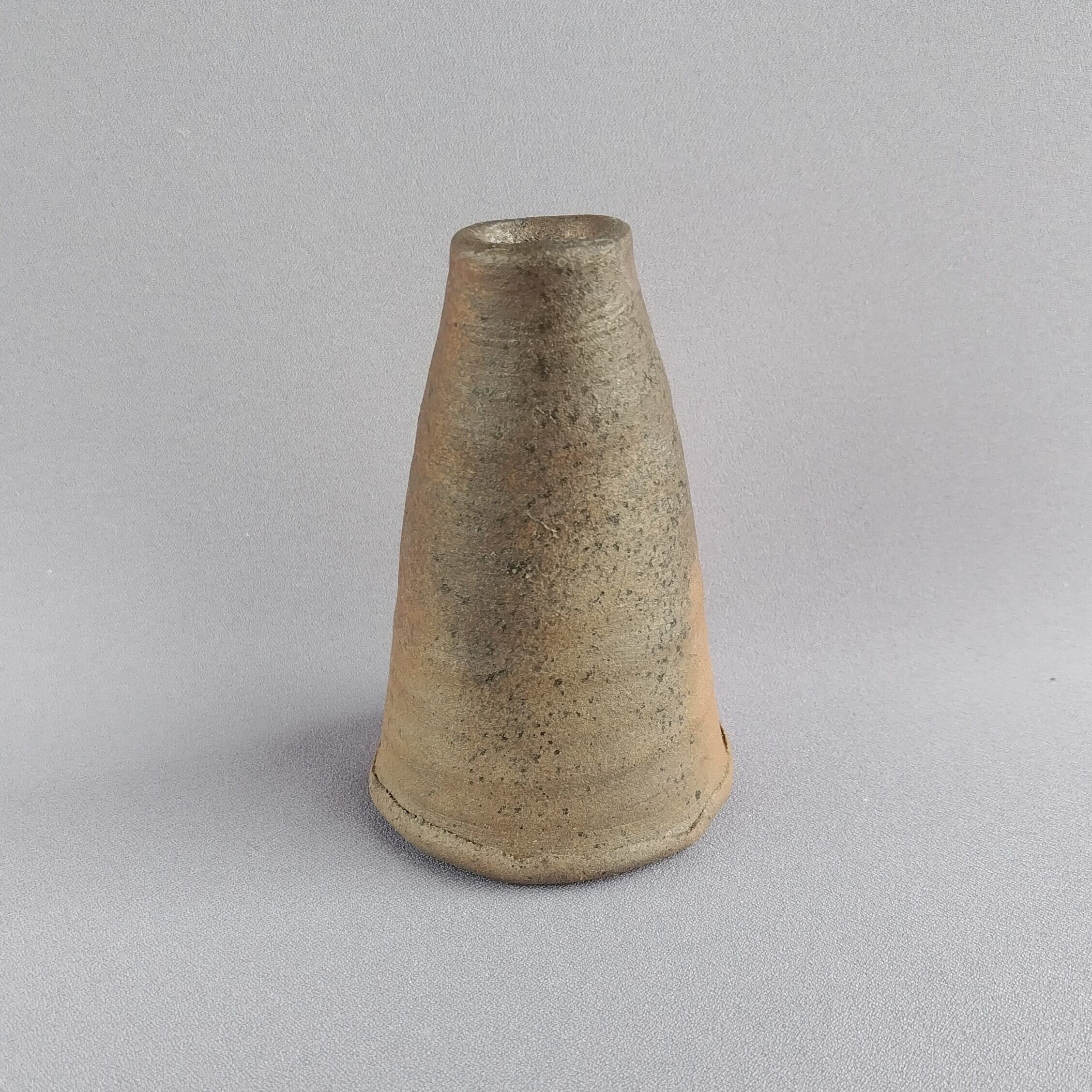 指でくぼみがつけられた、おもしろい形の焼締めの花入れです。