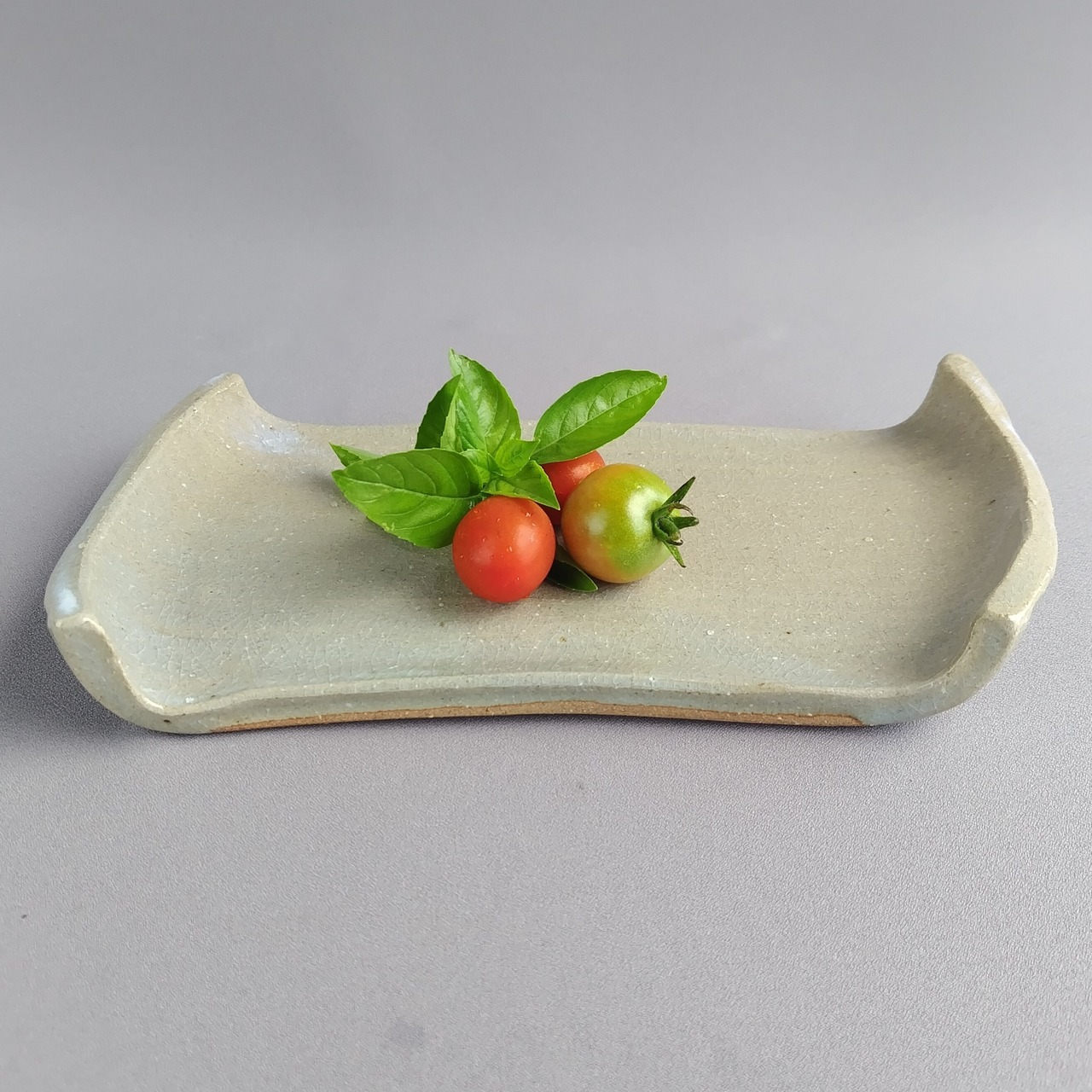 筒を一度ろくろで引き、縦に切って開いてあるため、ろくろ目の模様が出ています。