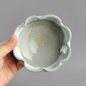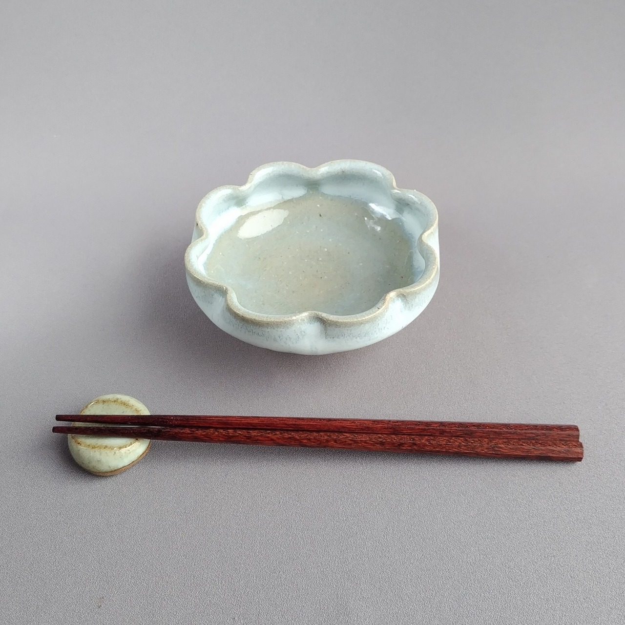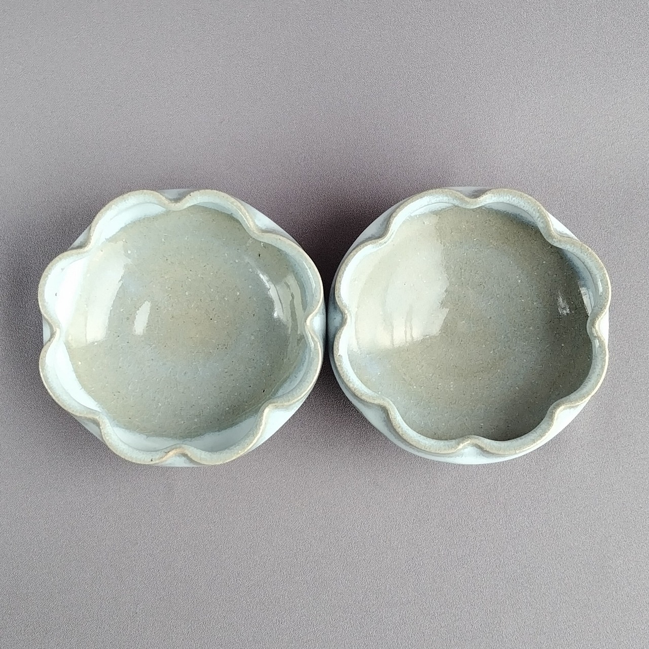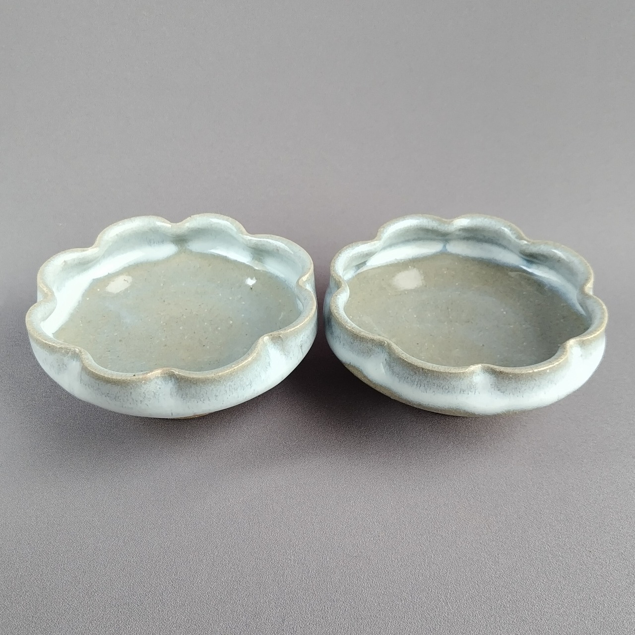 透明釉の縁に白萩釉がかけられたペアの花形小鉢です。