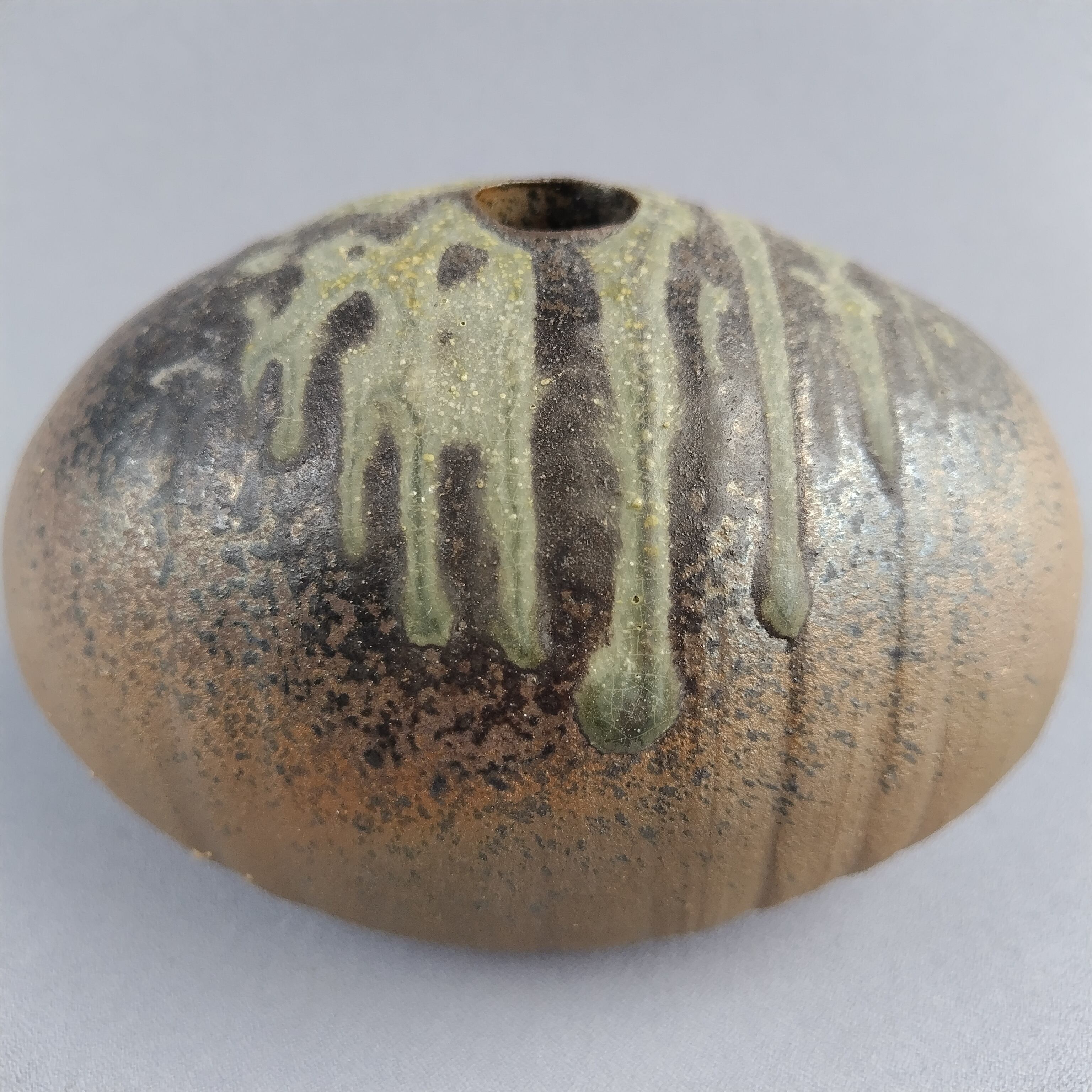 俵型のかわいらしい焼締めの花入れです。