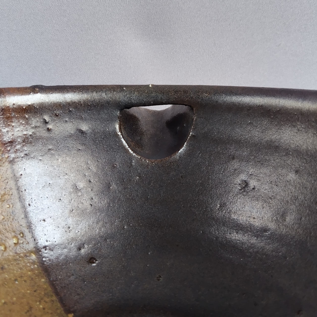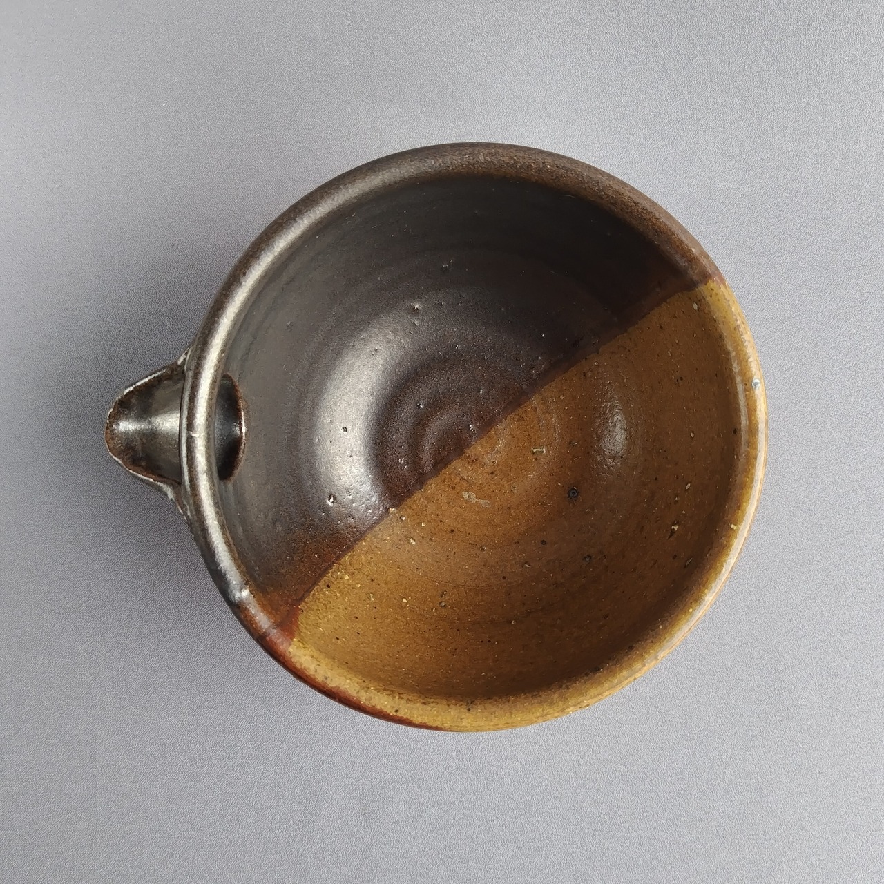 黒マット釉と伊羅保釉が半分ずつ掛け分けられています。
