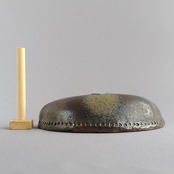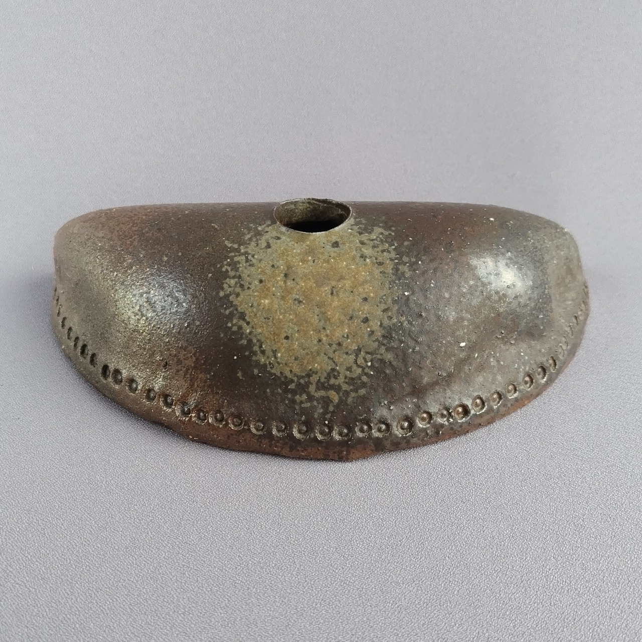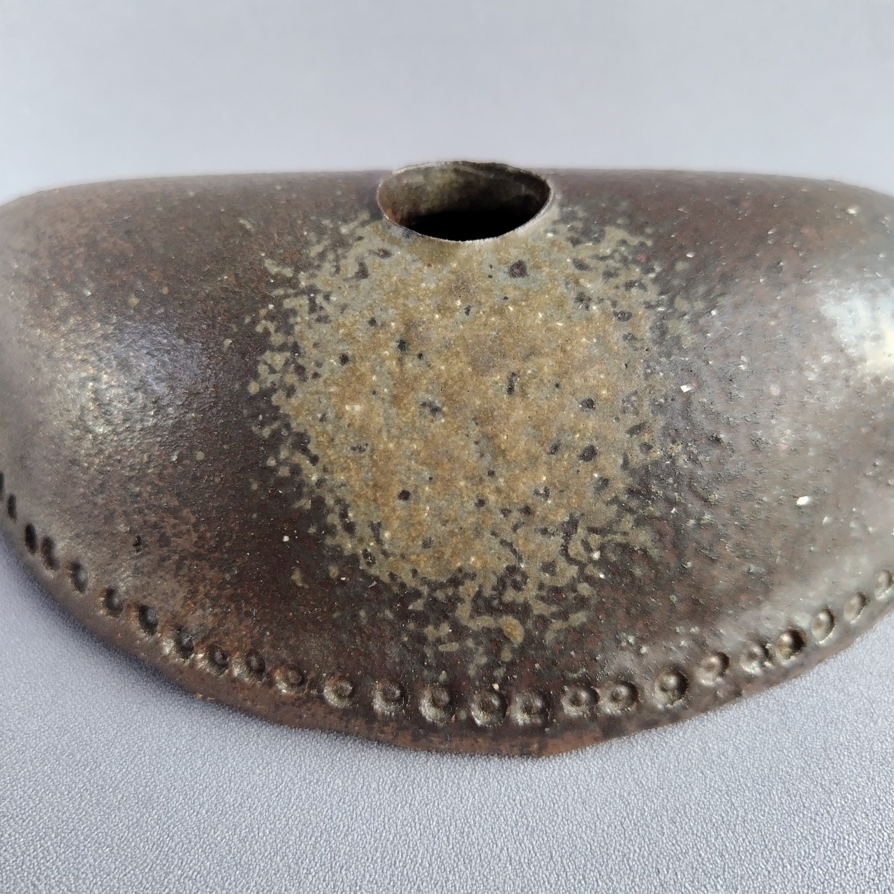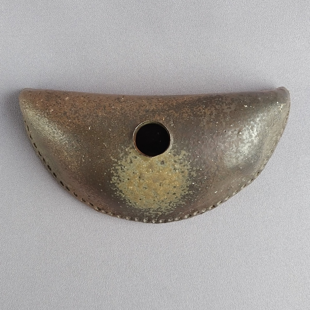 半月型の焼締めの花入れです。縁に革細工のような細工が施されています。