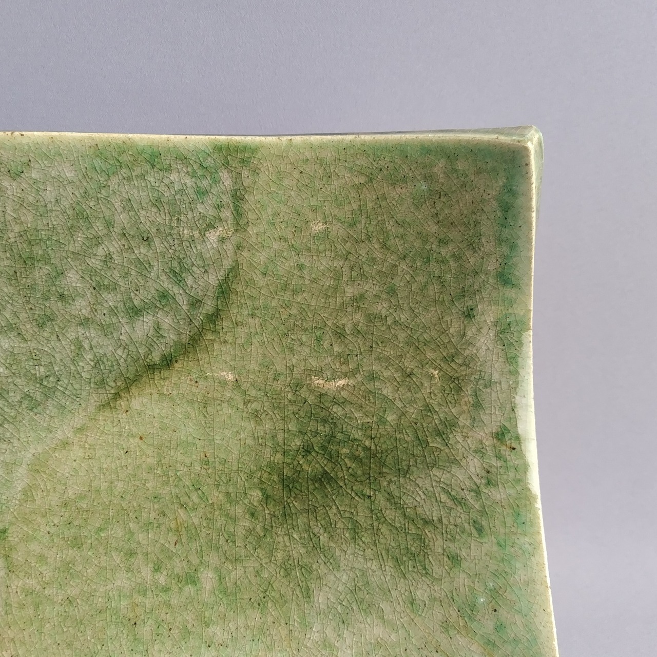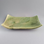 全体にビードロ釉が掛けられた四点足の角皿です。