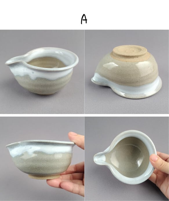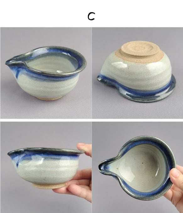 Aは透明釉の縁に白萩釉、Bは全体に緑釉、Cは透明釉の縁に藍釉が掛けられています。