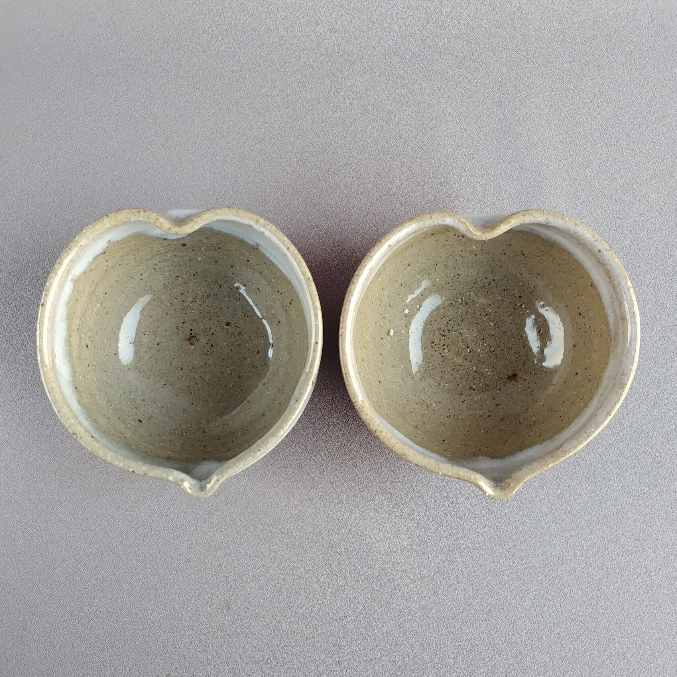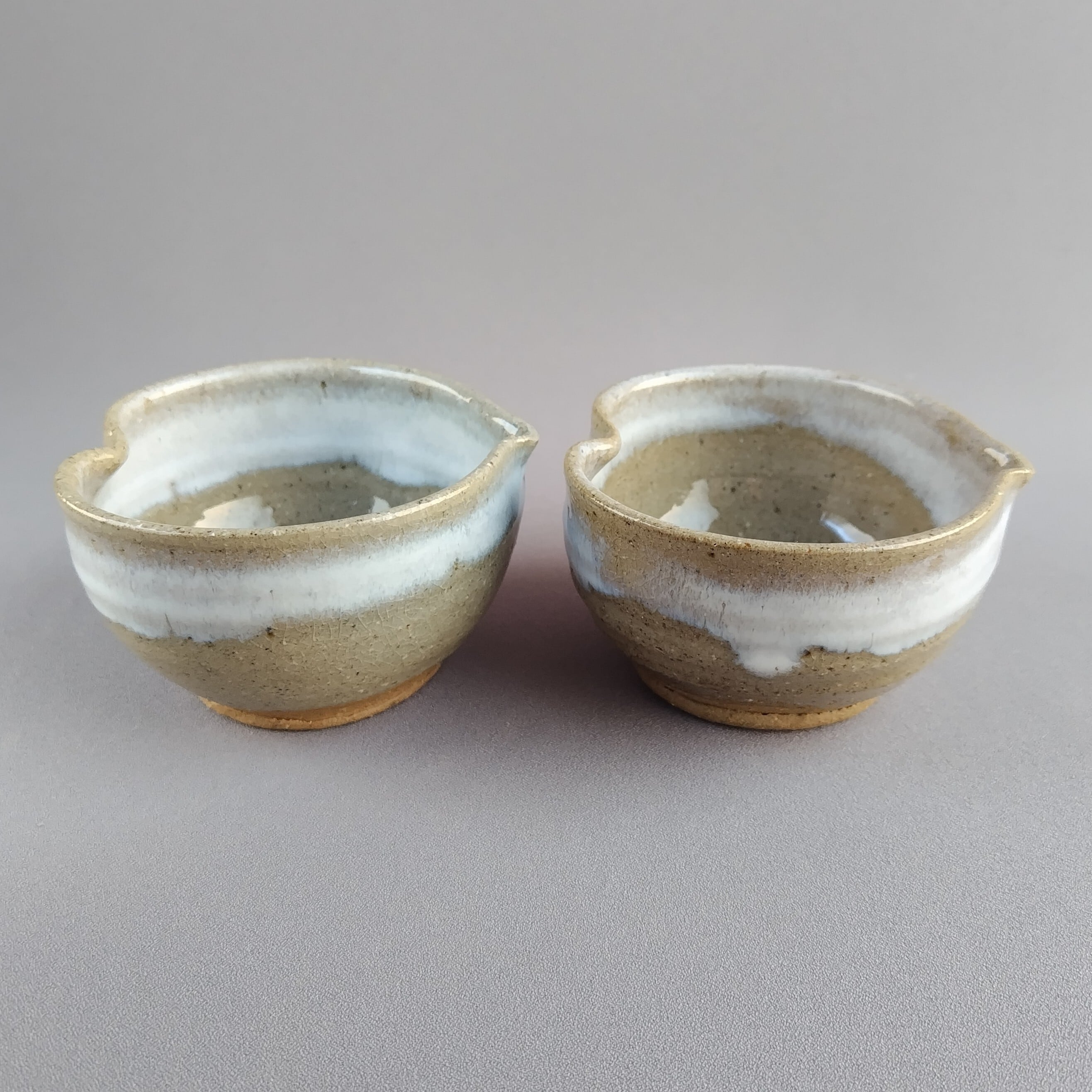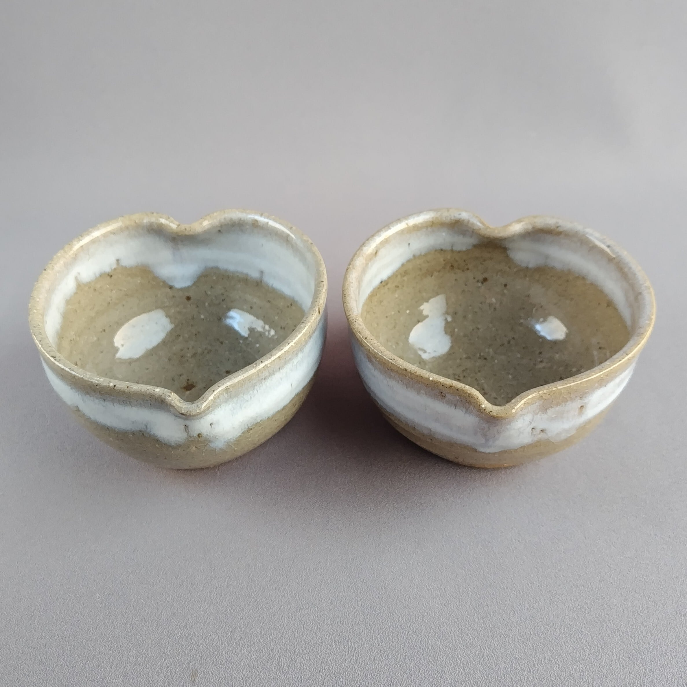 透明釉の縁に白萩釉がかけられた、ペアの片口型の小鉢です。