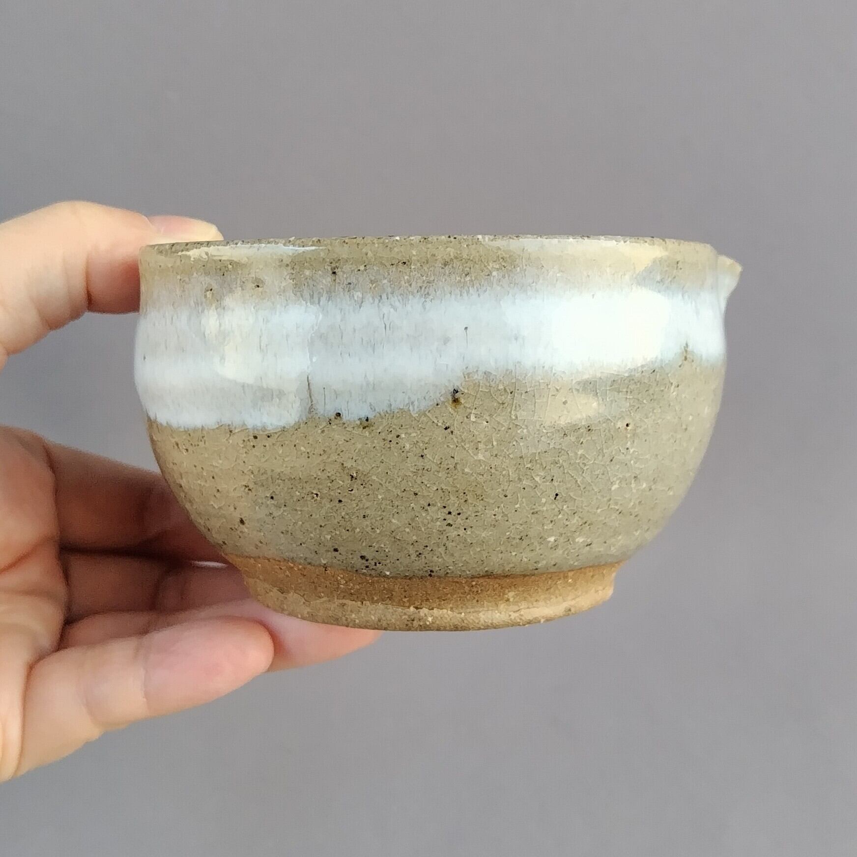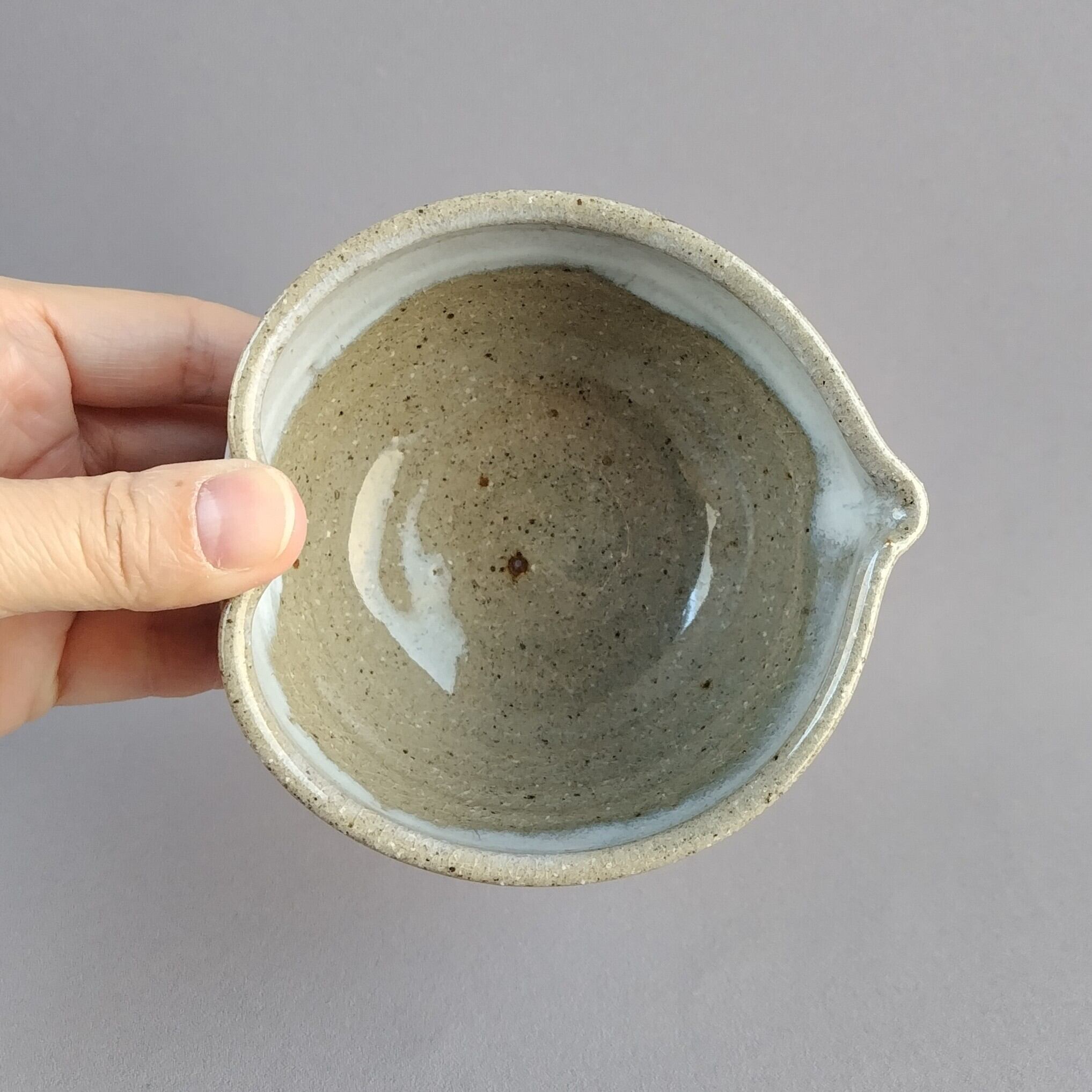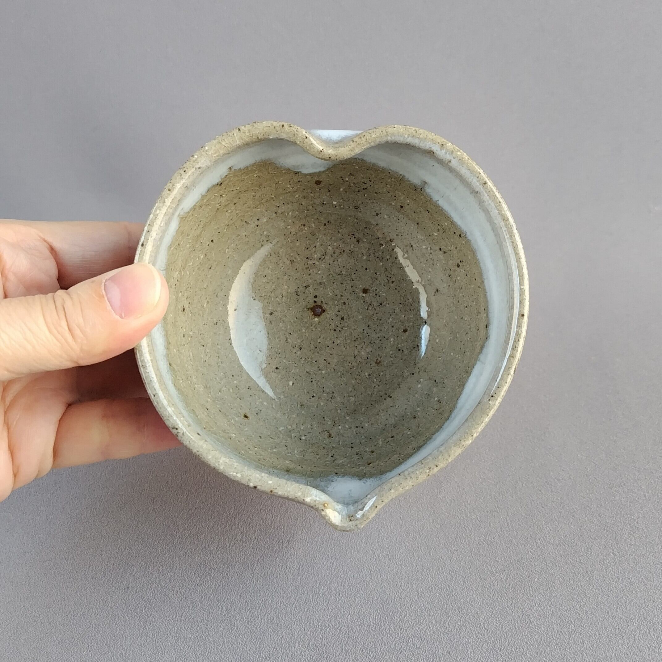 透明釉の縁に白萩釉がかけられた、ペアの片口型の小鉢です。