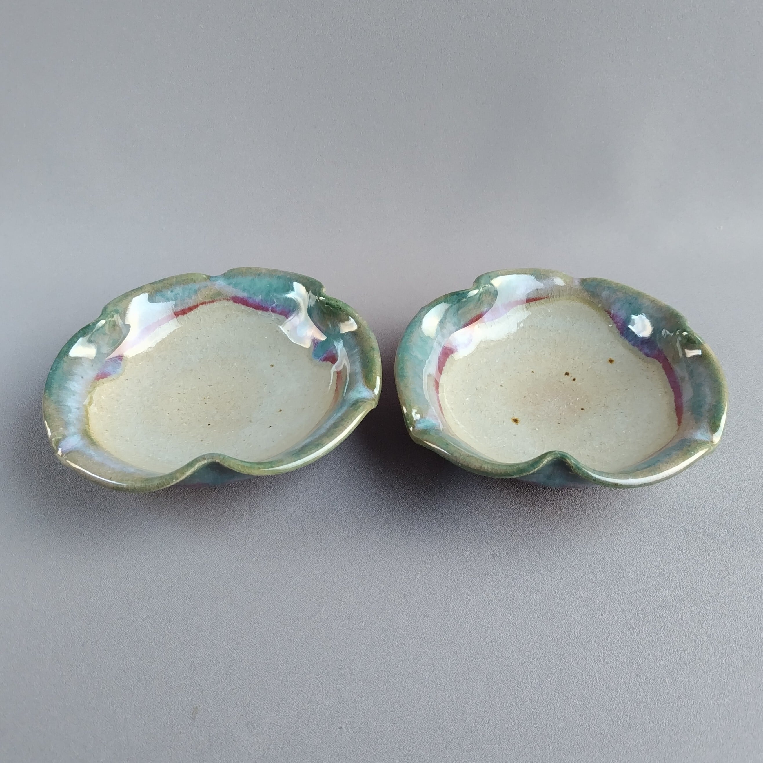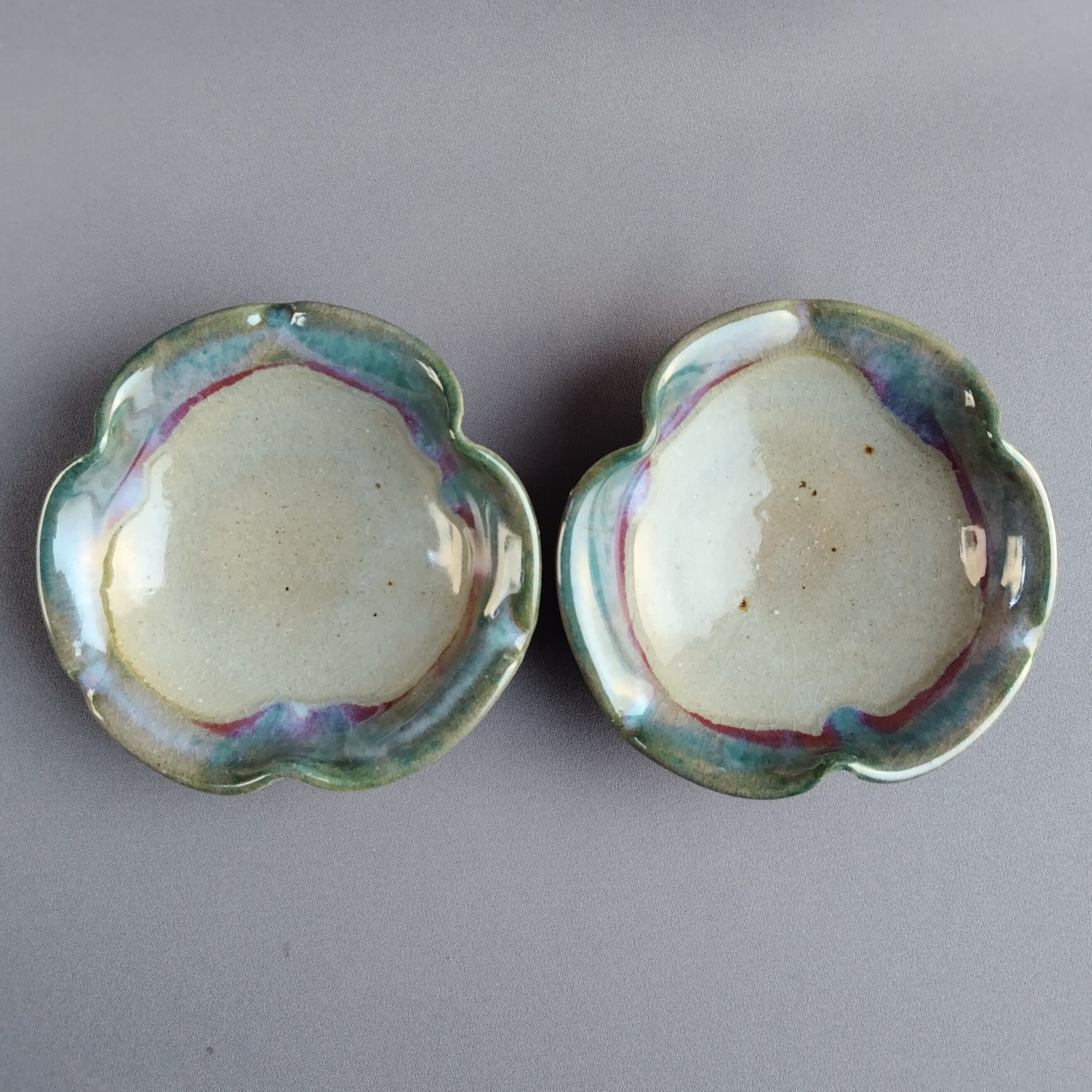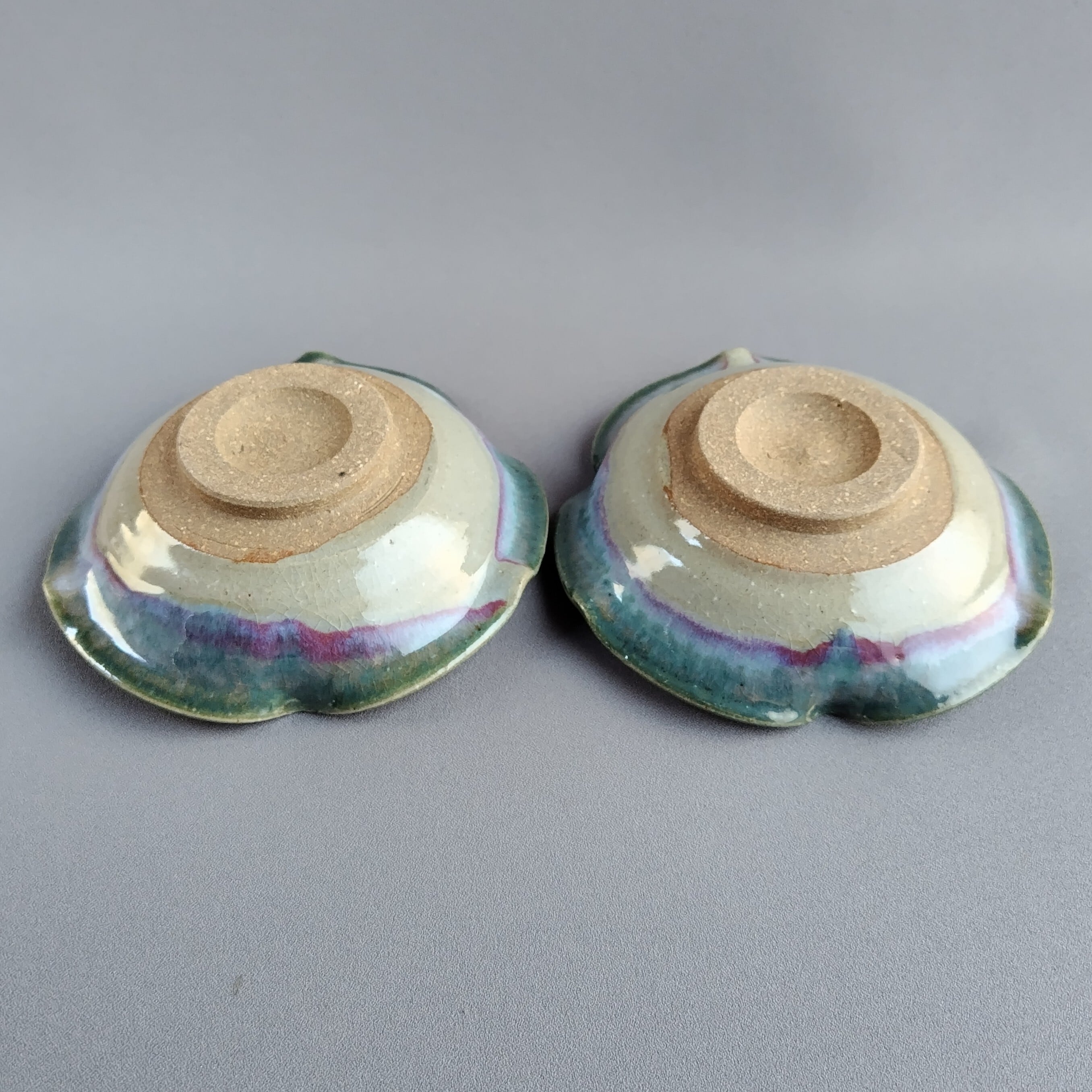 透明釉の縁に緑釉がかけられたペアの変形小鉢です。