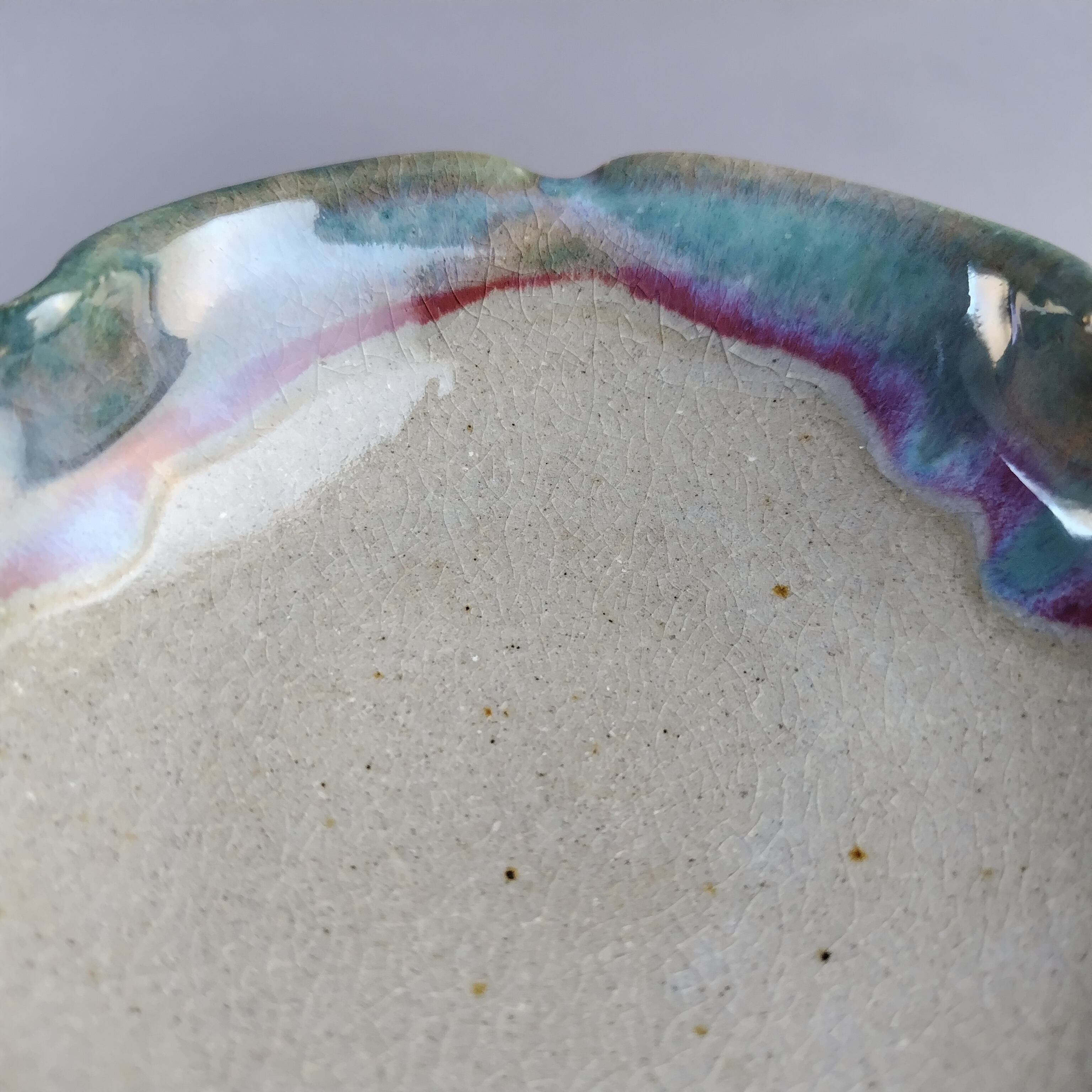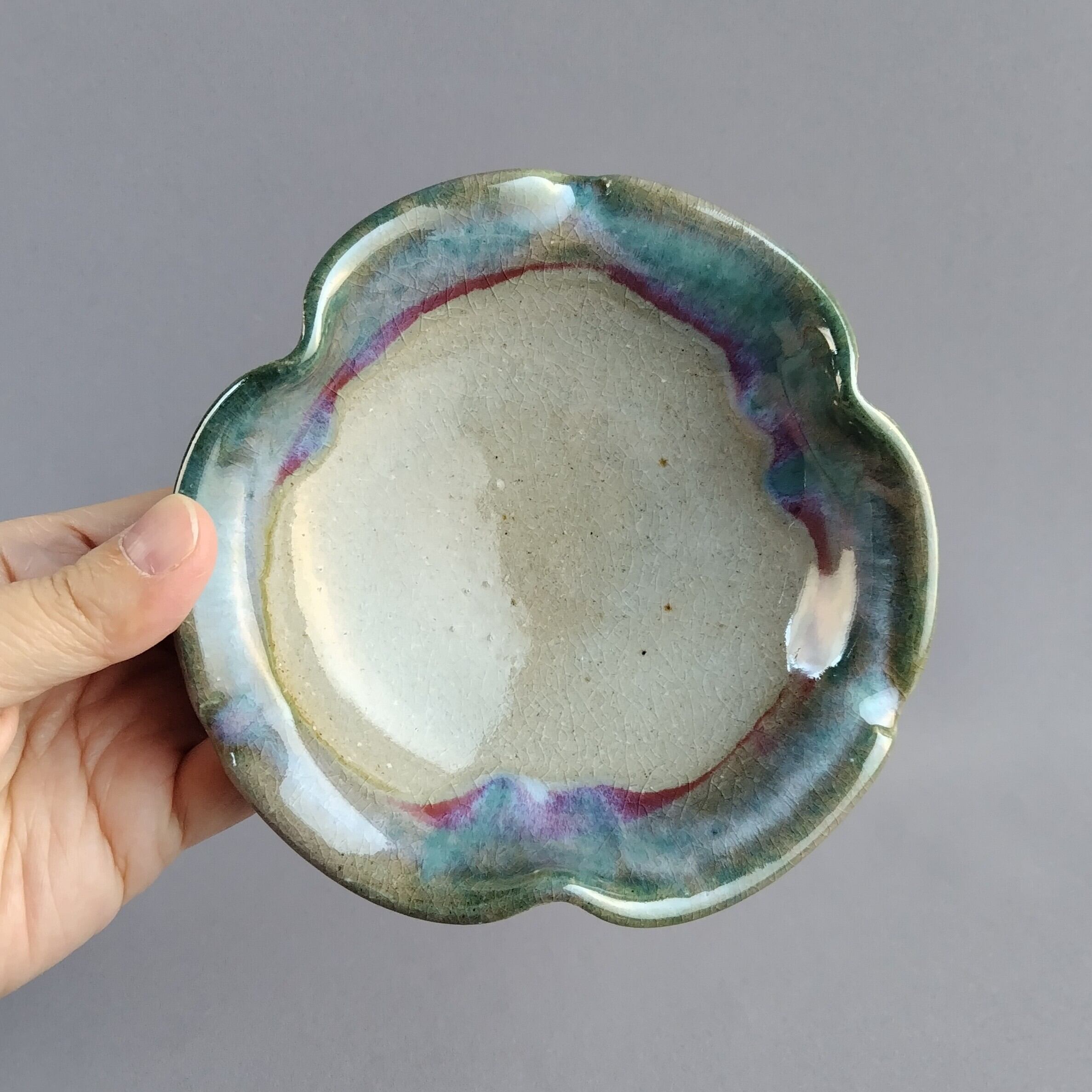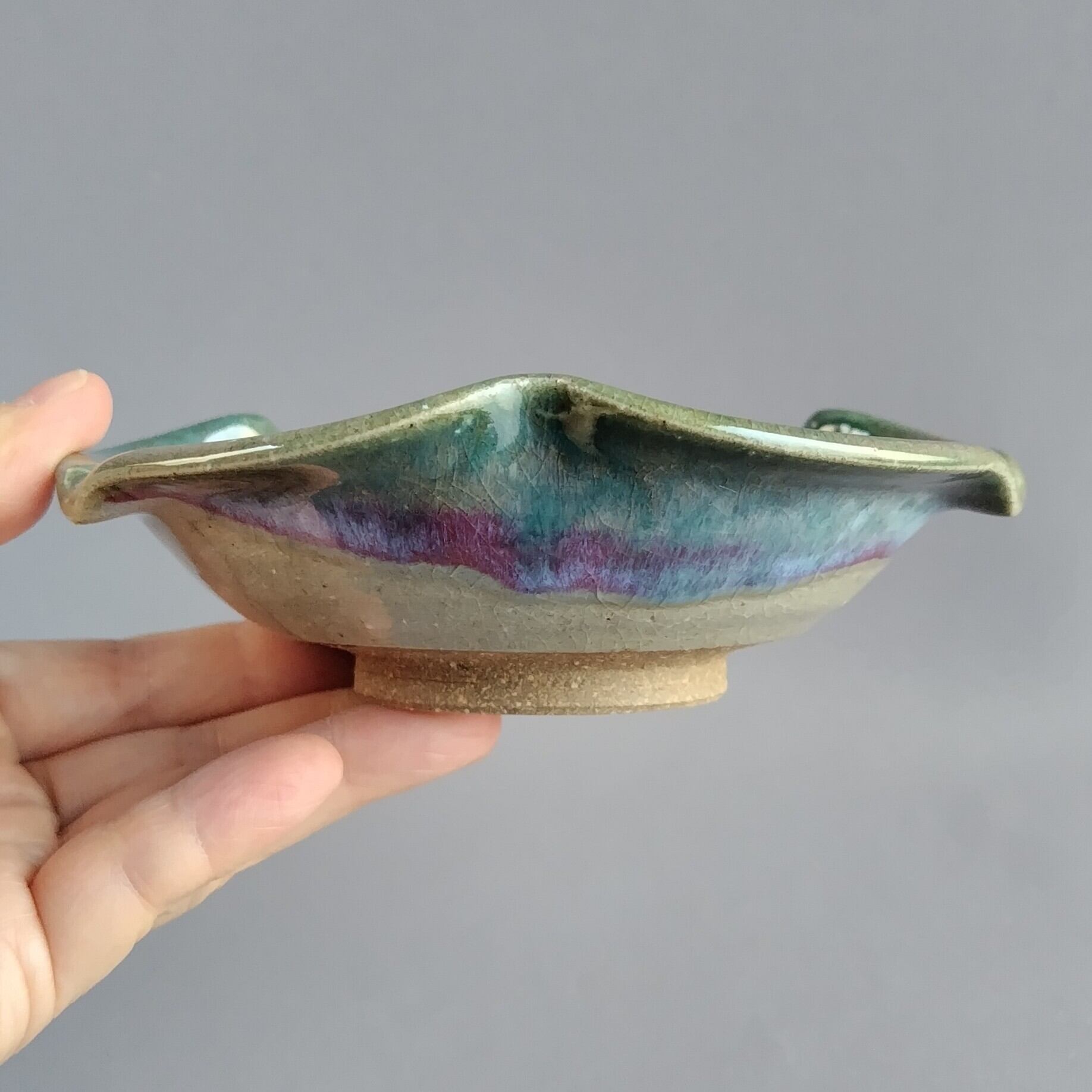 透明釉の縁に緑釉がかけられたペアの変形小鉢です。