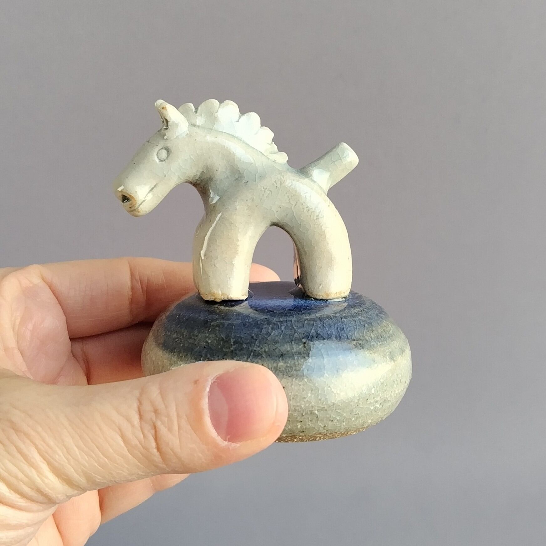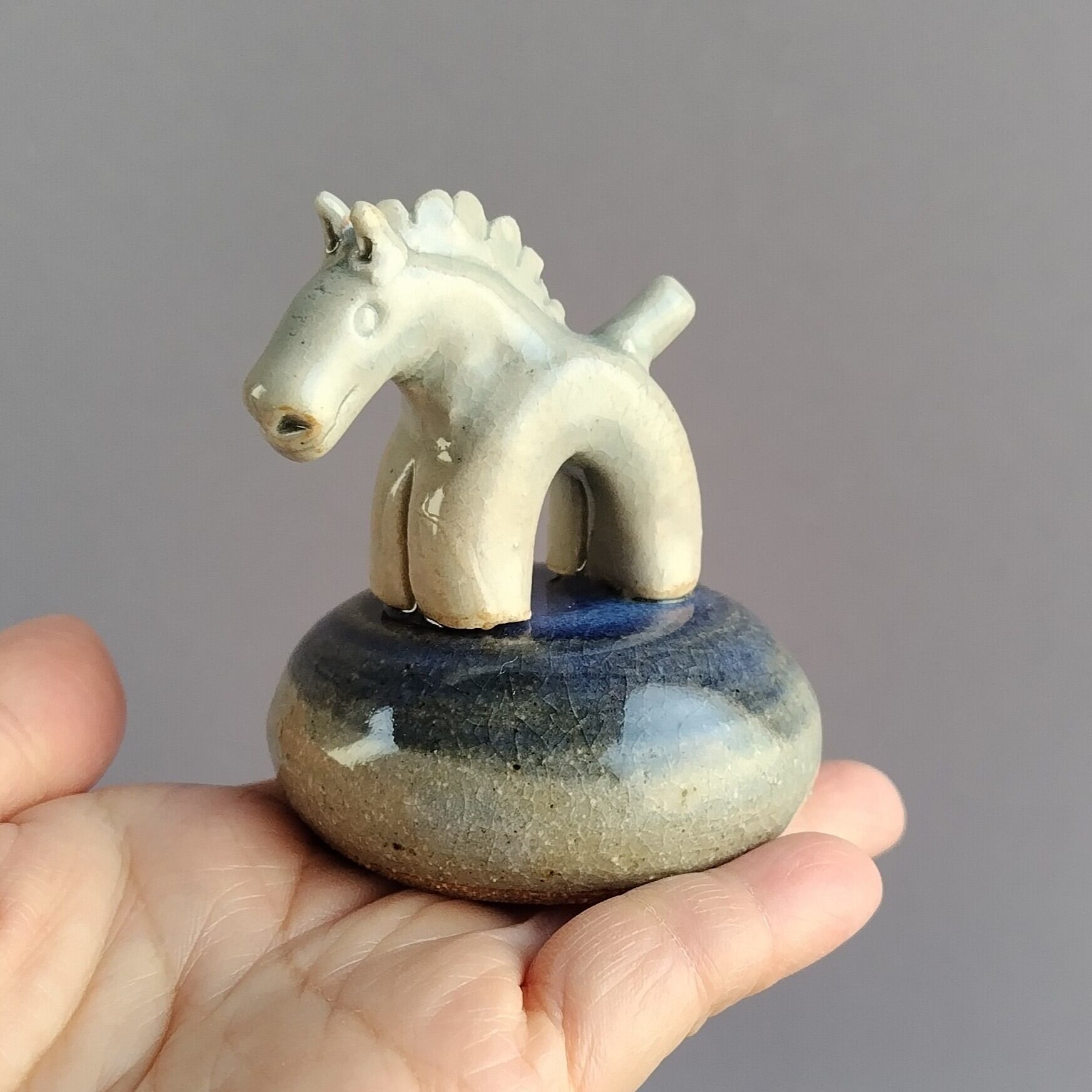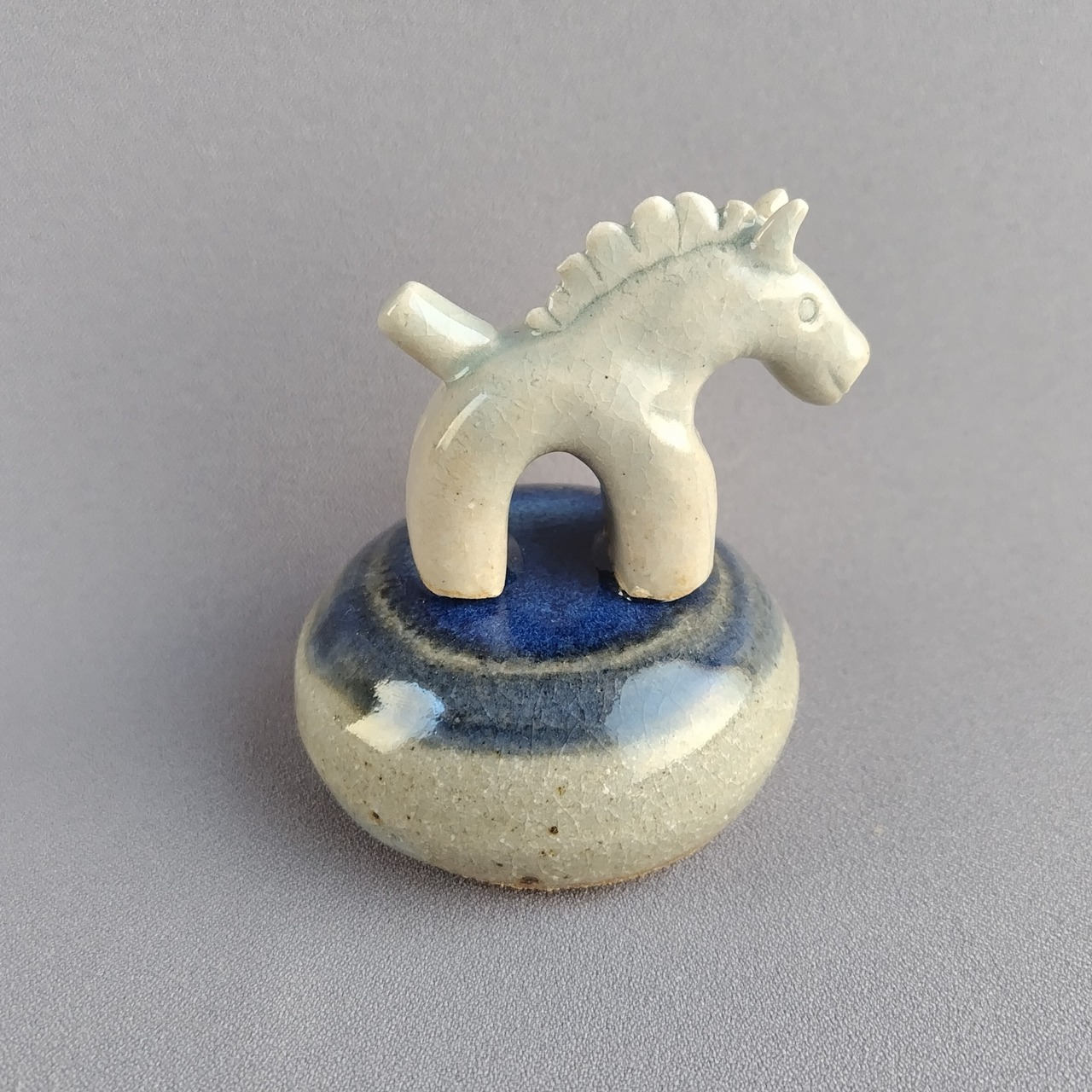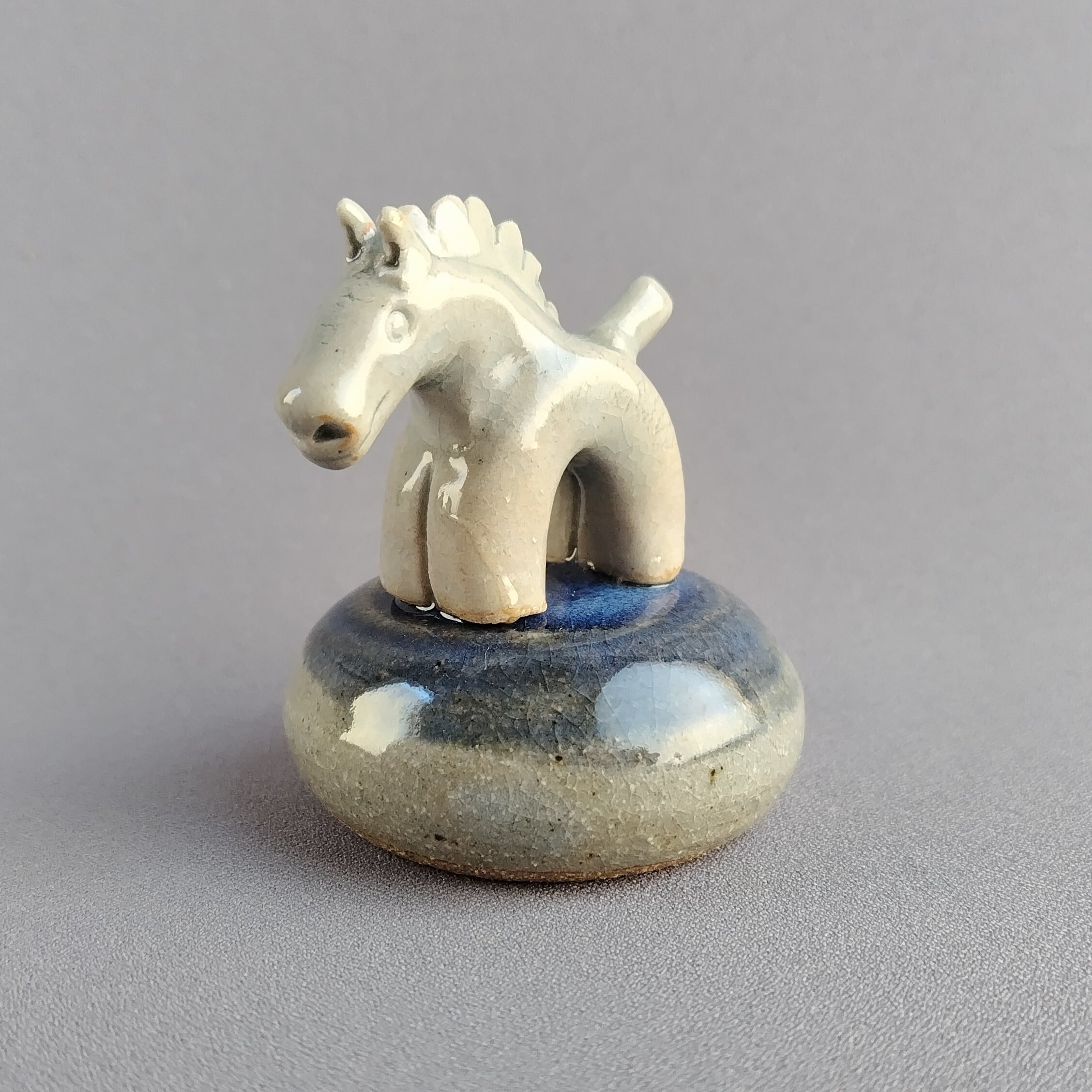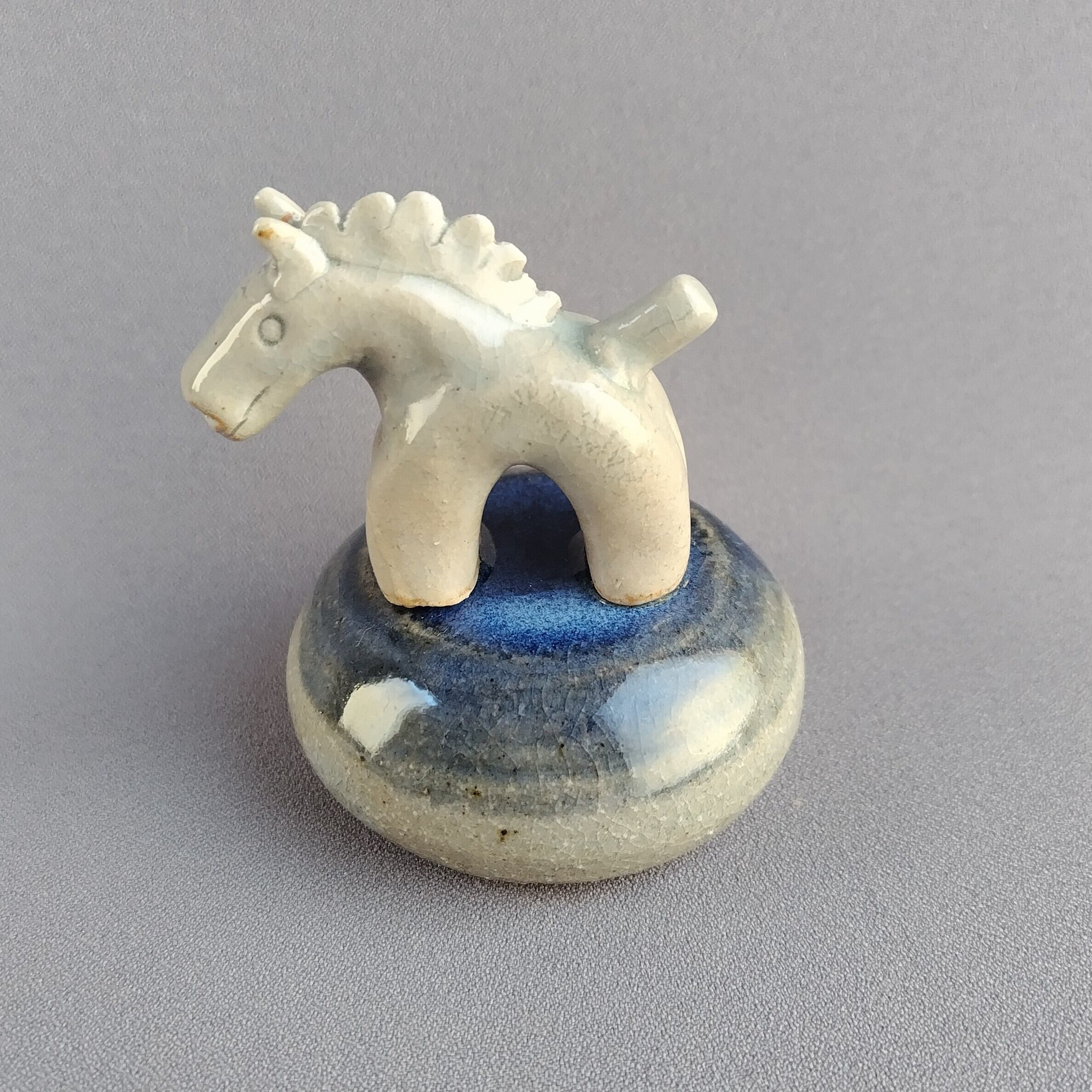 馬本体:青磁釉・台:透明釉+藍釉