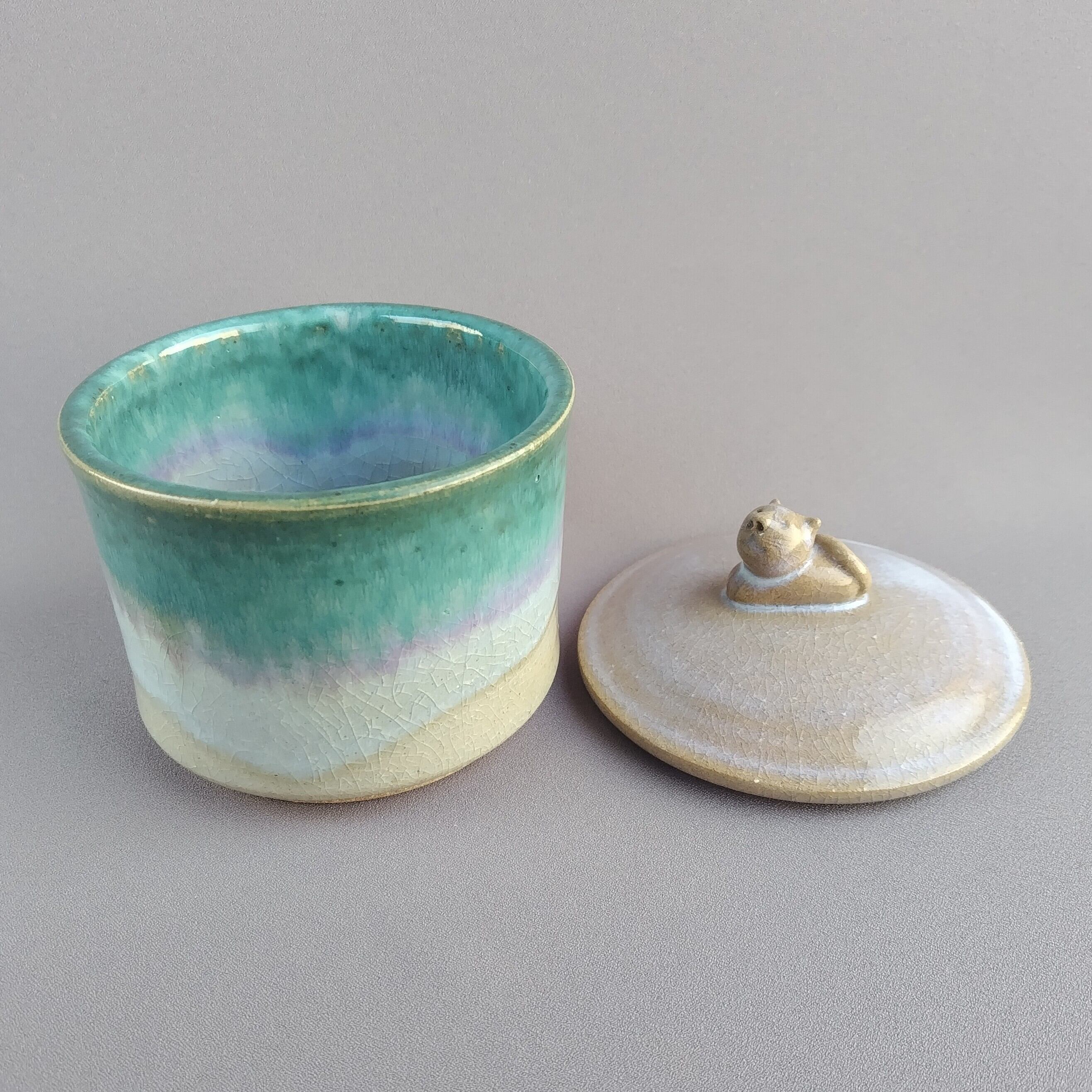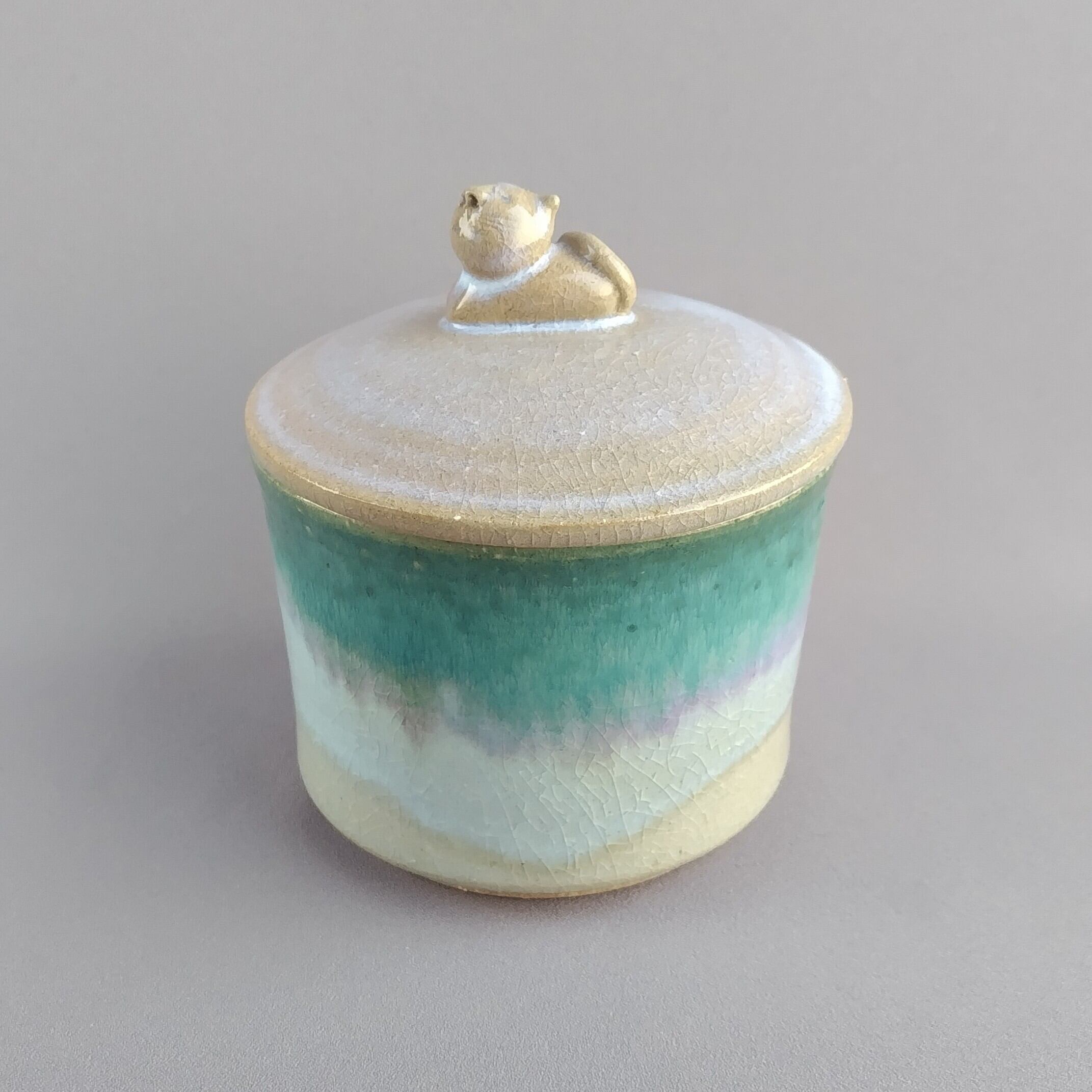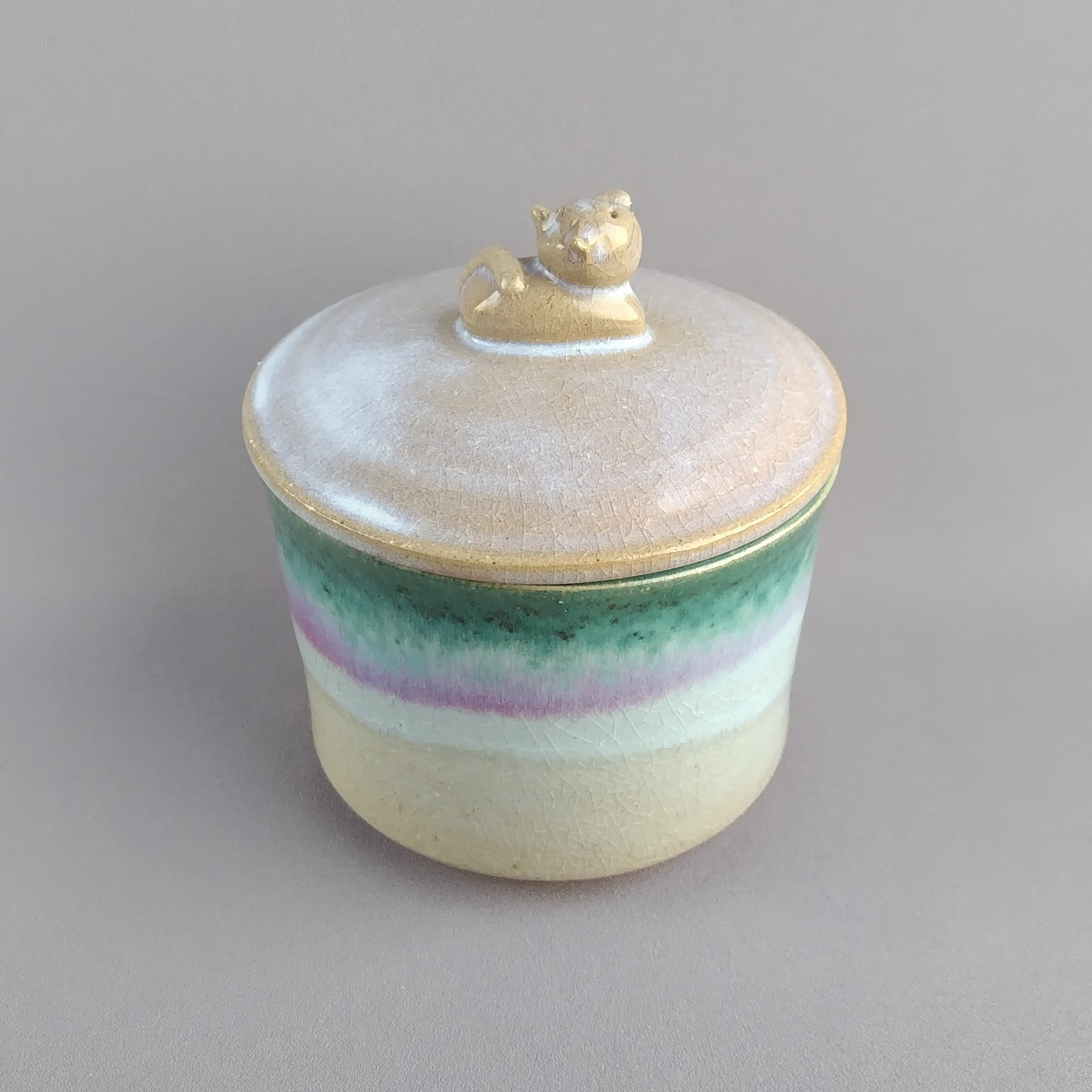 透明釉の縁に緑釉が掛けられており、蓋にはねこの取手がついています。