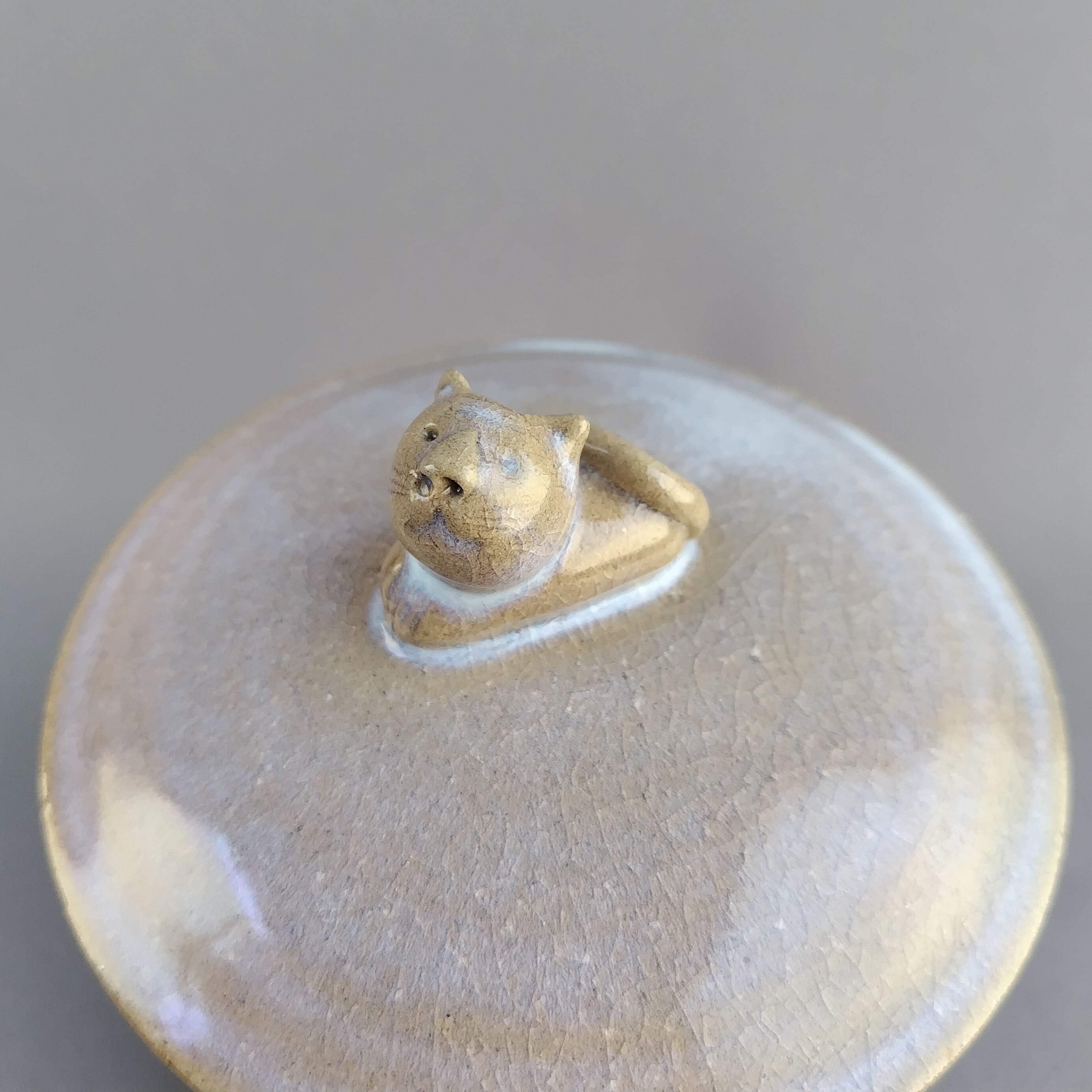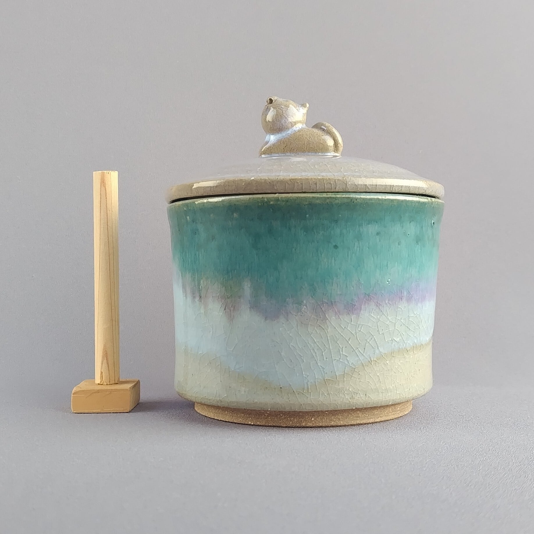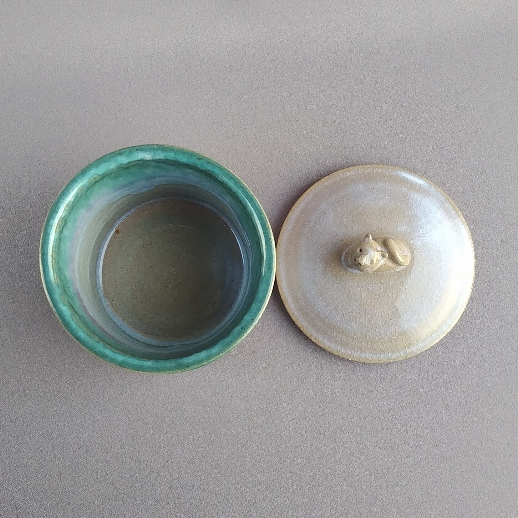 透明釉の縁に緑釉が掛けられており、蓋にはねこの取手がついています。