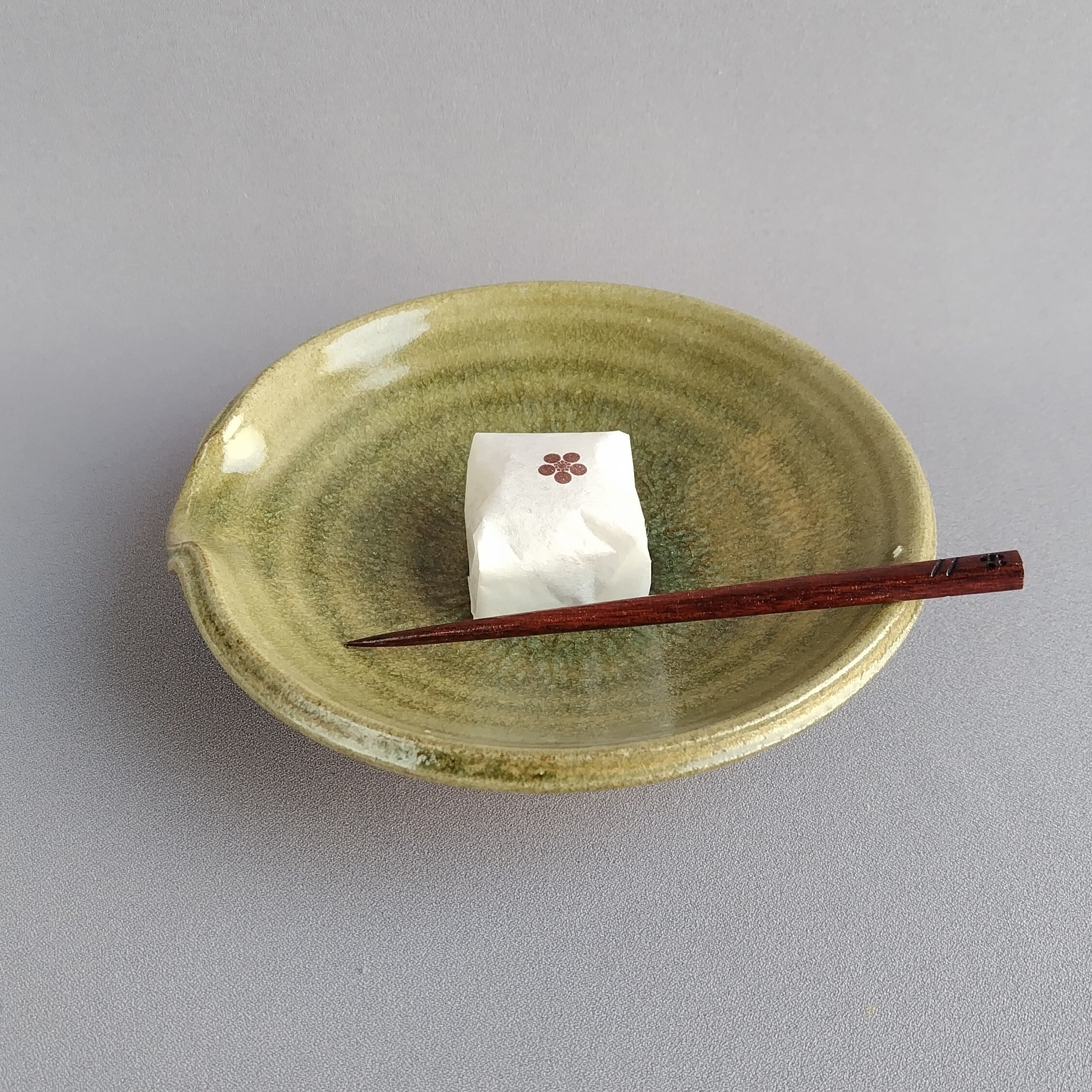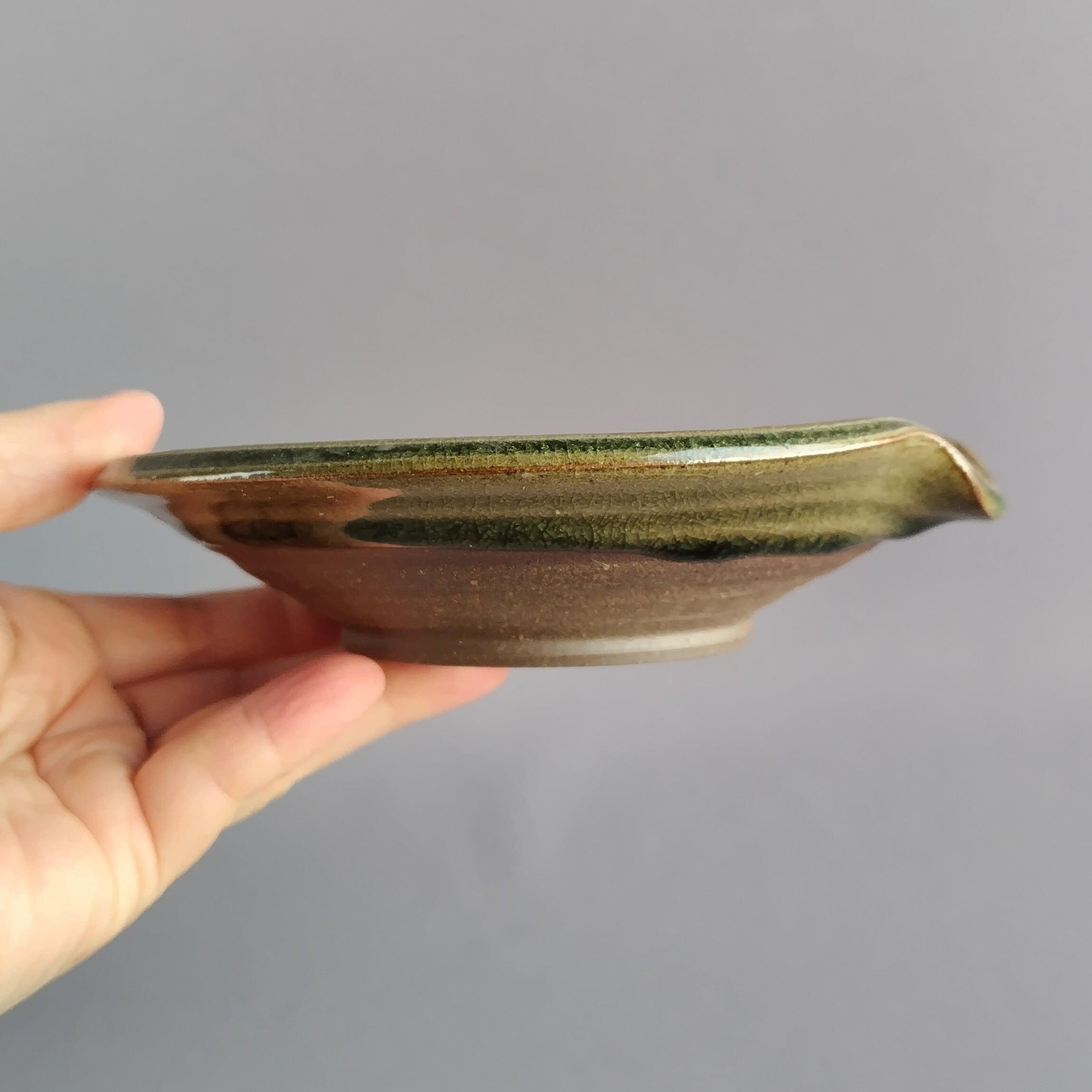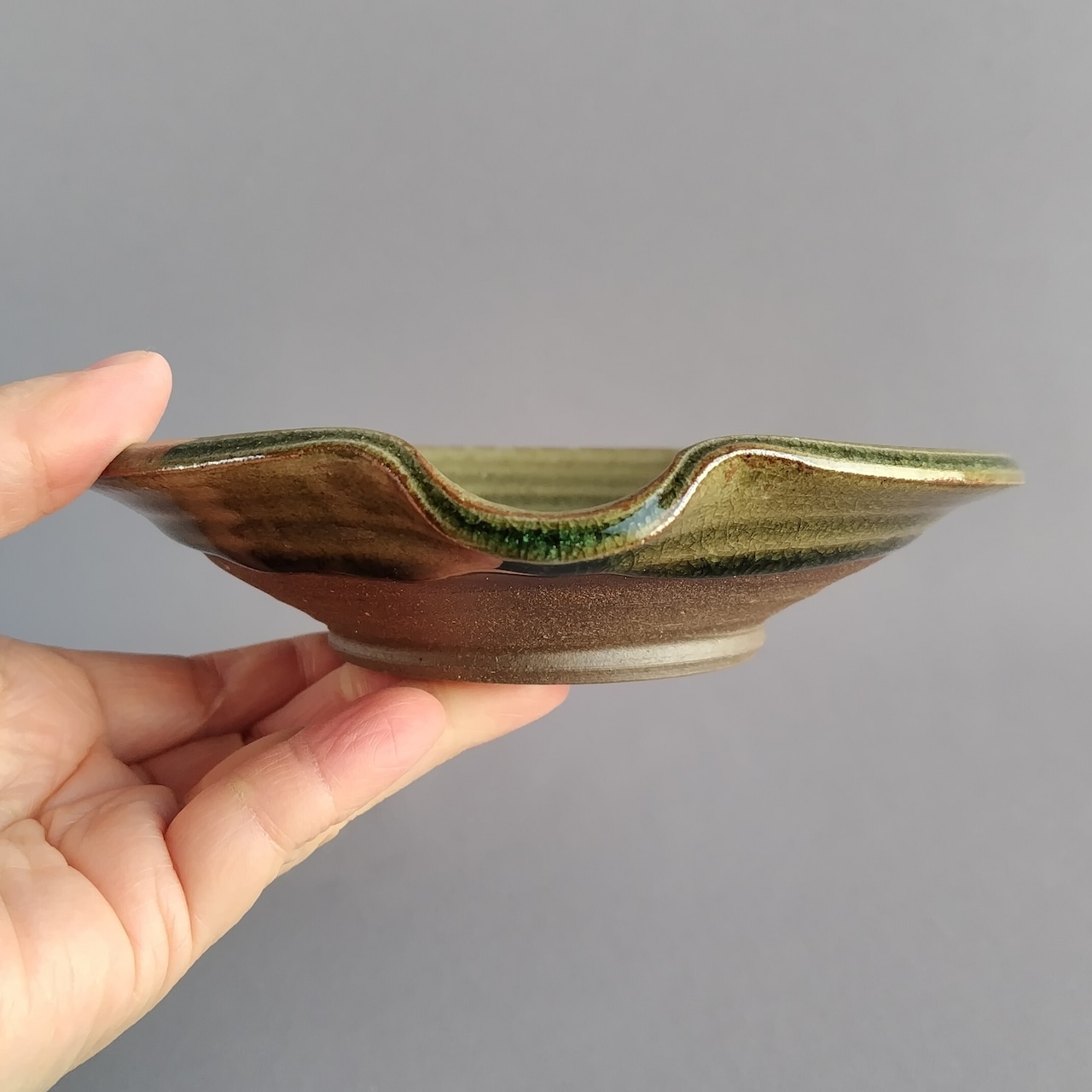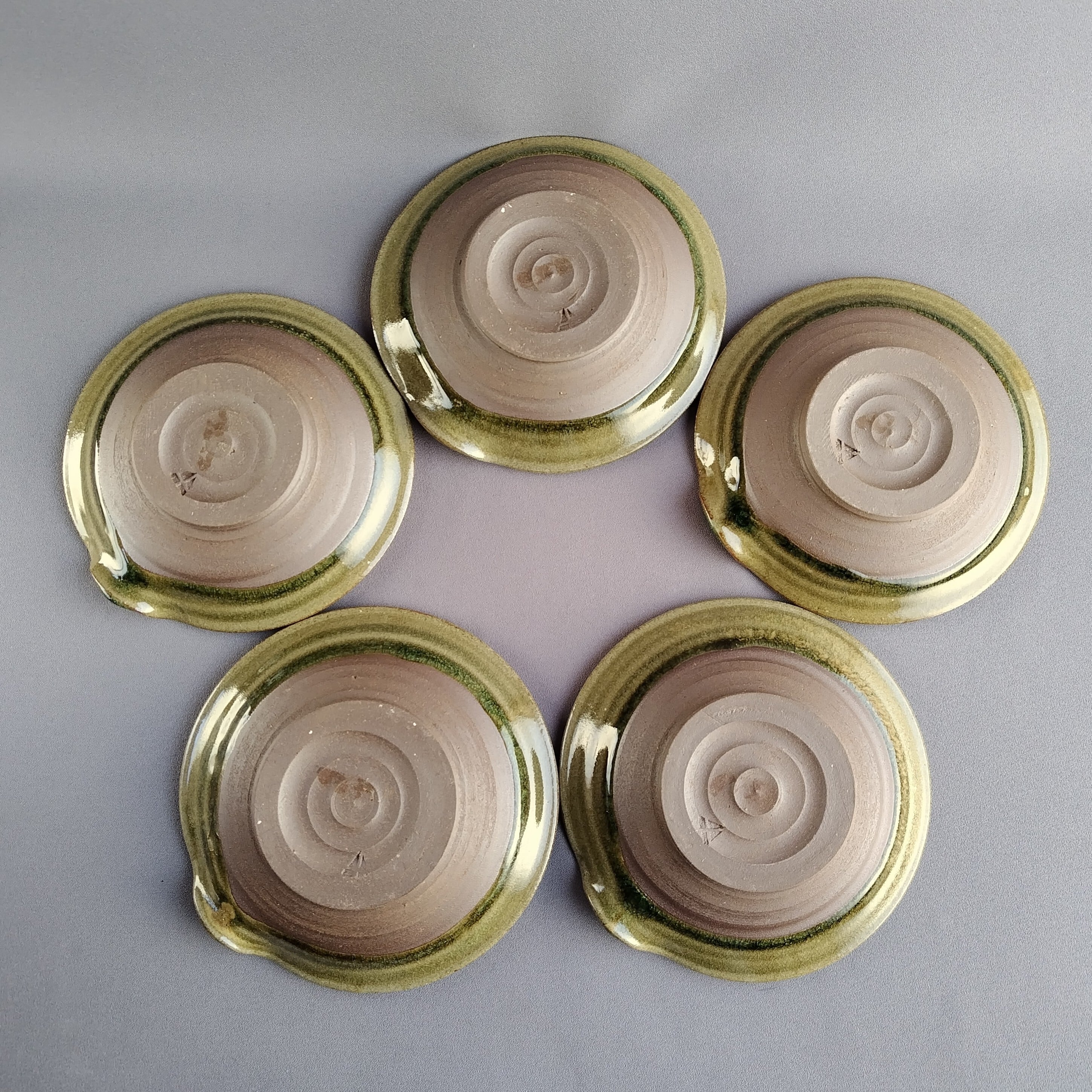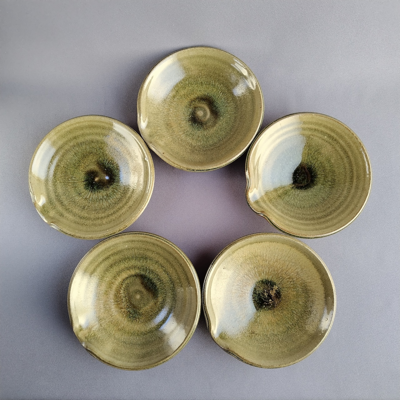ビードロ釉が掛けられた五客組の片口型変形皿です。