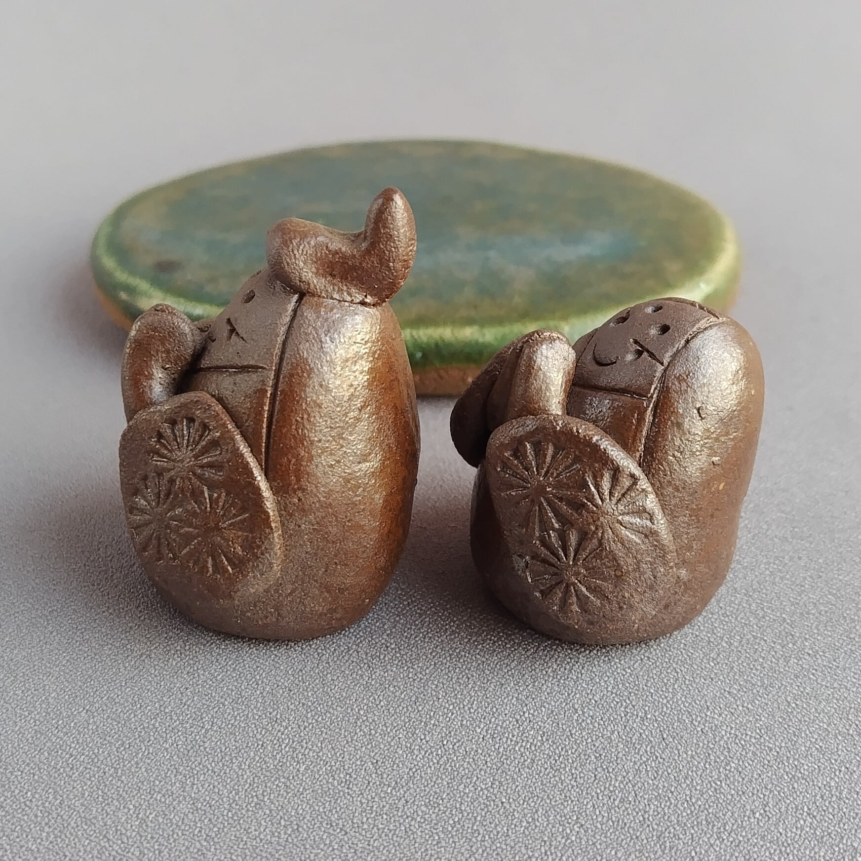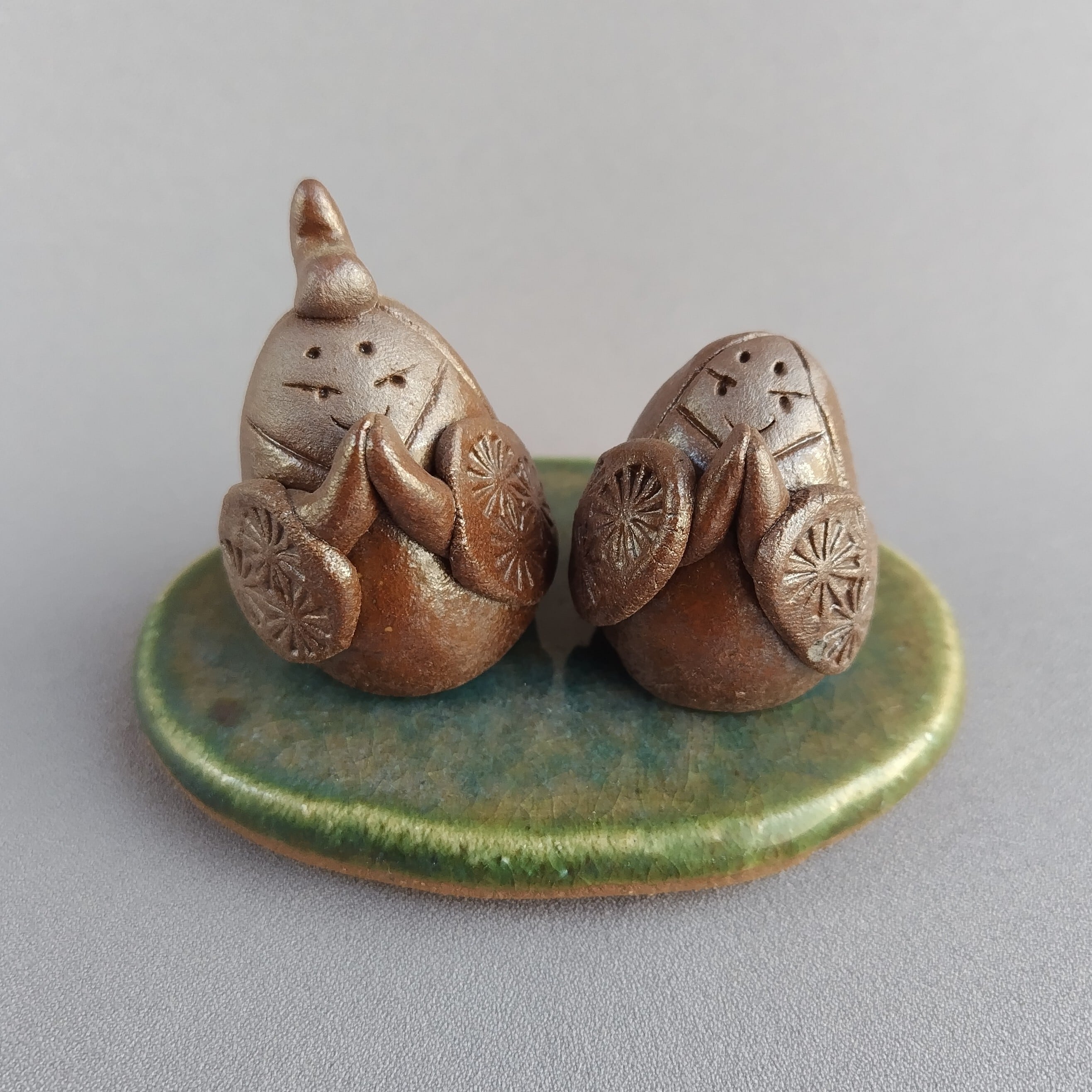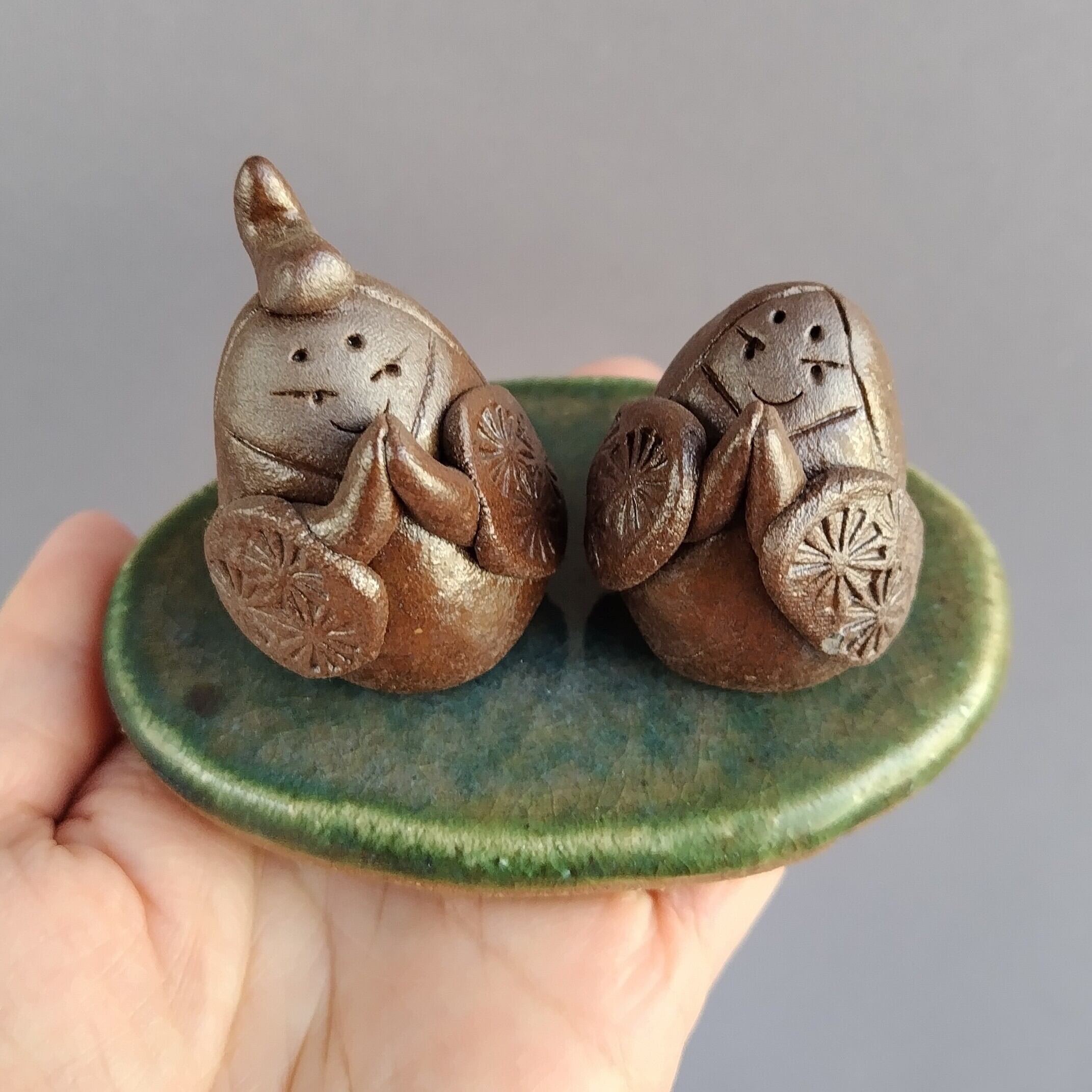 おひなさま(豆雛)(台と分離型) 焼締め(台座:緑釉) 【商品番号:00873】