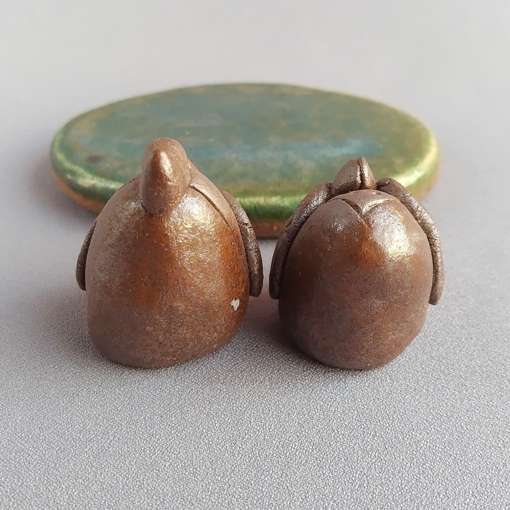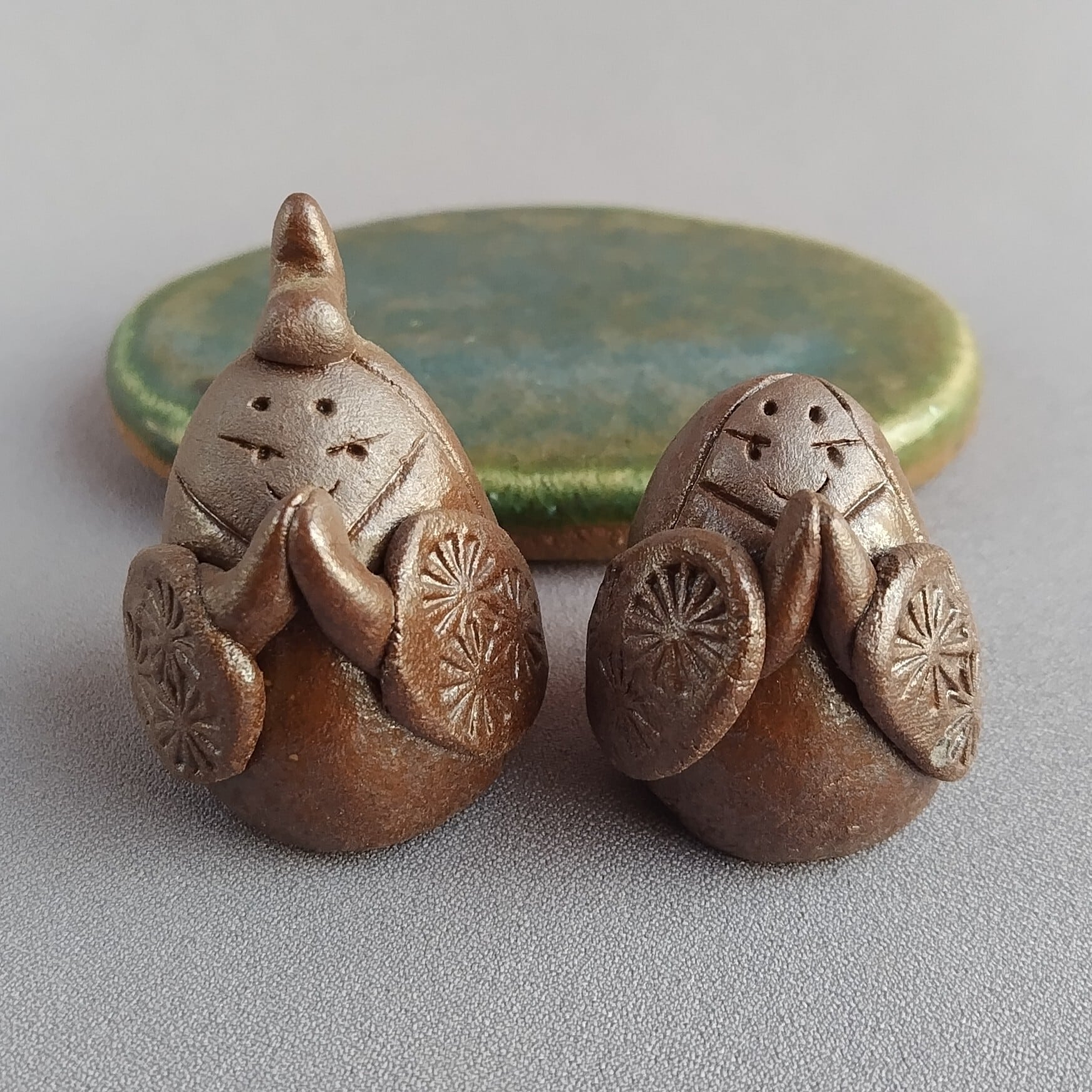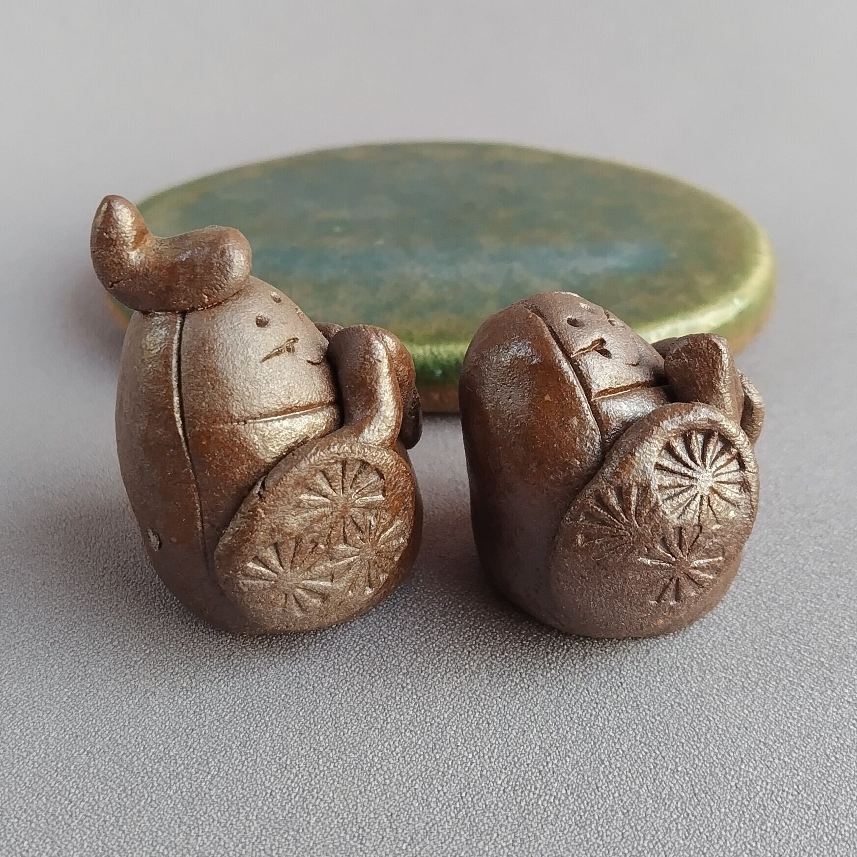 おひなさま(豆雛)(台と分離型) 焼締め(台座:緑釉) 【商品番号:00873】