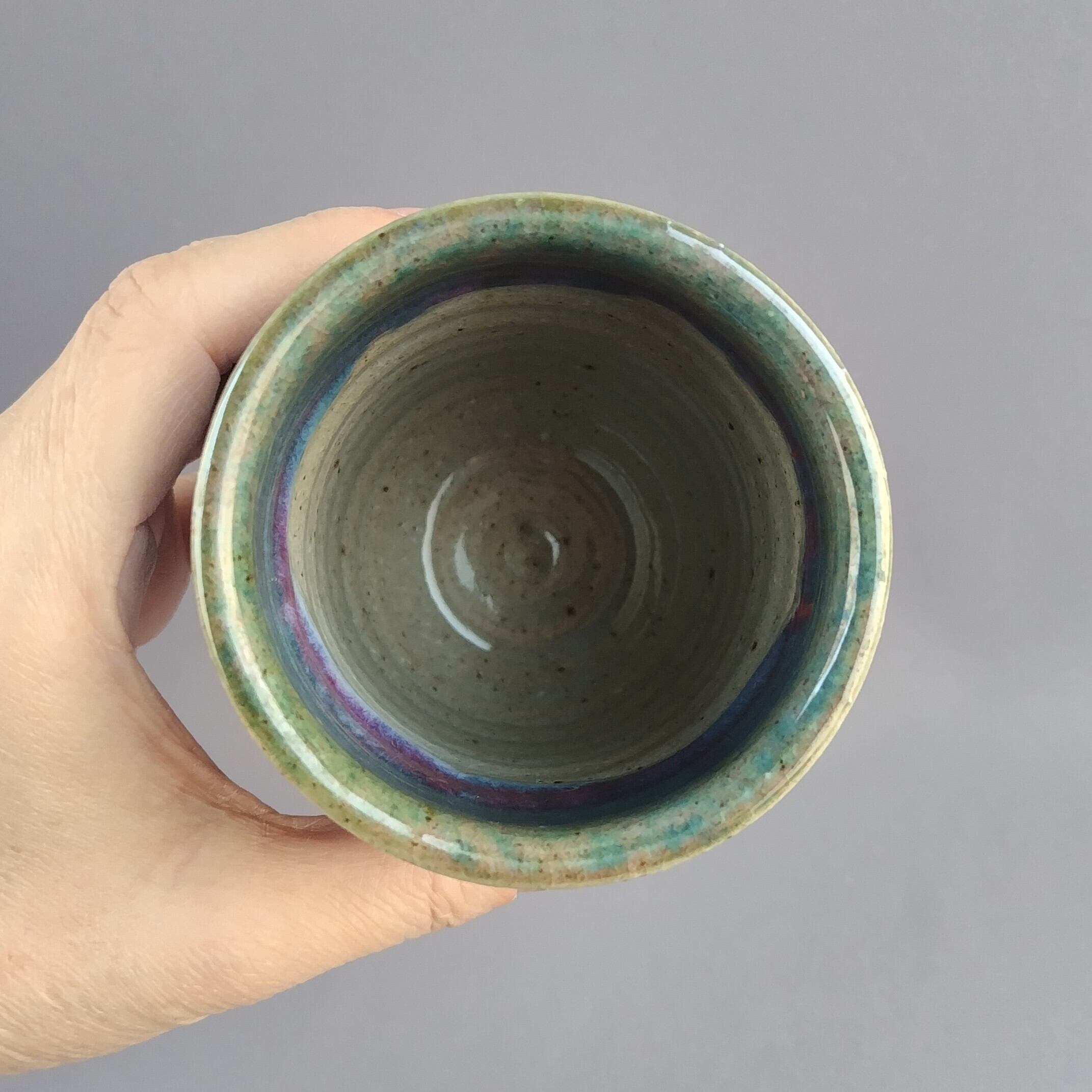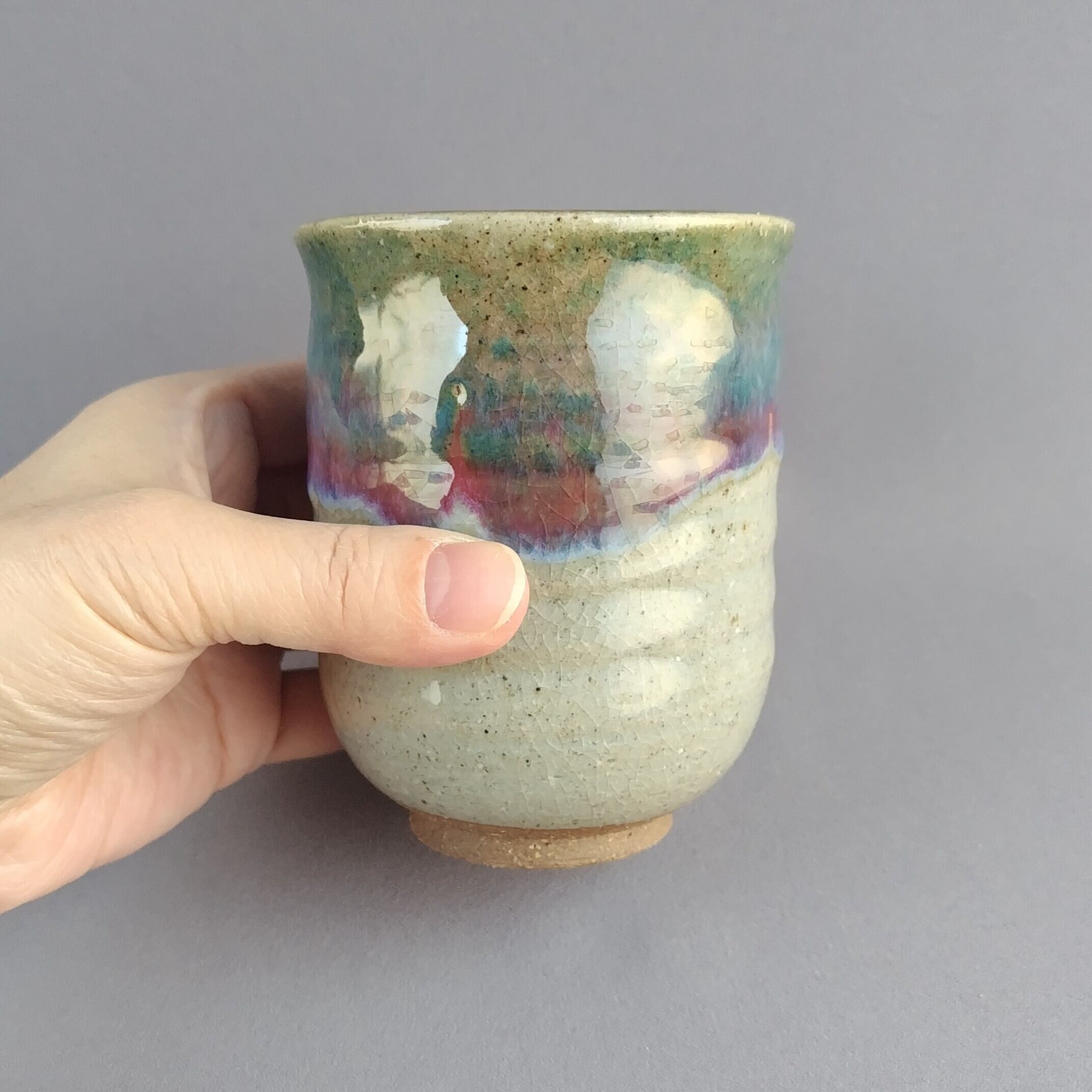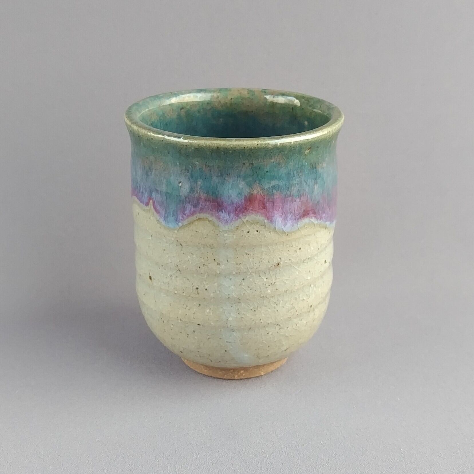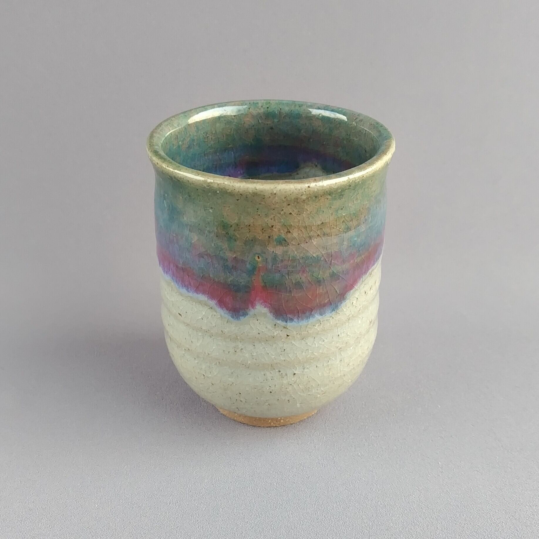 透明釉の縁に緑釉がかけられた、大きめの湯呑茶碗です。