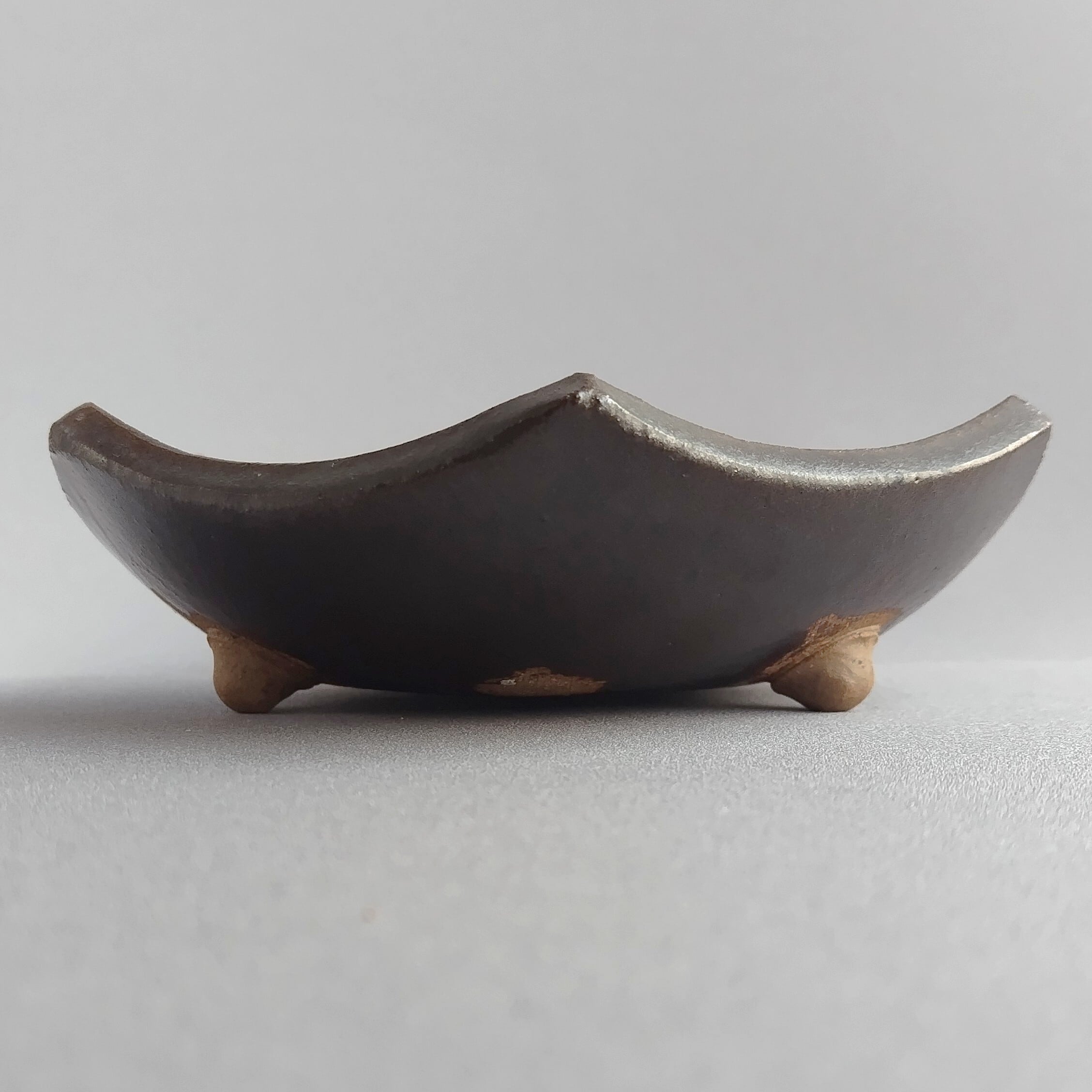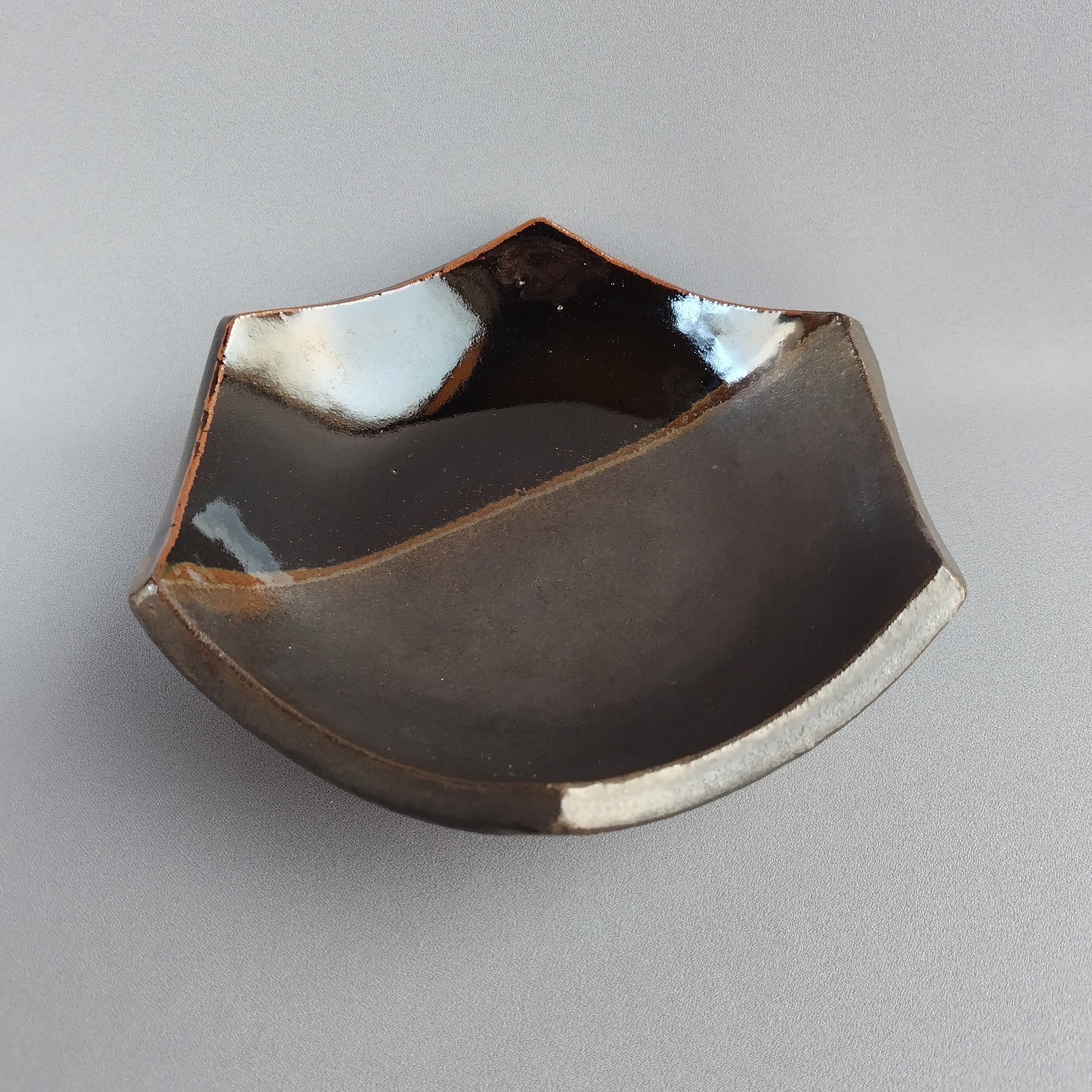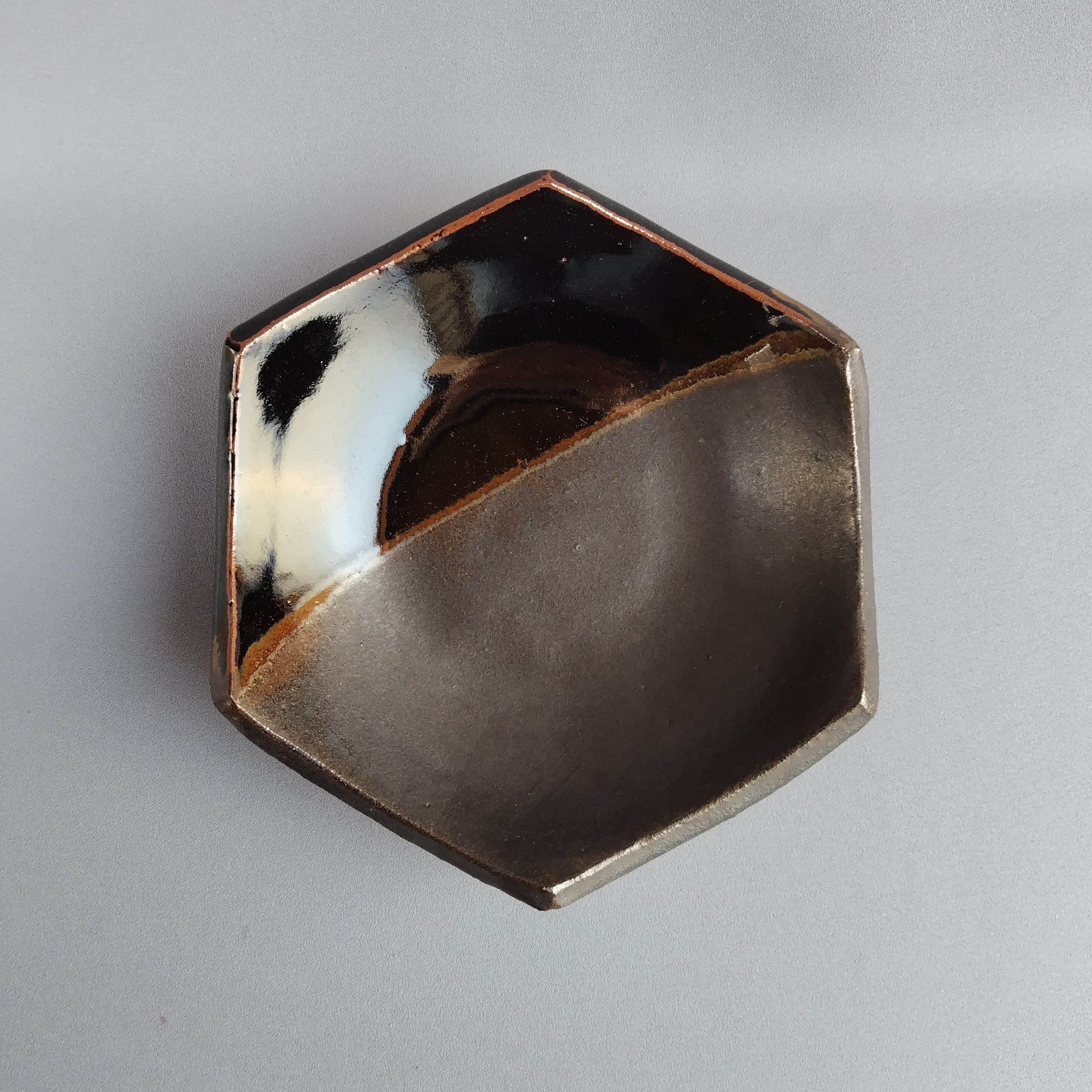 黒のマット釉と透明釉の掛け分けが施された三点足の亀甲皿です。