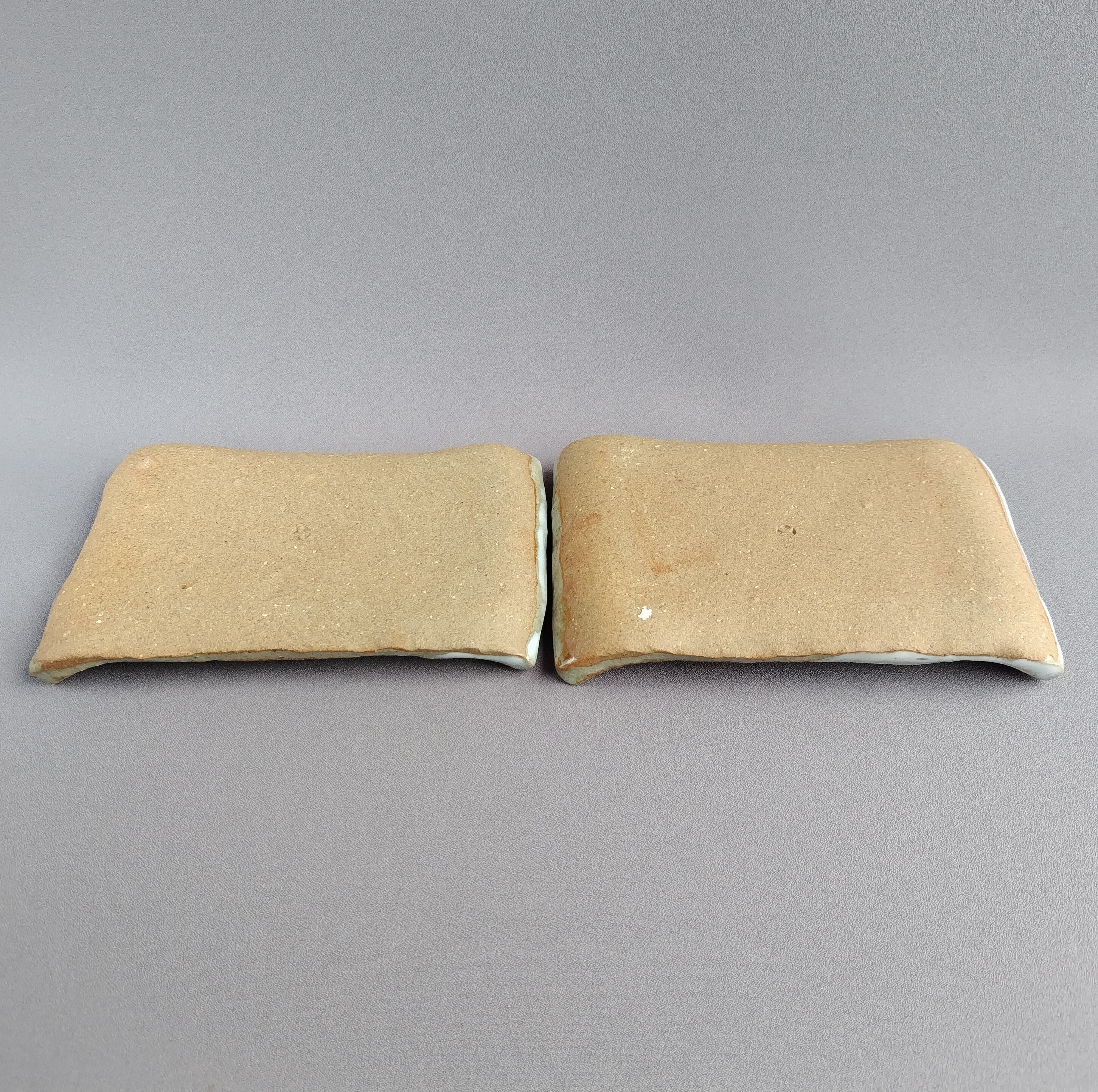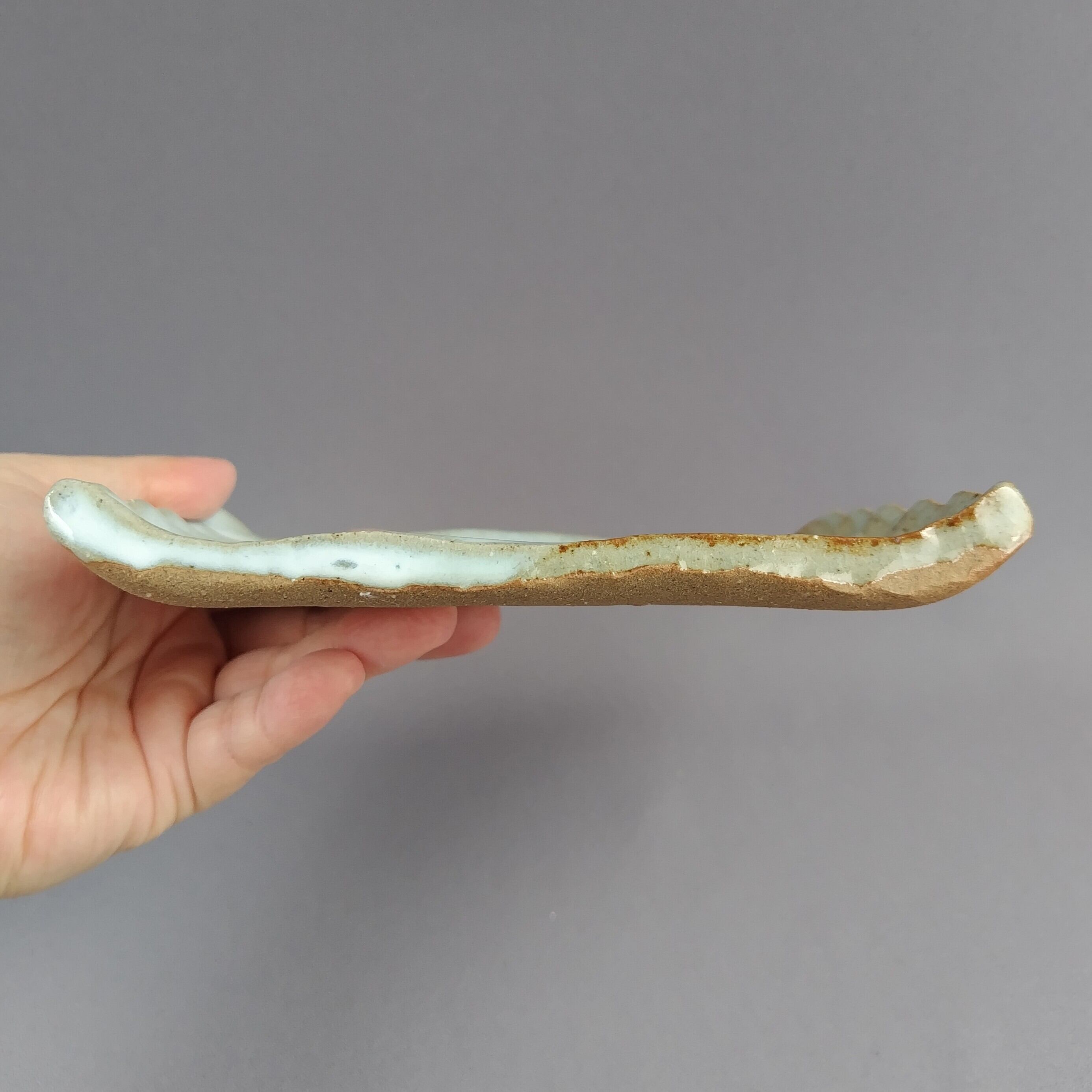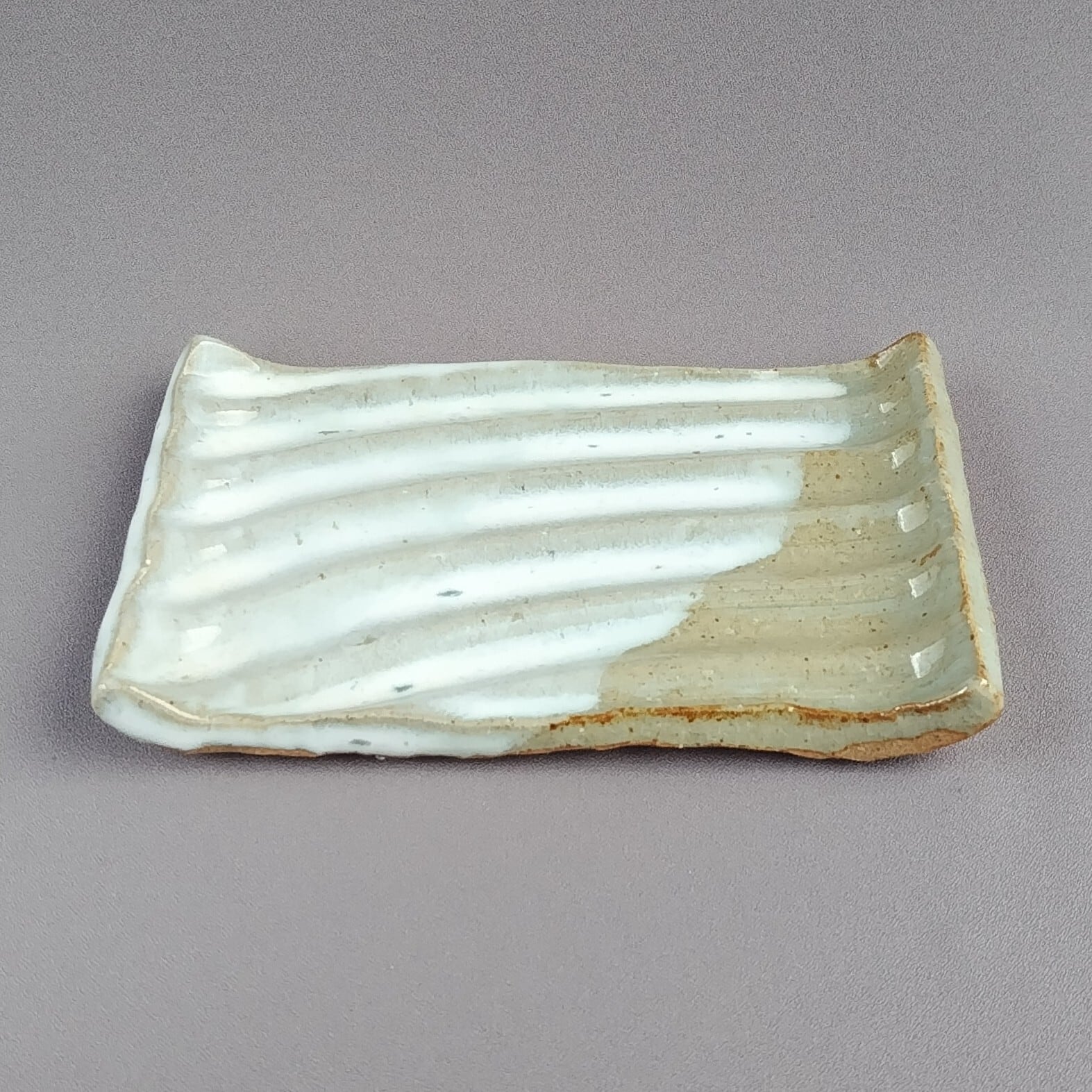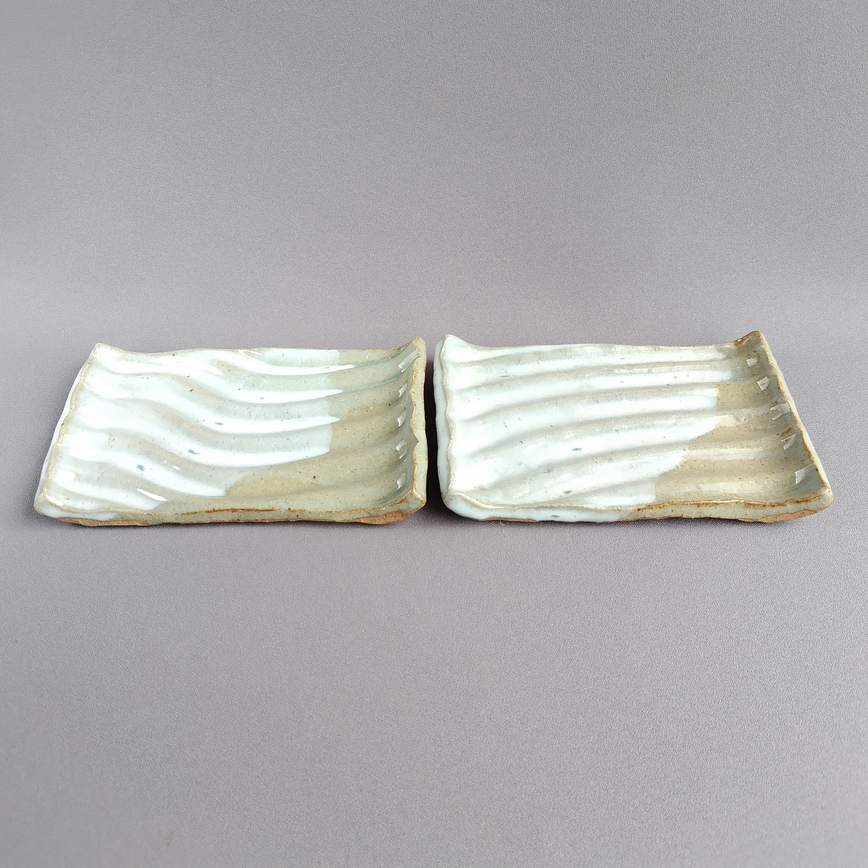 白萩釉と透明釉の掛け分けが施された、波板のペアの長方皿です。