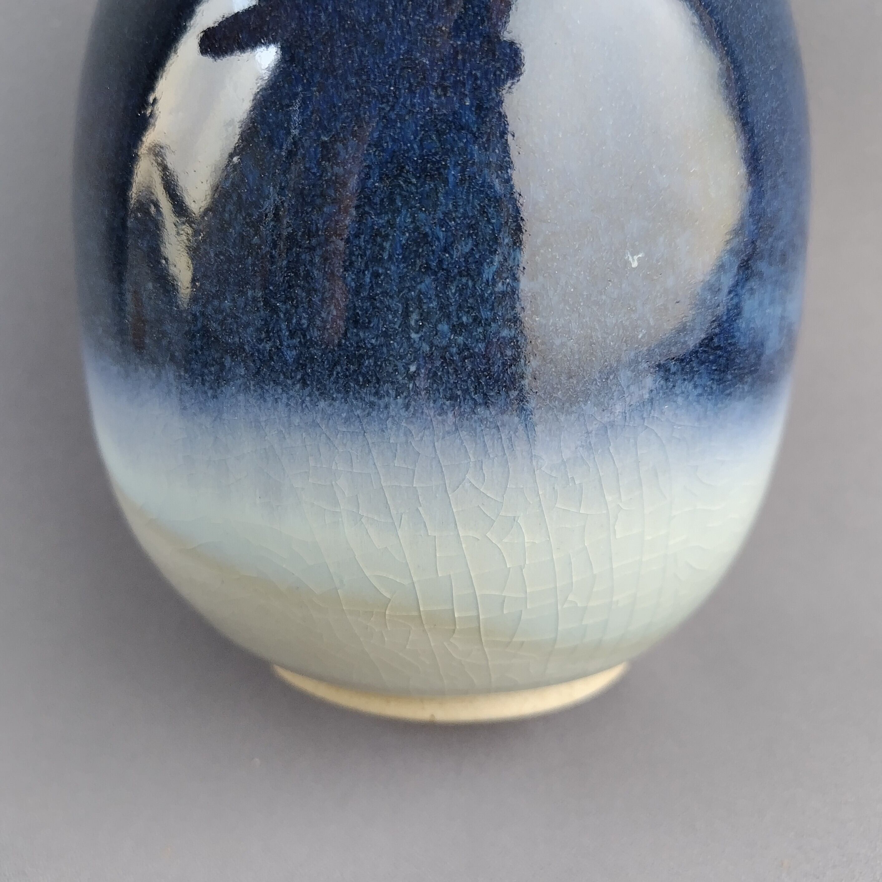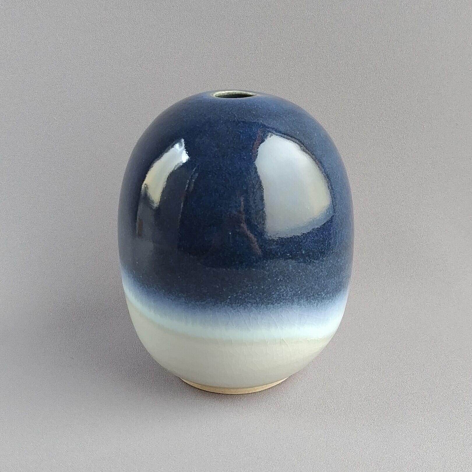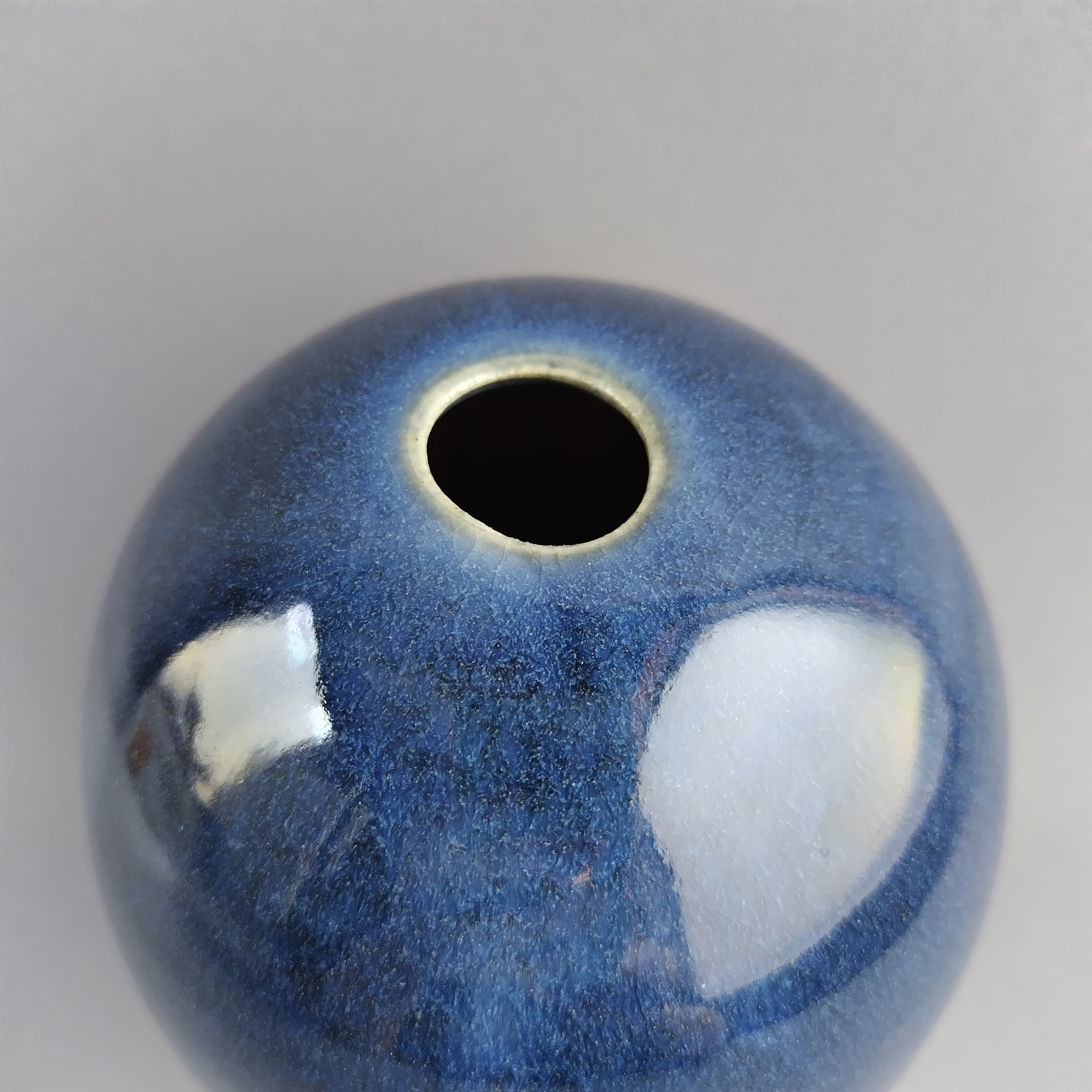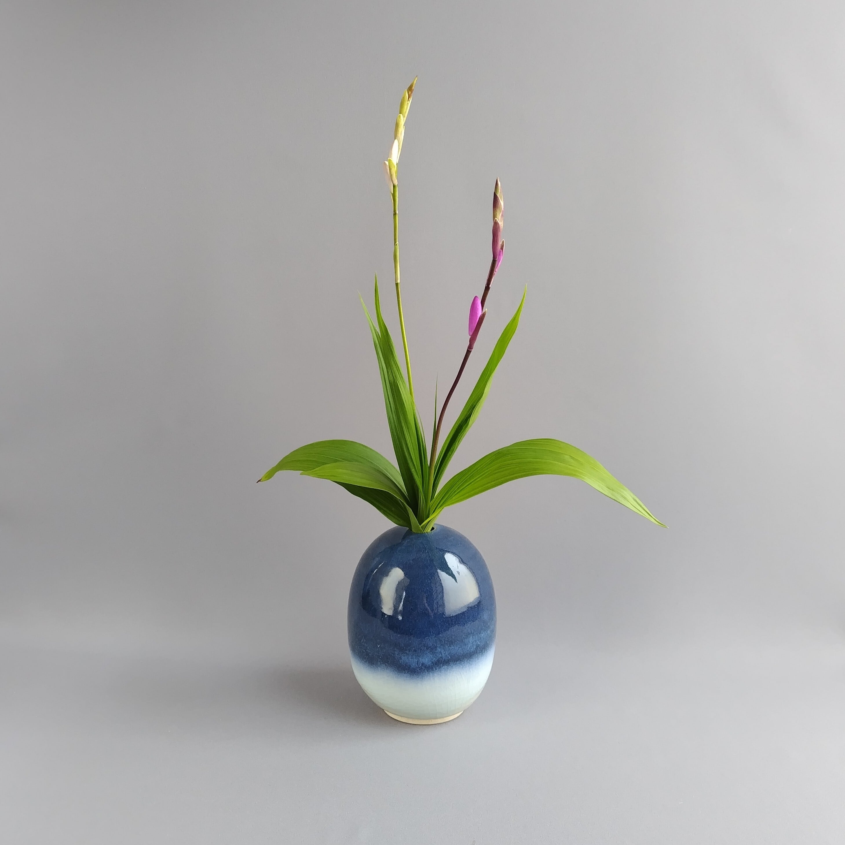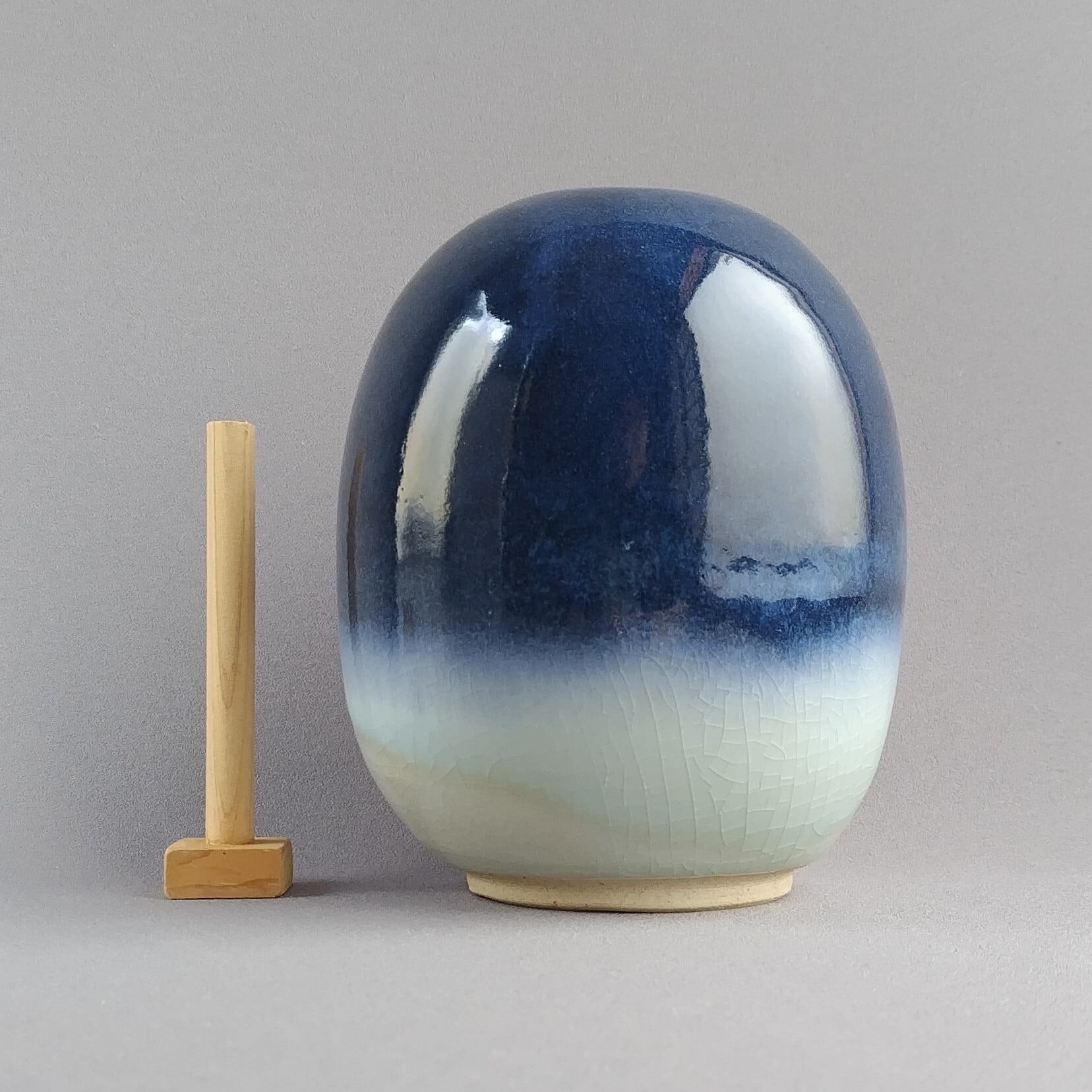 透明釉と藍釉が掛けられた楕円形の花入れです。