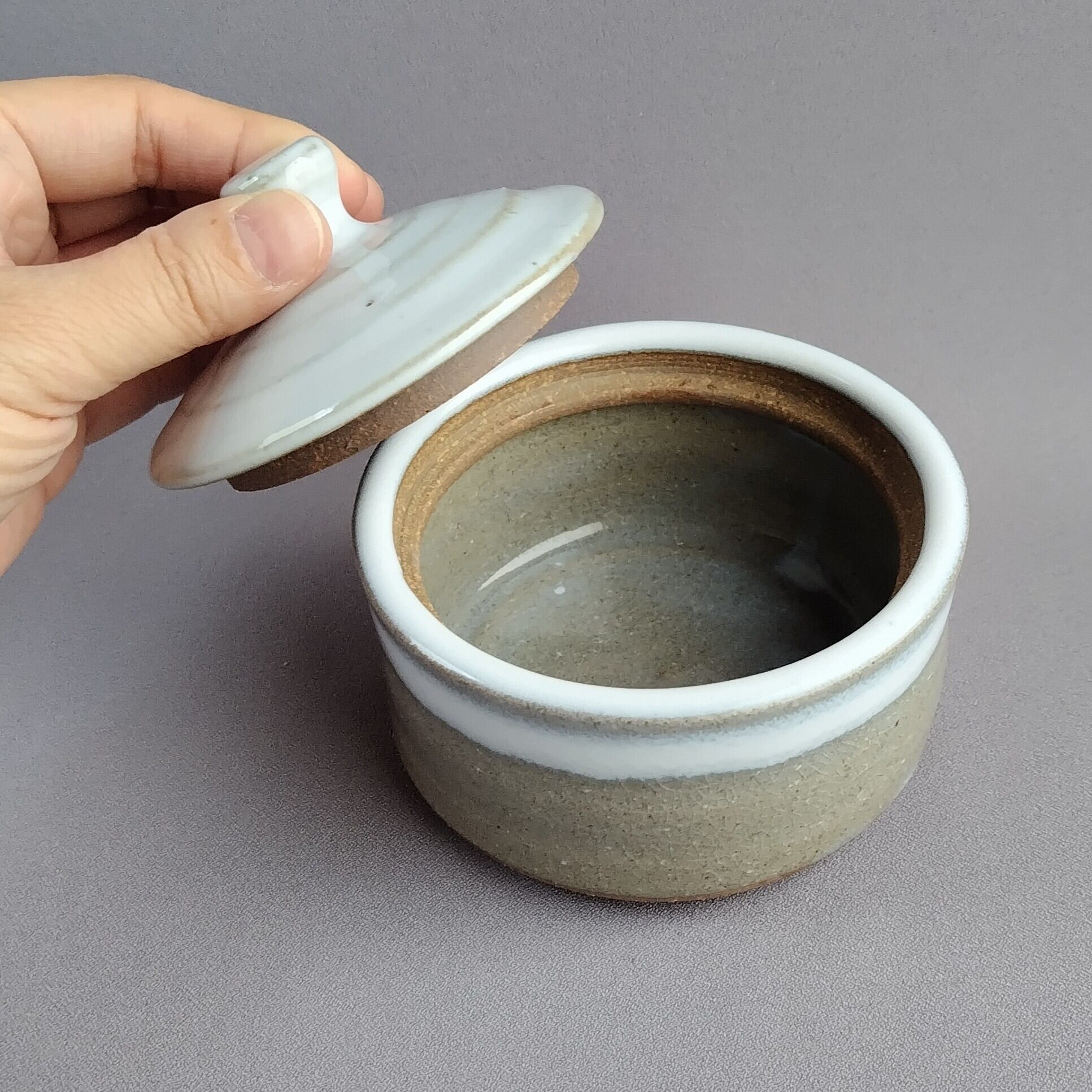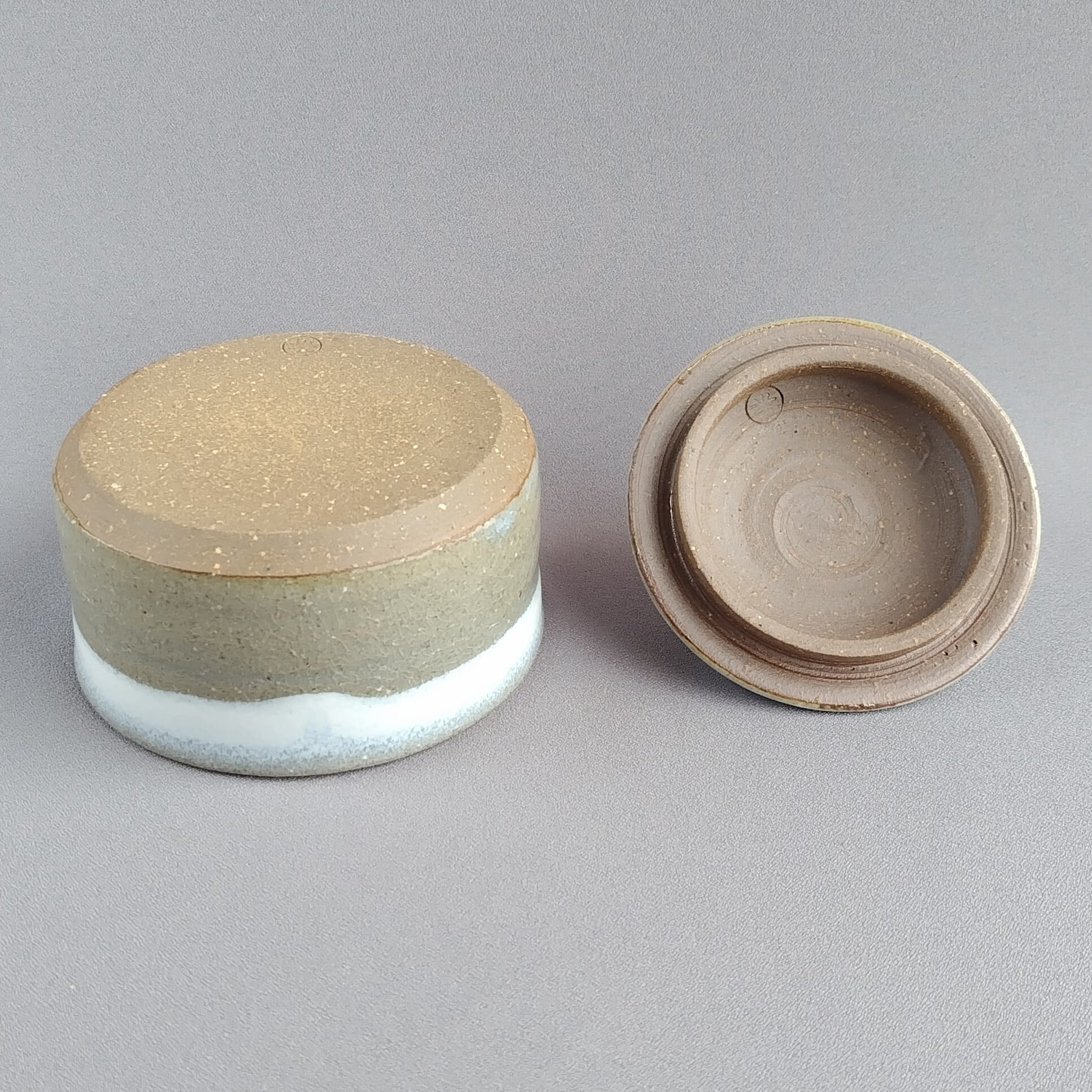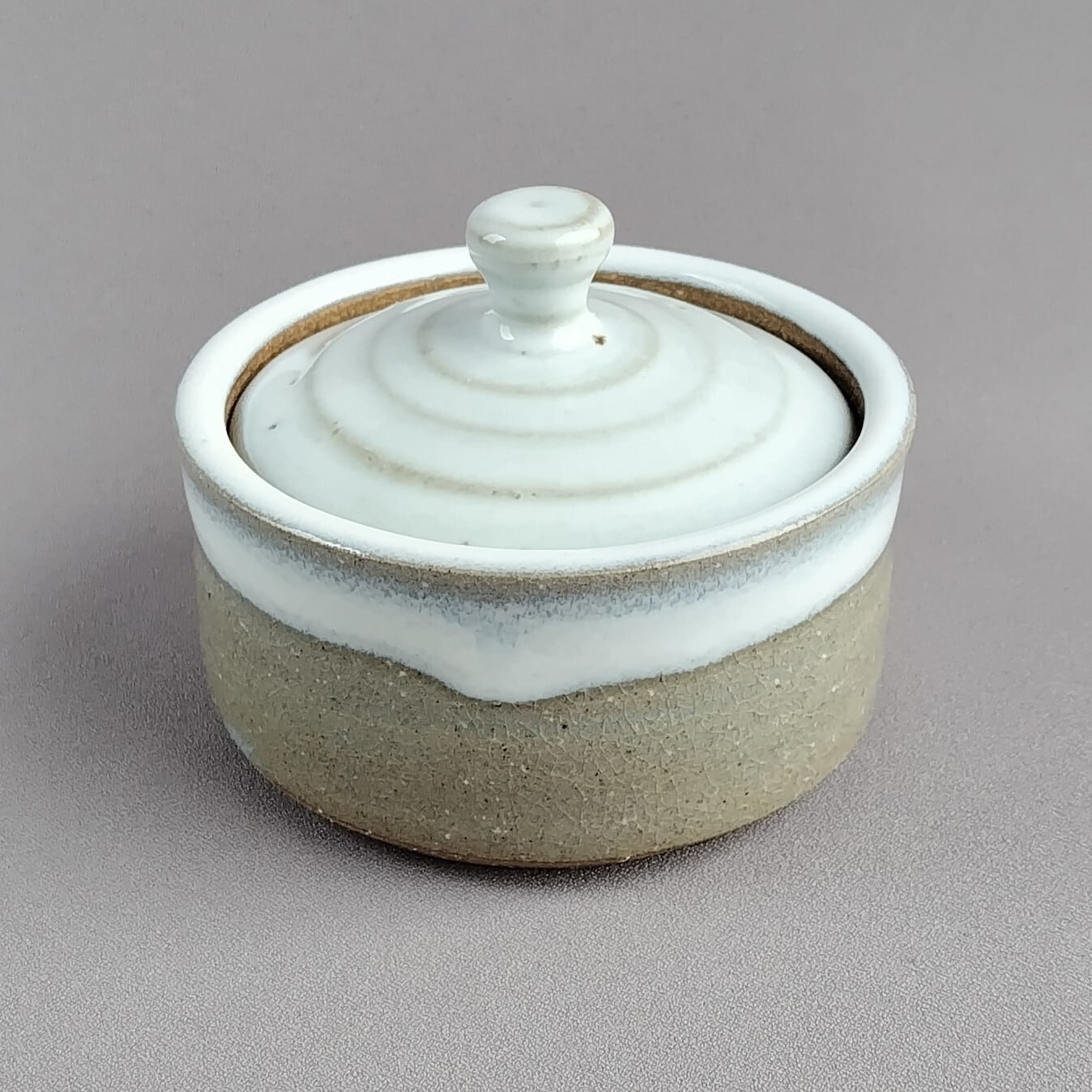 縁に白萩釉がかけられた蓋つきの入れ物です。