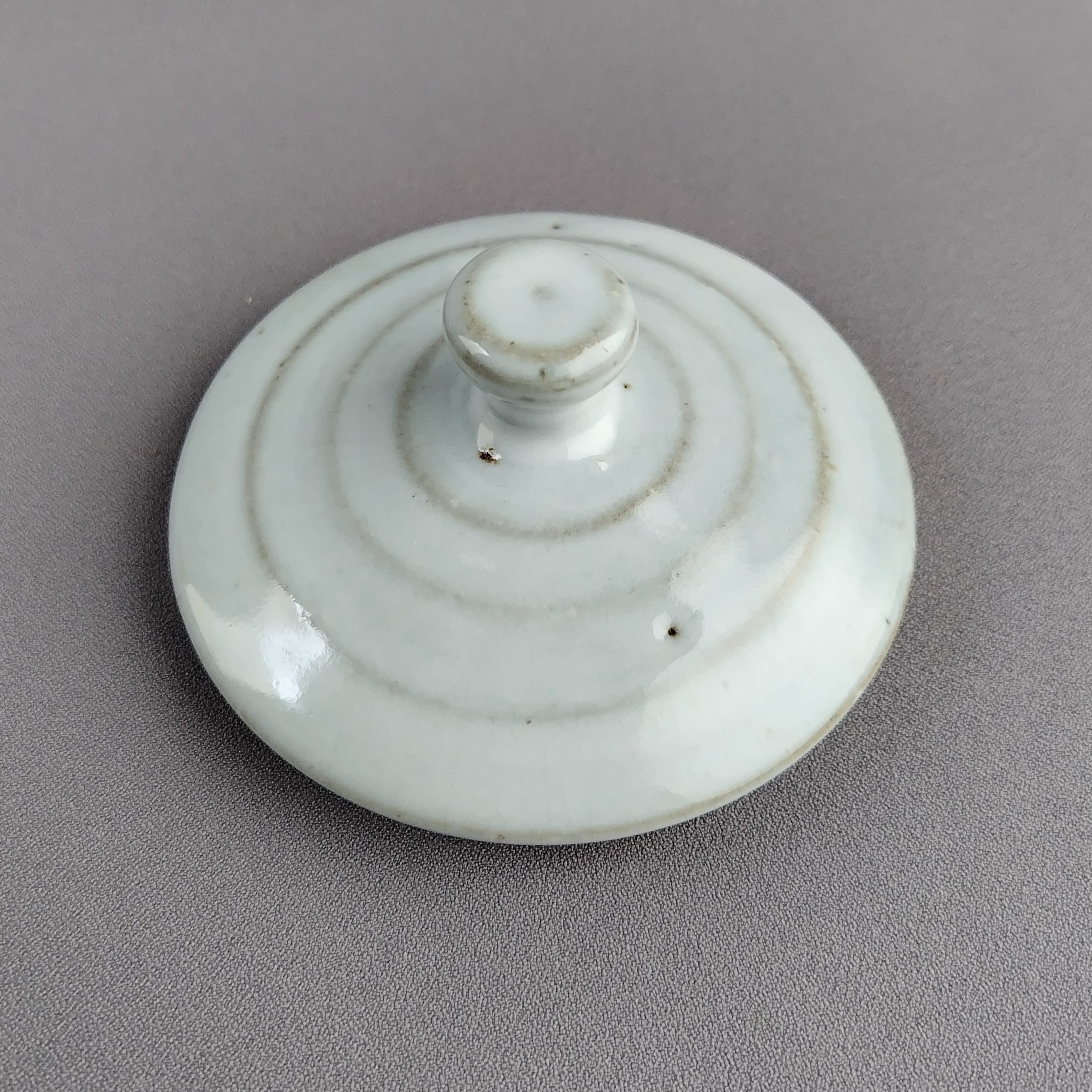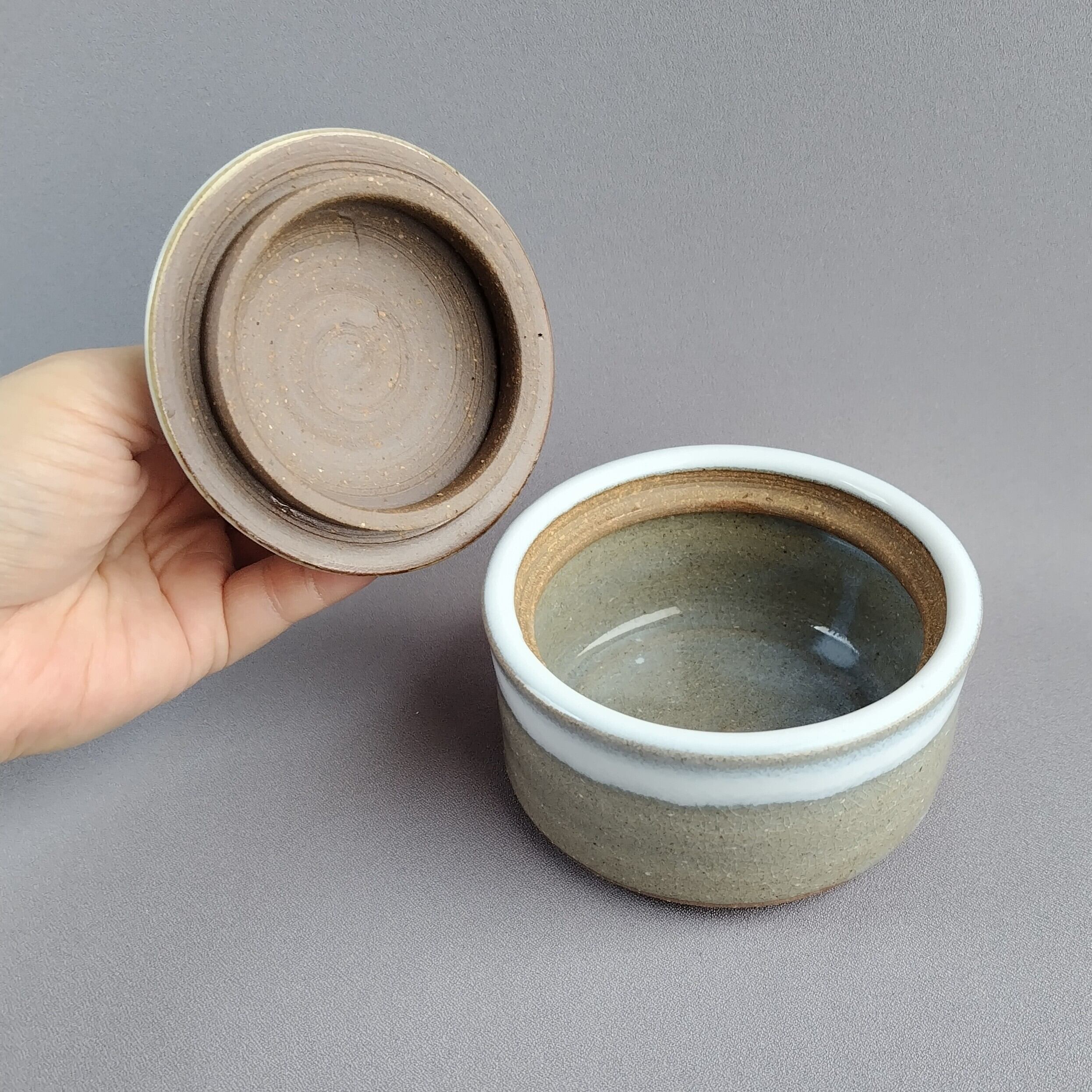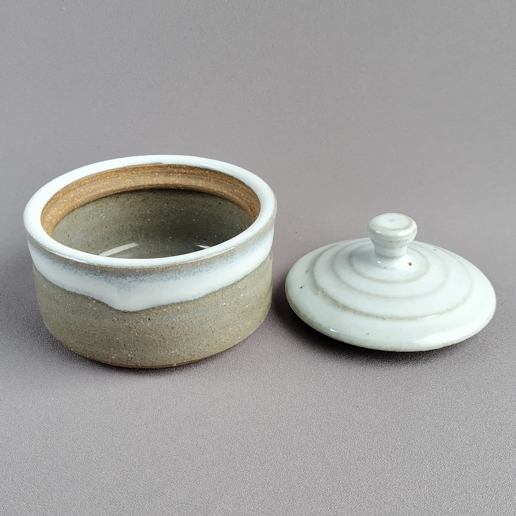縁に白萩釉がかけられた蓋つきの入れ物です。