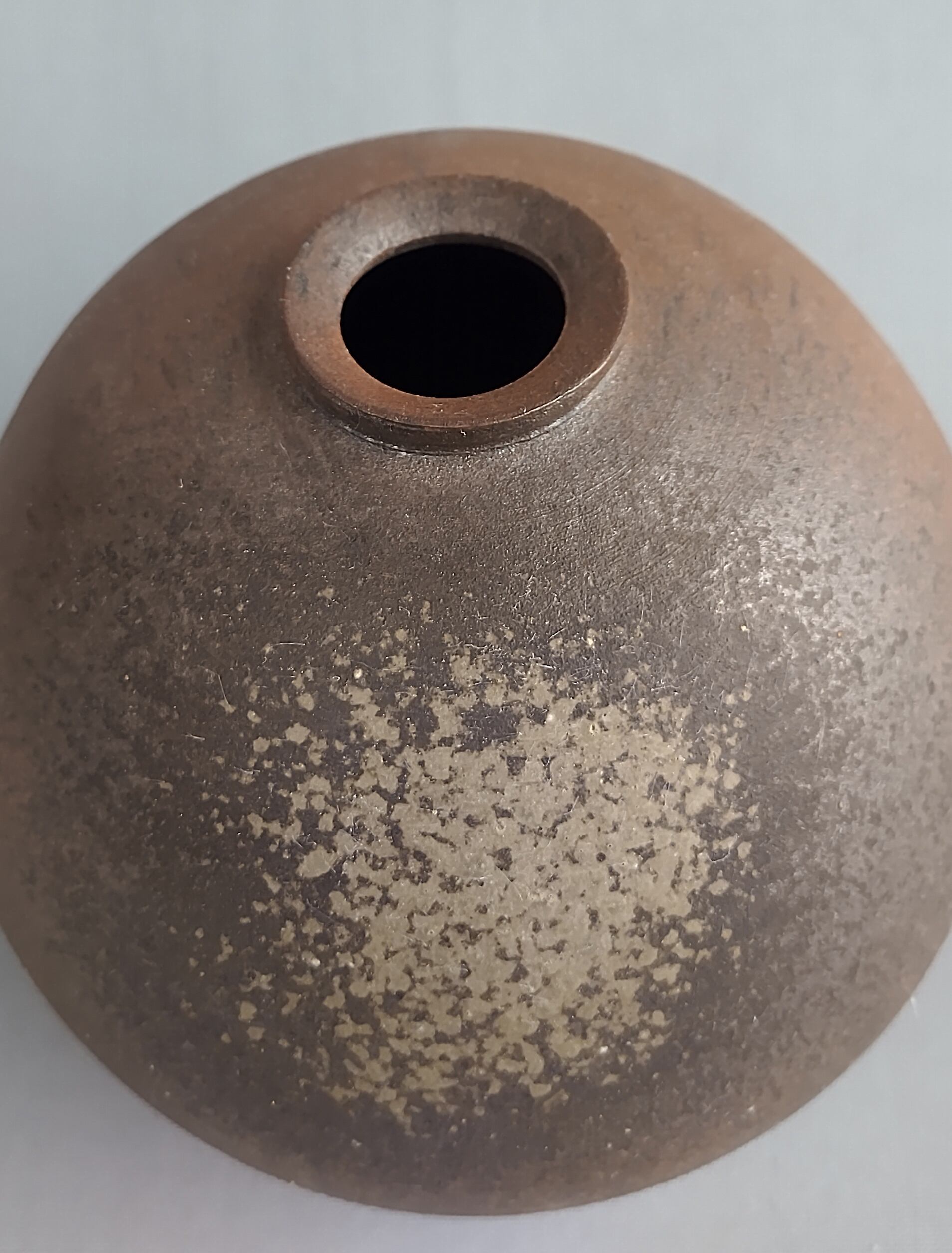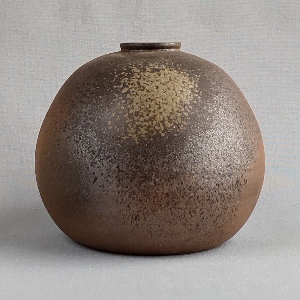 口が小さく、ぽってりとした安定感のある形の焼締めの花入れです。