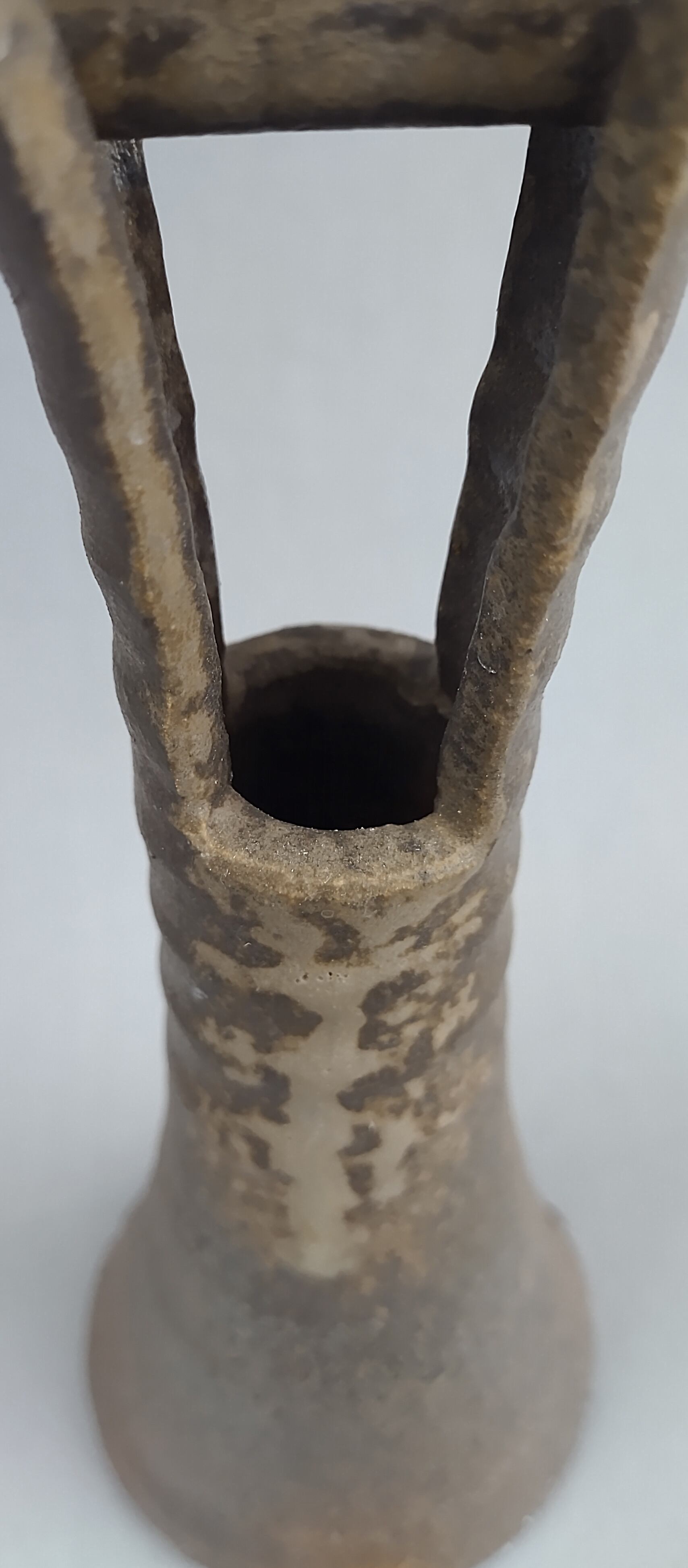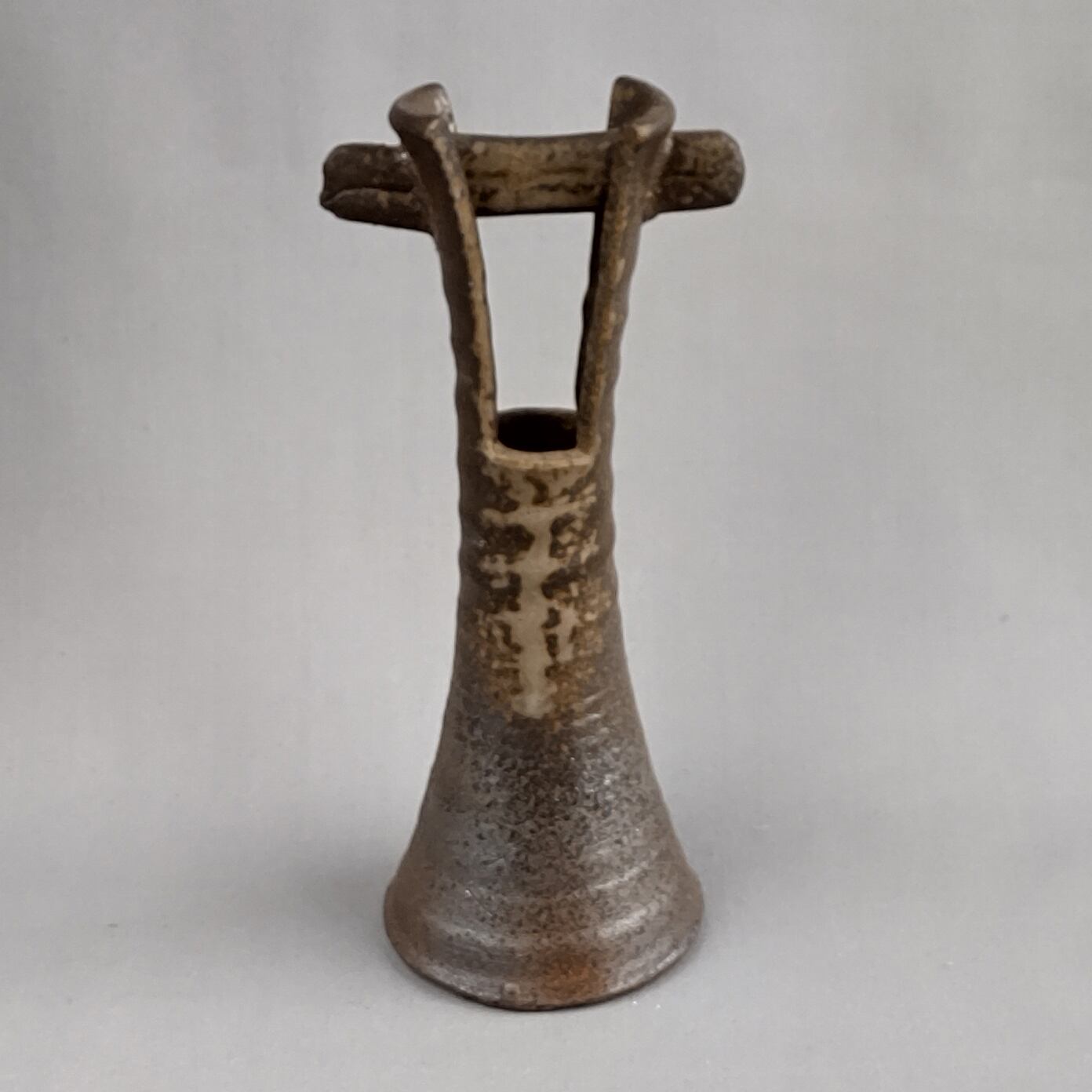 細長い手桶型で、一輪の花がとても映える焼締めの花入れです。