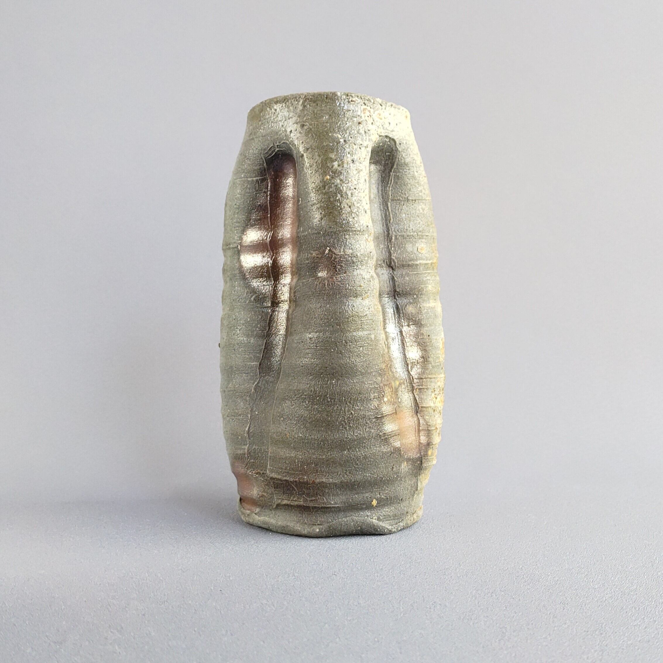側面に指押しで凹凸をつけた、窯変の焼締めの花入れです。