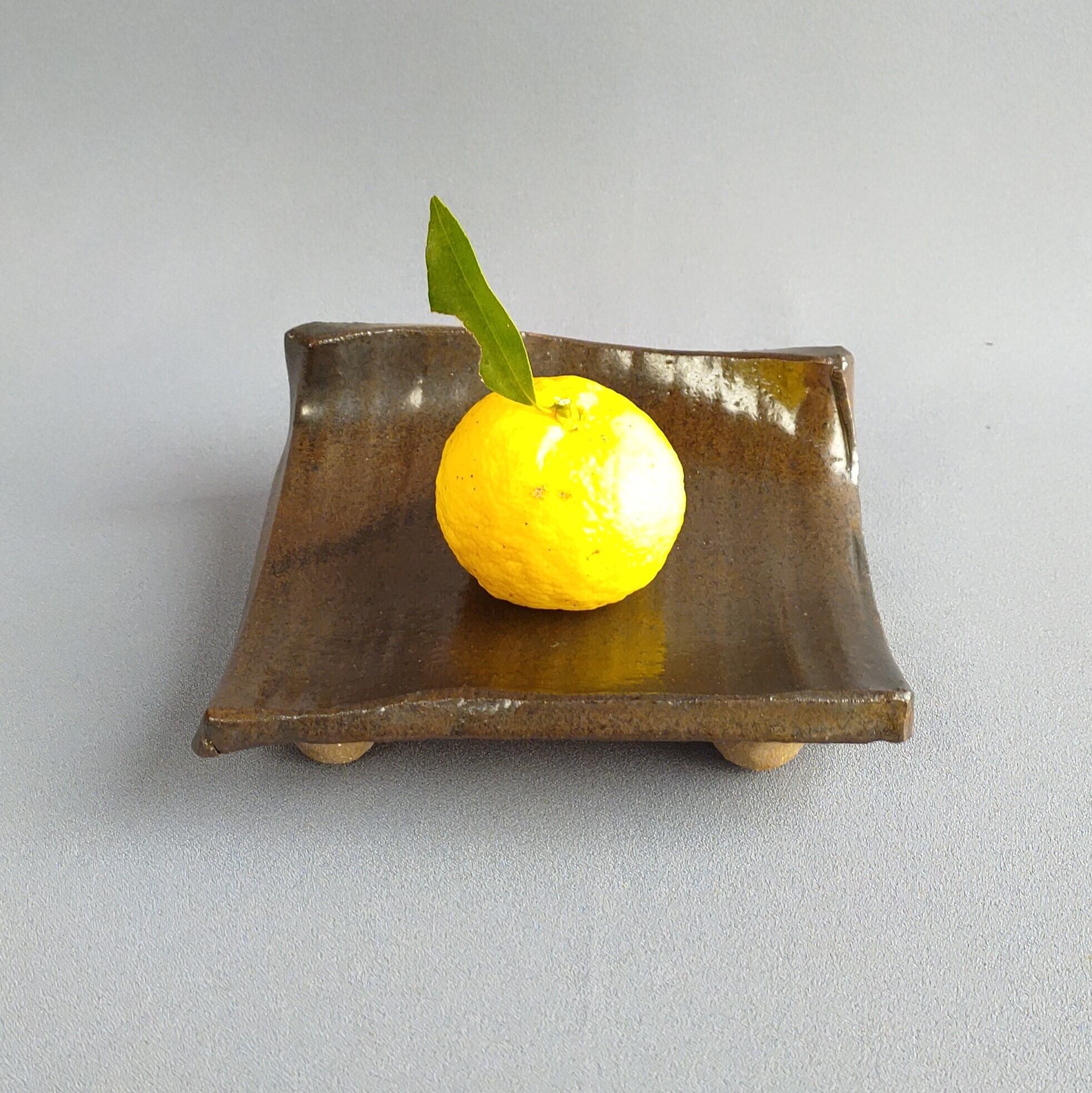 黒のマット釉が掛けられた、三点の足つき角板皿です。