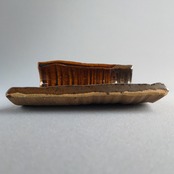 筒を一度ろくろで引き、縦に切って開いてあるため、ろくろ目の模様が出ています。