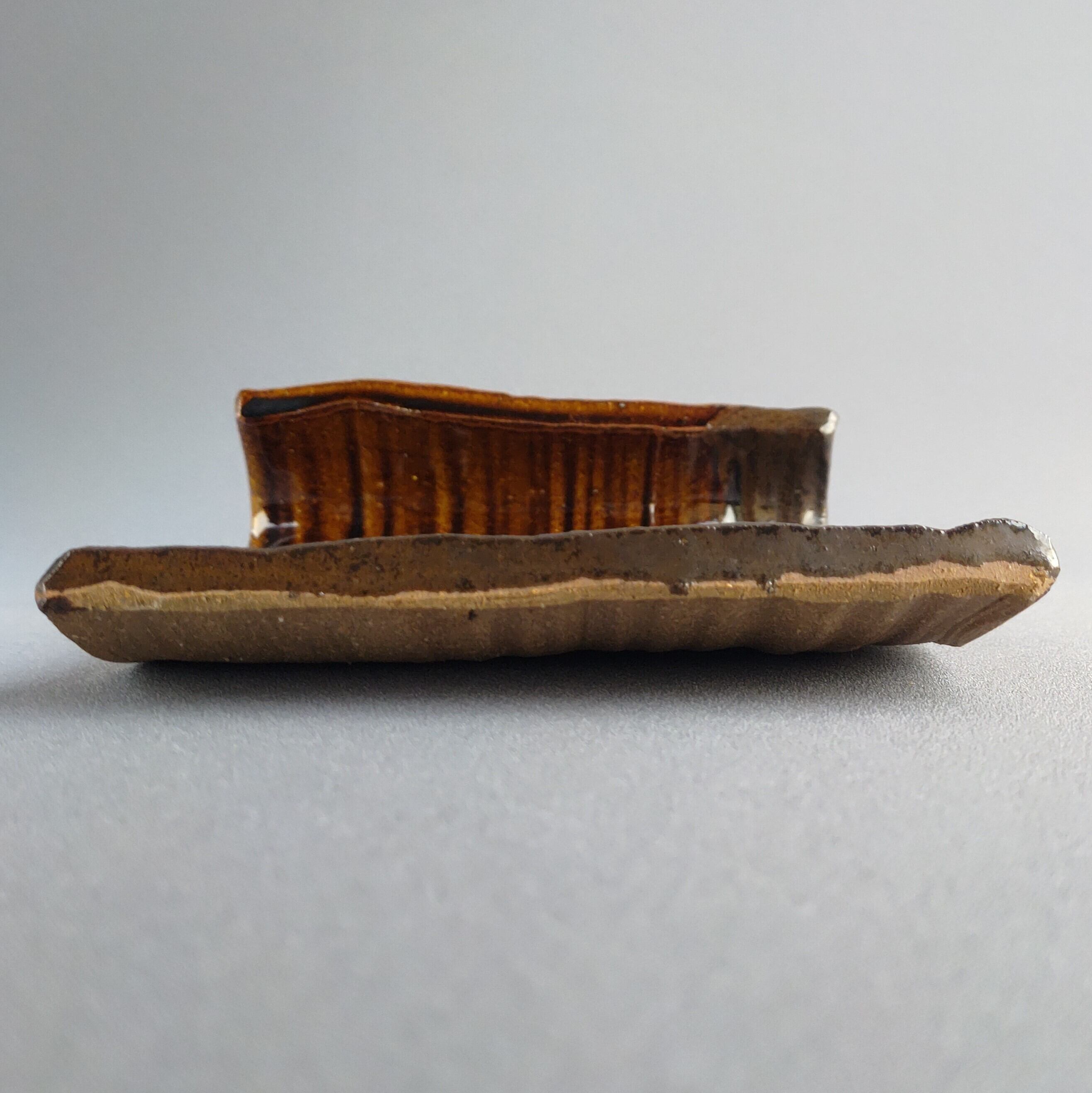 天目釉と黒のマット釉が掛けられた変形の角板皿です。