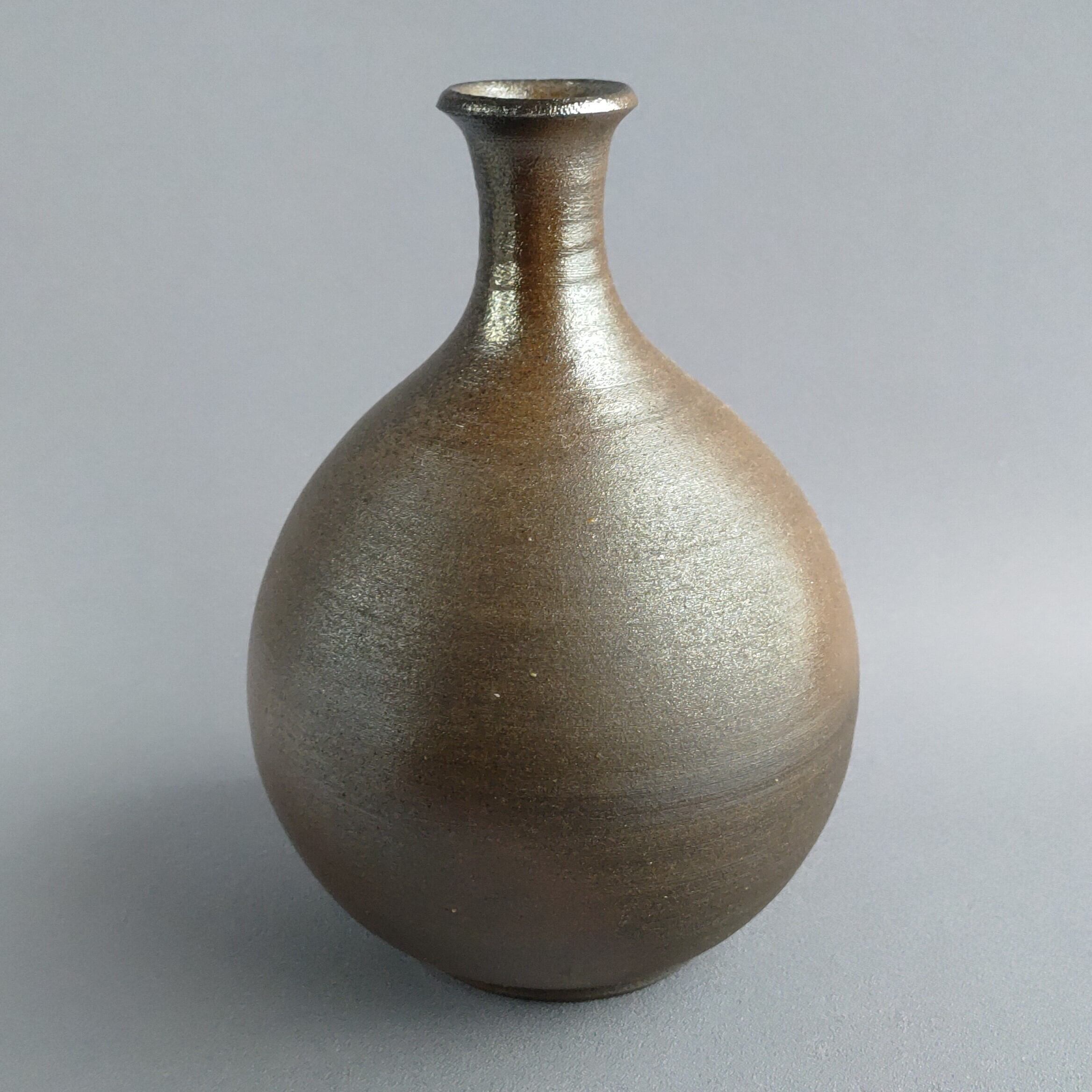 丸くどっしりした形の焼締めの花入れです。