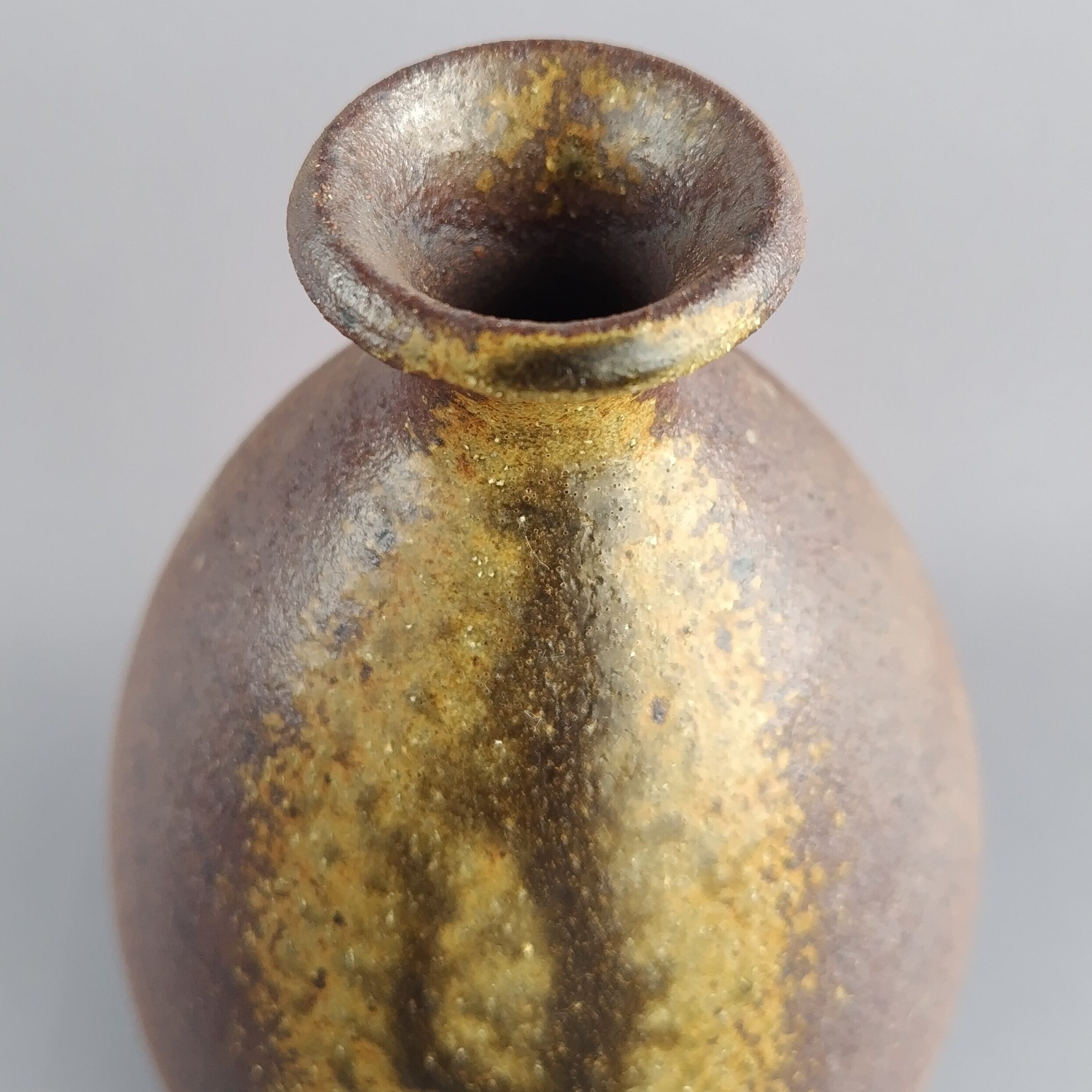 正面の流れた灰に趣の感じられる焼締めの花入れです。