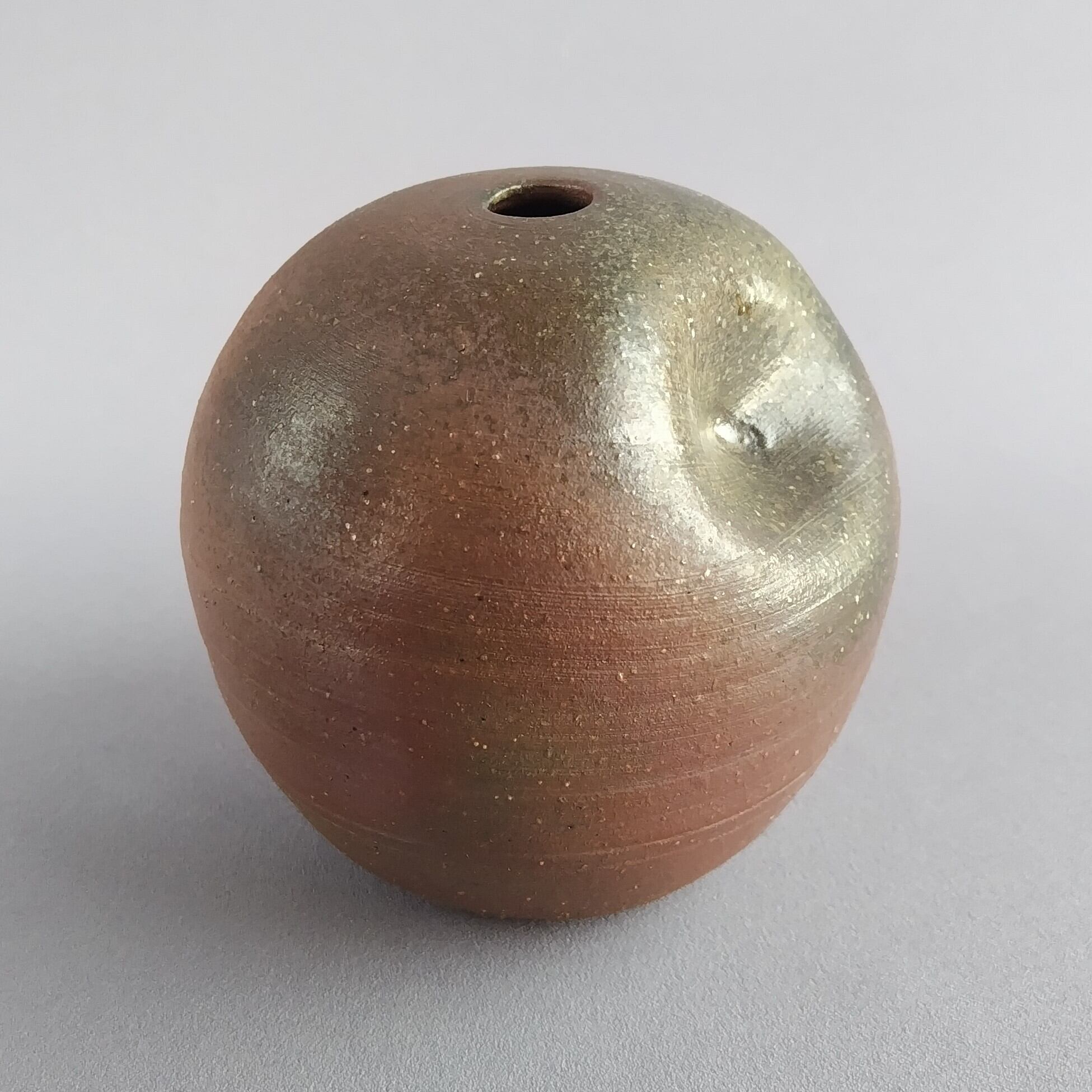 ころんとした形とえくぼがかわいらしい焼締めの花入れです。