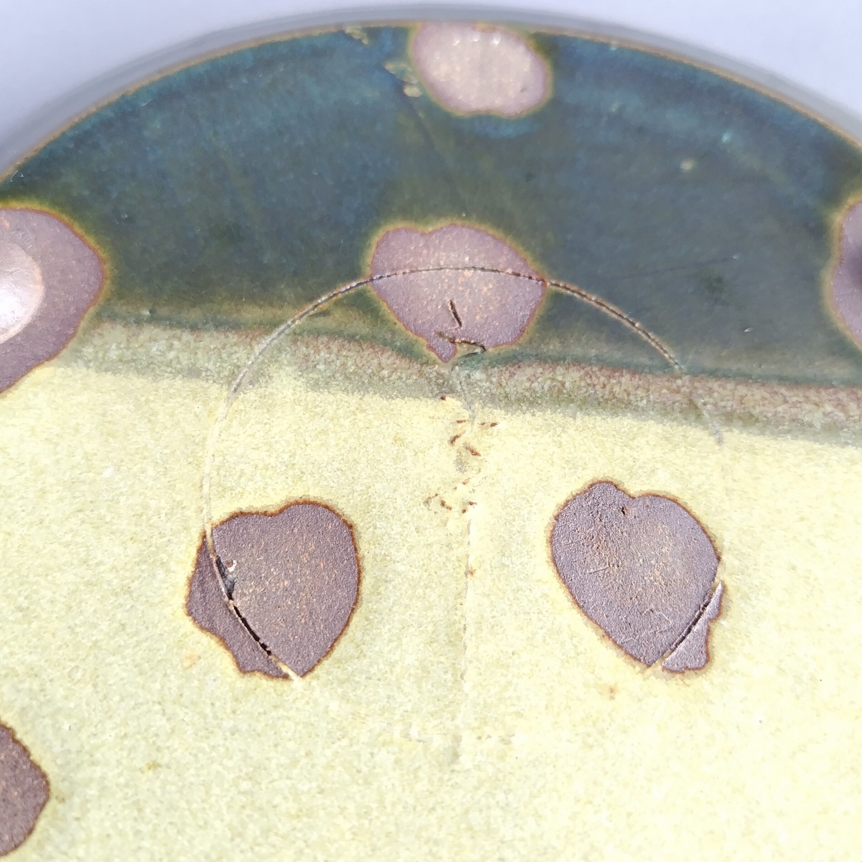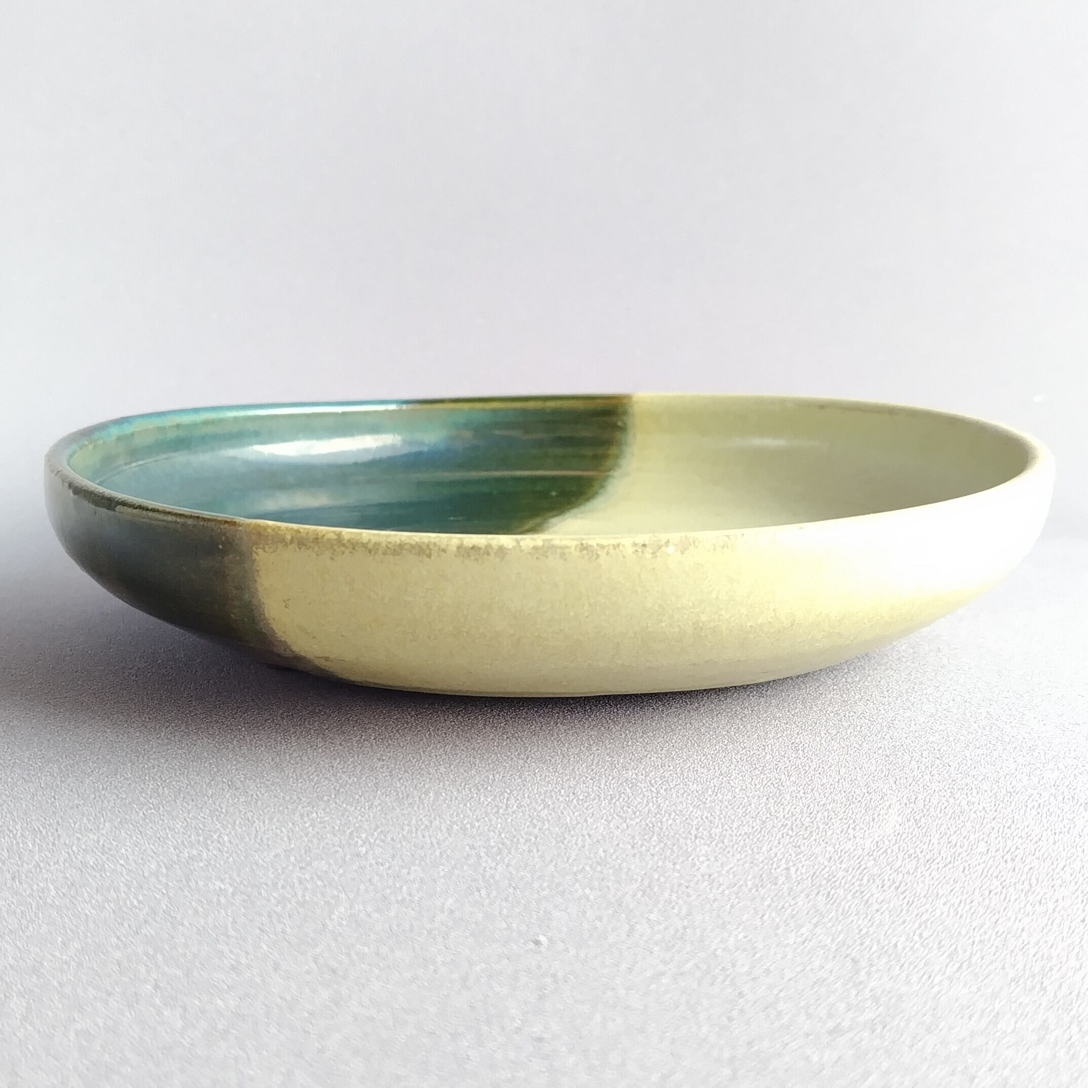 3点足の丸皿です。緑釉とクリームのマット釉の掛け分けが施されています。