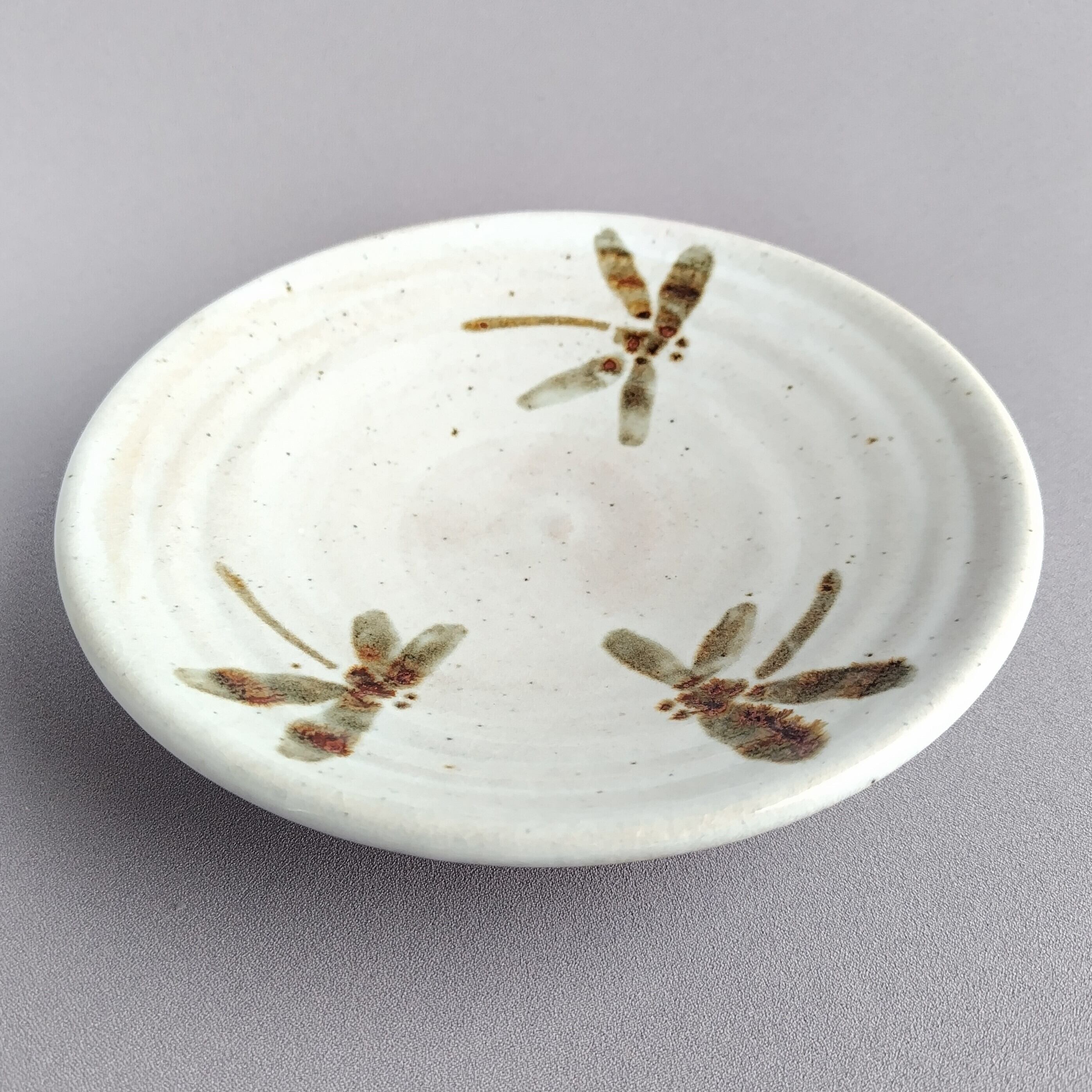 トンボの絵付けがされた丸皿です。鉄絵に白萩釉が掛けられています。