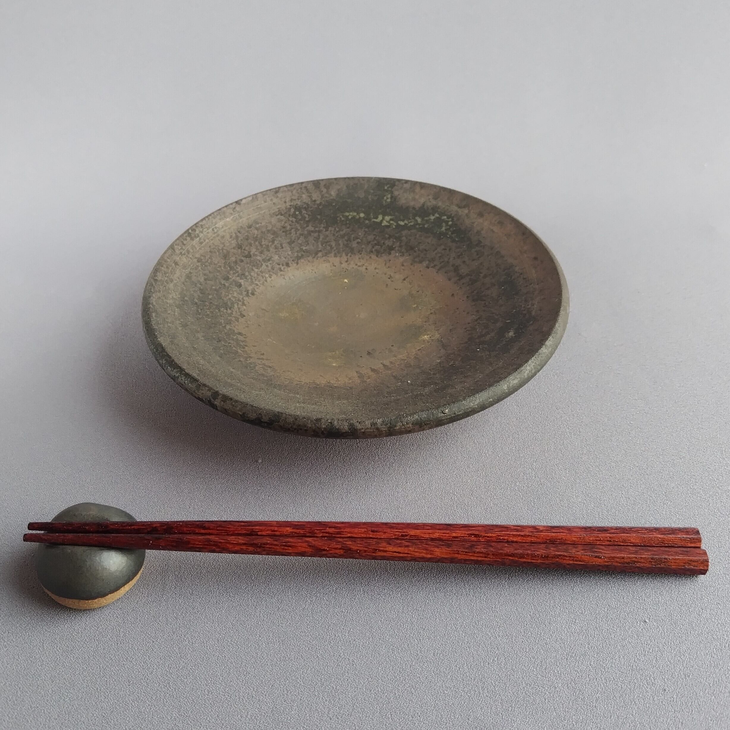 焼締めの丸皿です。縁が折り返してあり、重厚感があります。