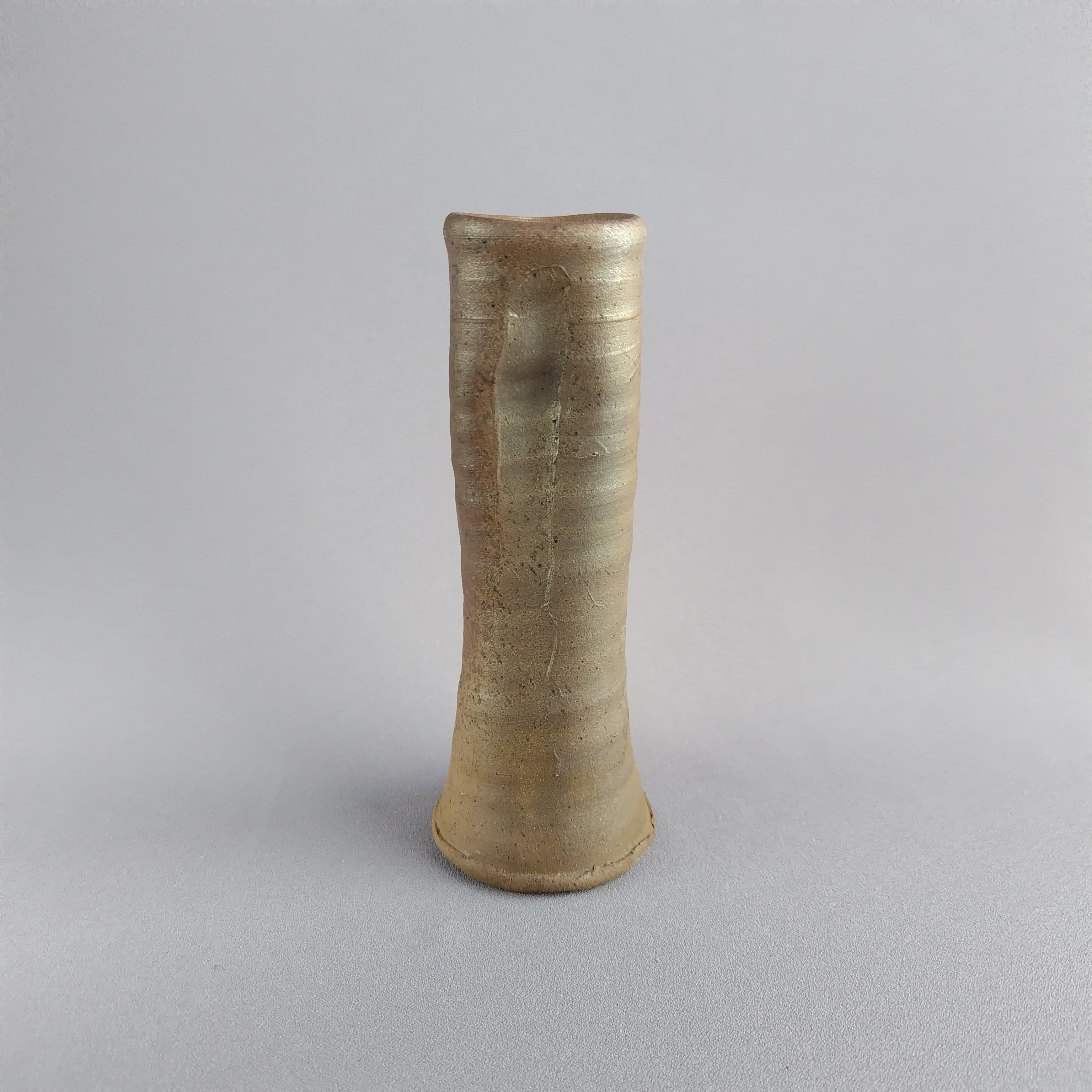 二方を指で押した、変形筒形の焼締めの花入れです。
