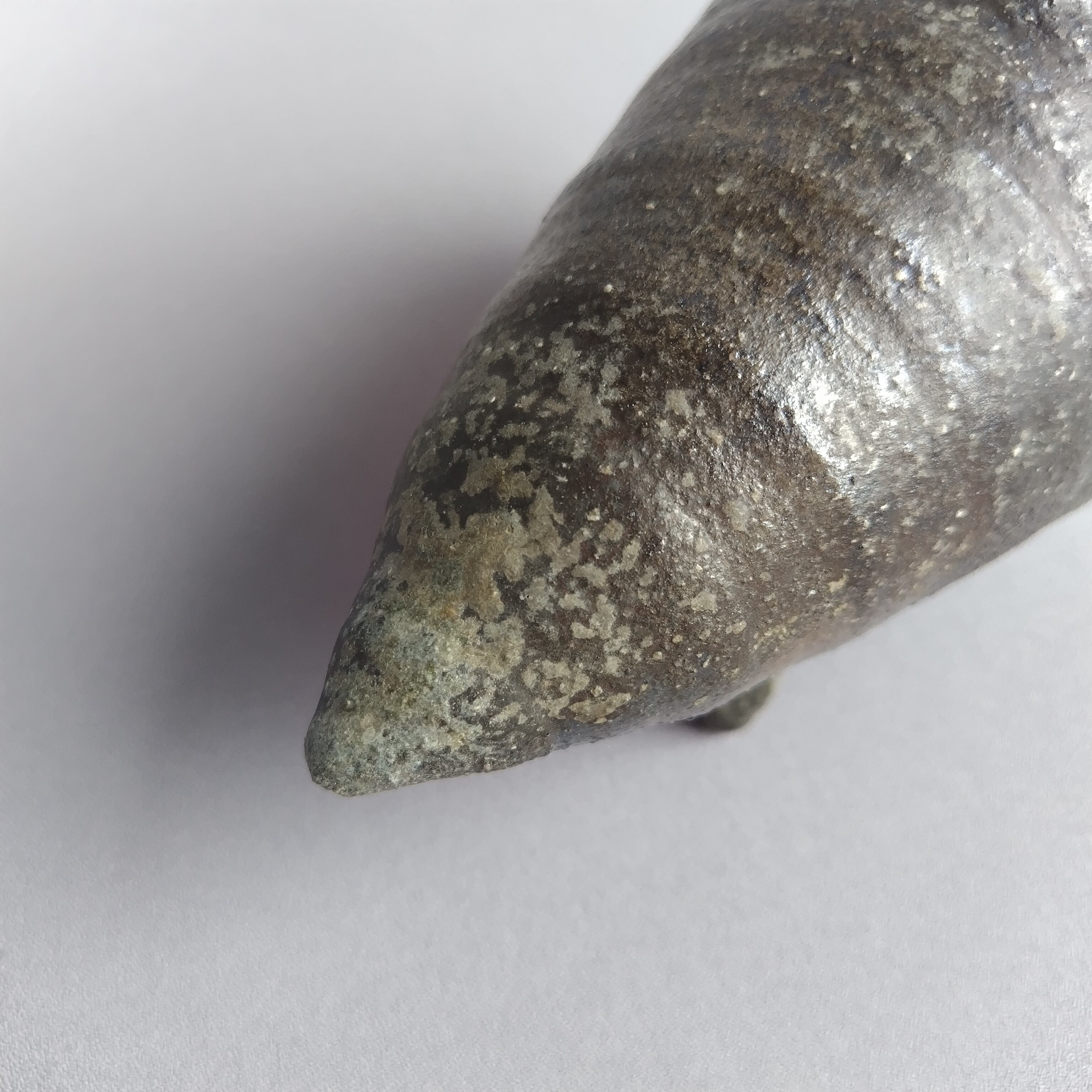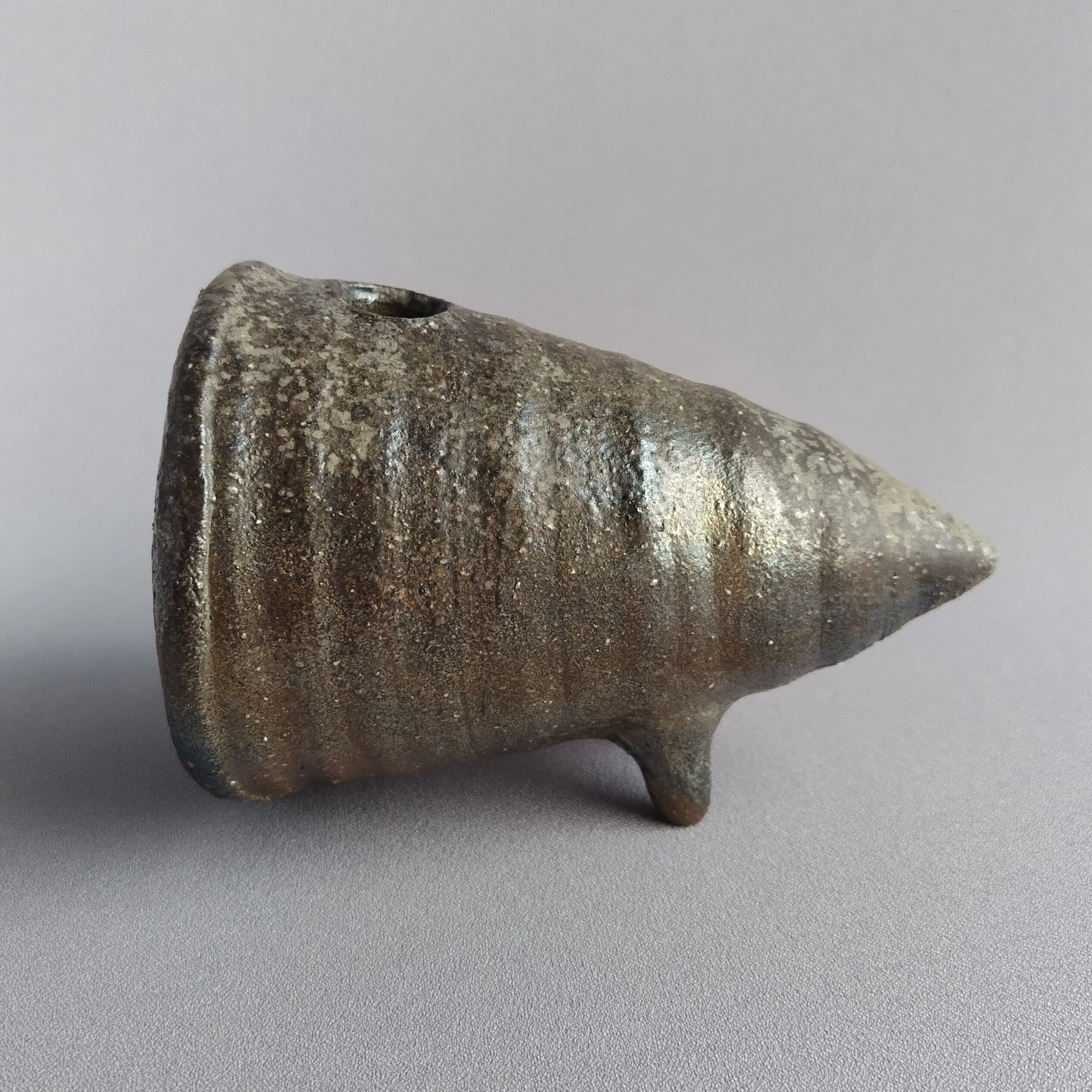 円錐を横にして足を付けた、かわいらしい形の焼締めの花入れです。